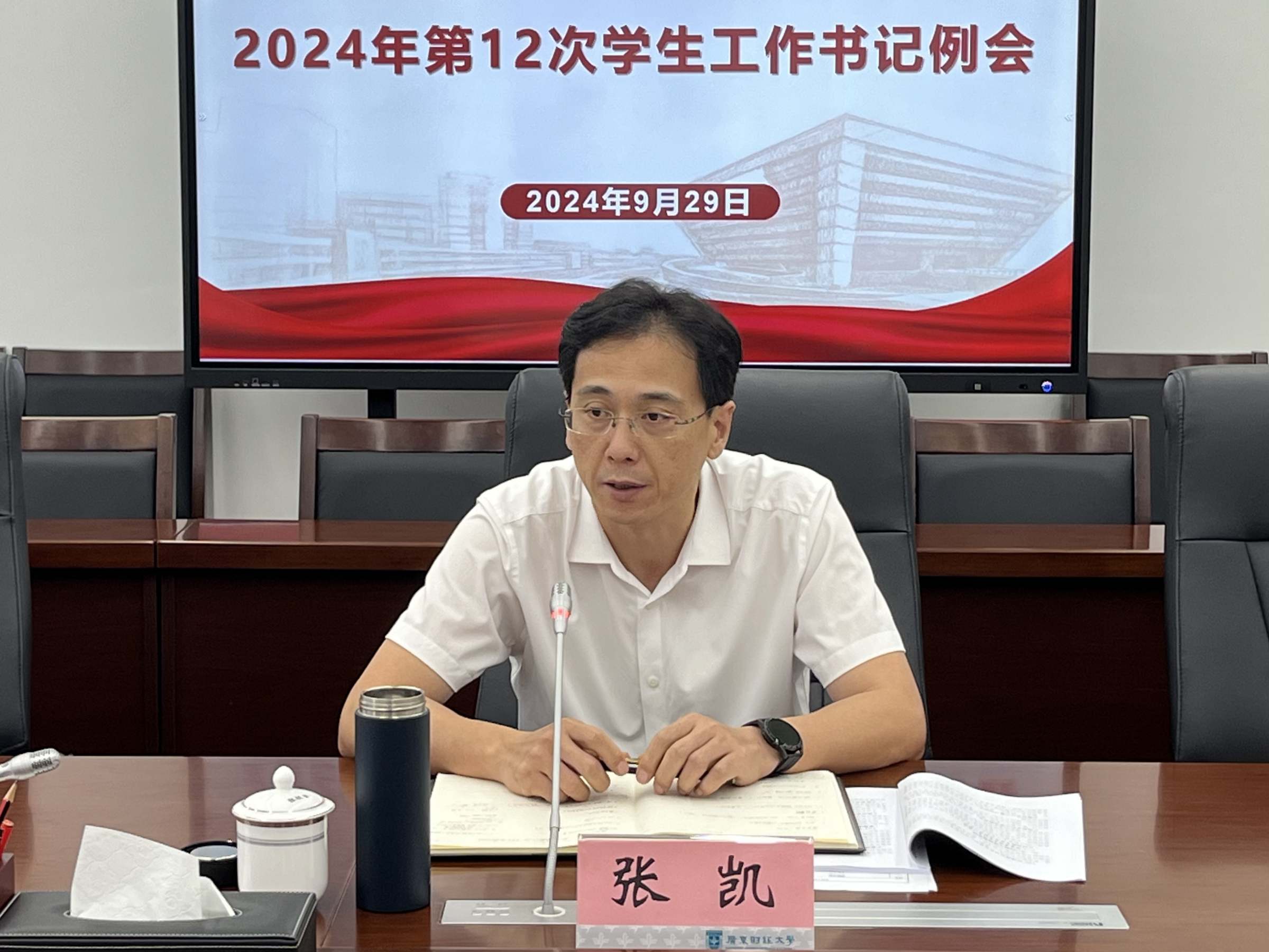 9月29日上午,我校2024年第12次学生工作书记例会在同德楼第一会议室召开,本次会议主题是学生安全工作。副校长张凯、各相关部门负责人及各学院学生工作书记与会,会议由学工部部长苏明华主持。