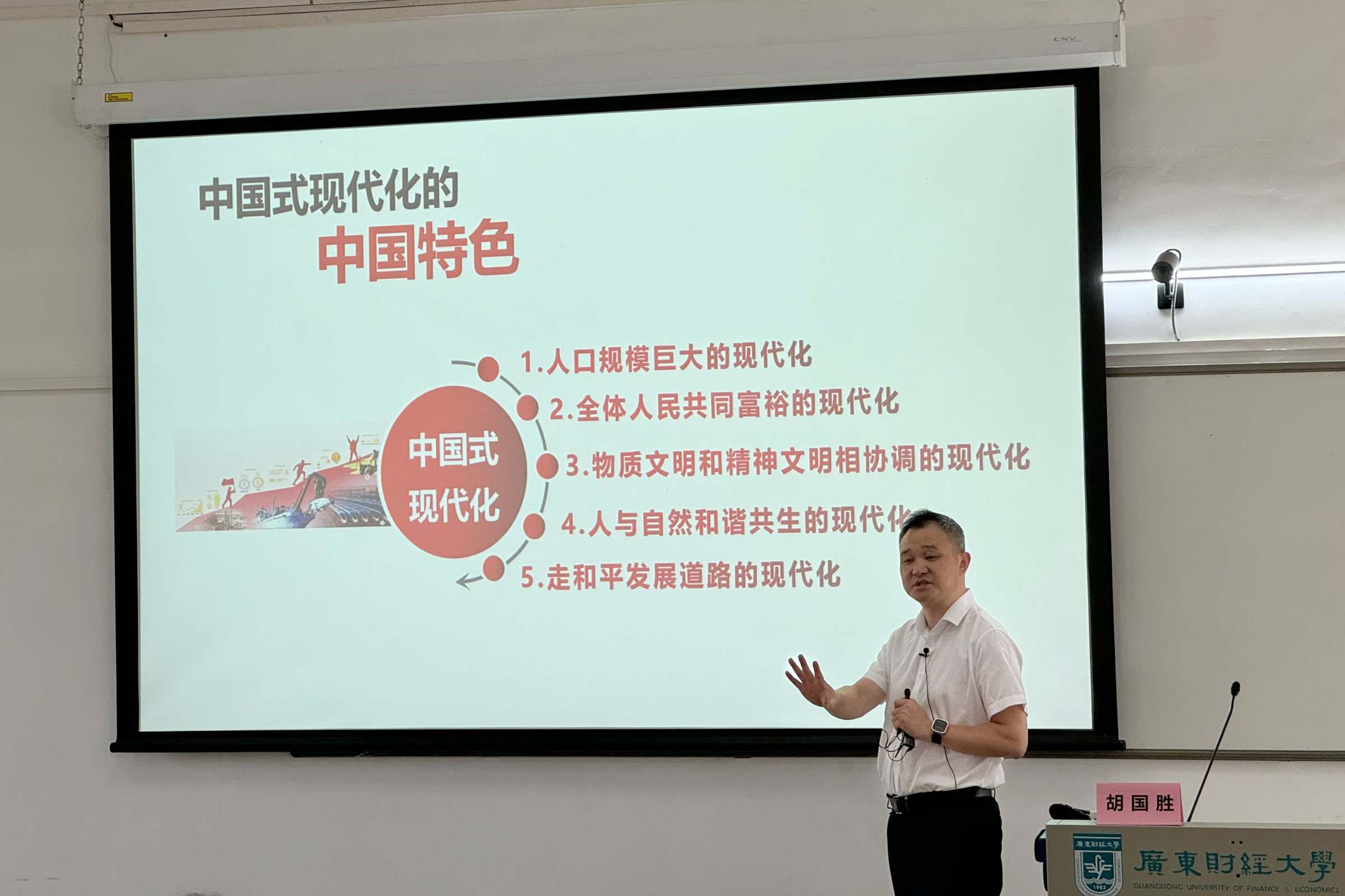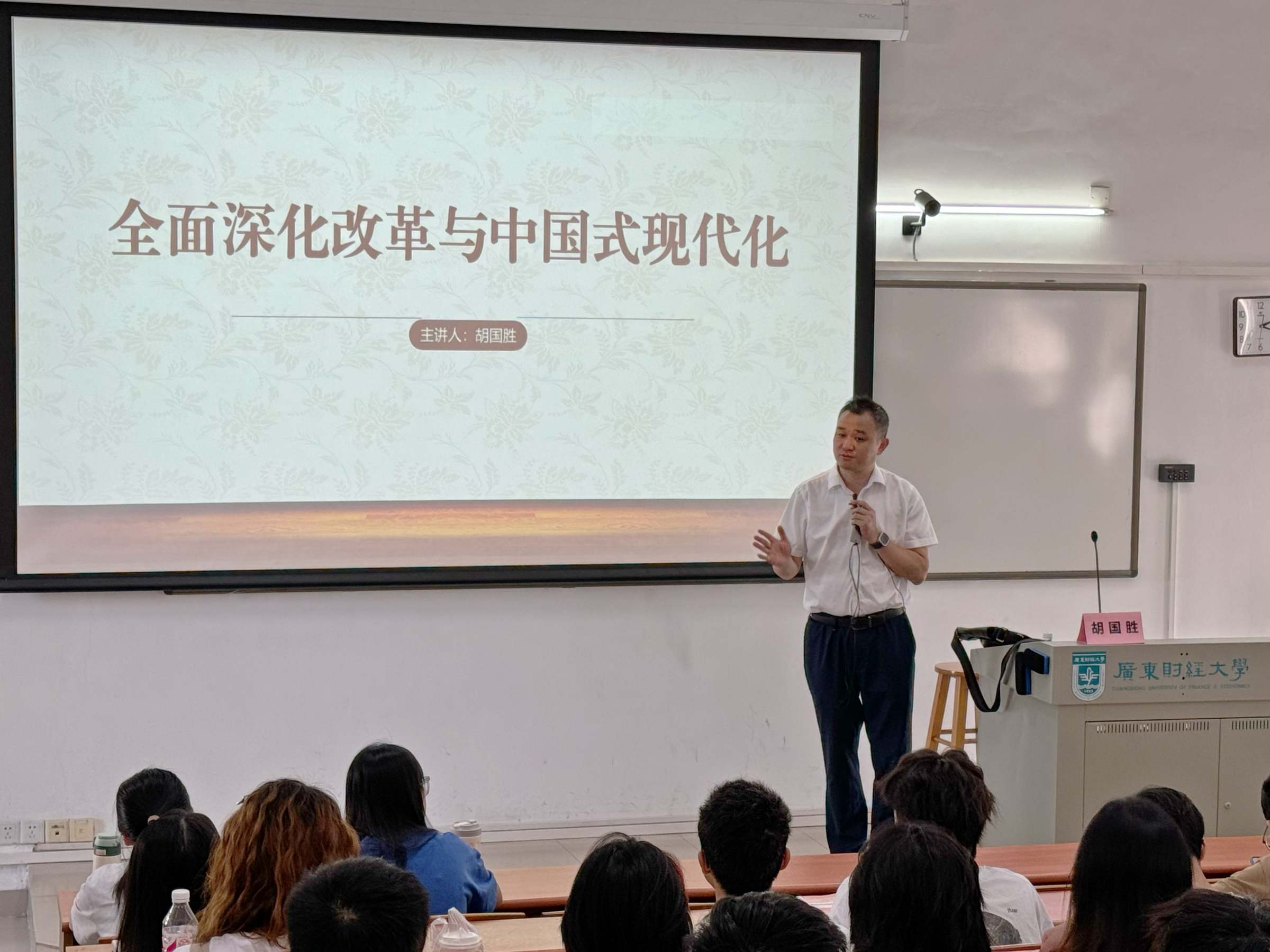 为深入推进党的二十届三中全会精神进校园、进课堂,10月8日上午,华南师范大学马克思主义学院党委书记、广东省党的建设研究院副院长、广东省科学社会主义学会副会长胡国胜教授,做客《习近平新时代中国特色社会主义思想概论》名师大讲堂,为2023级翻译1班、2023级环境设计1-2班共120余名本科学生专题讲授“全面深化改革与中国式现代化”。马克思主义学院副院长孙晓晖教授主持课堂,学院党委书记张小洁、任课老师乔良列席课堂。