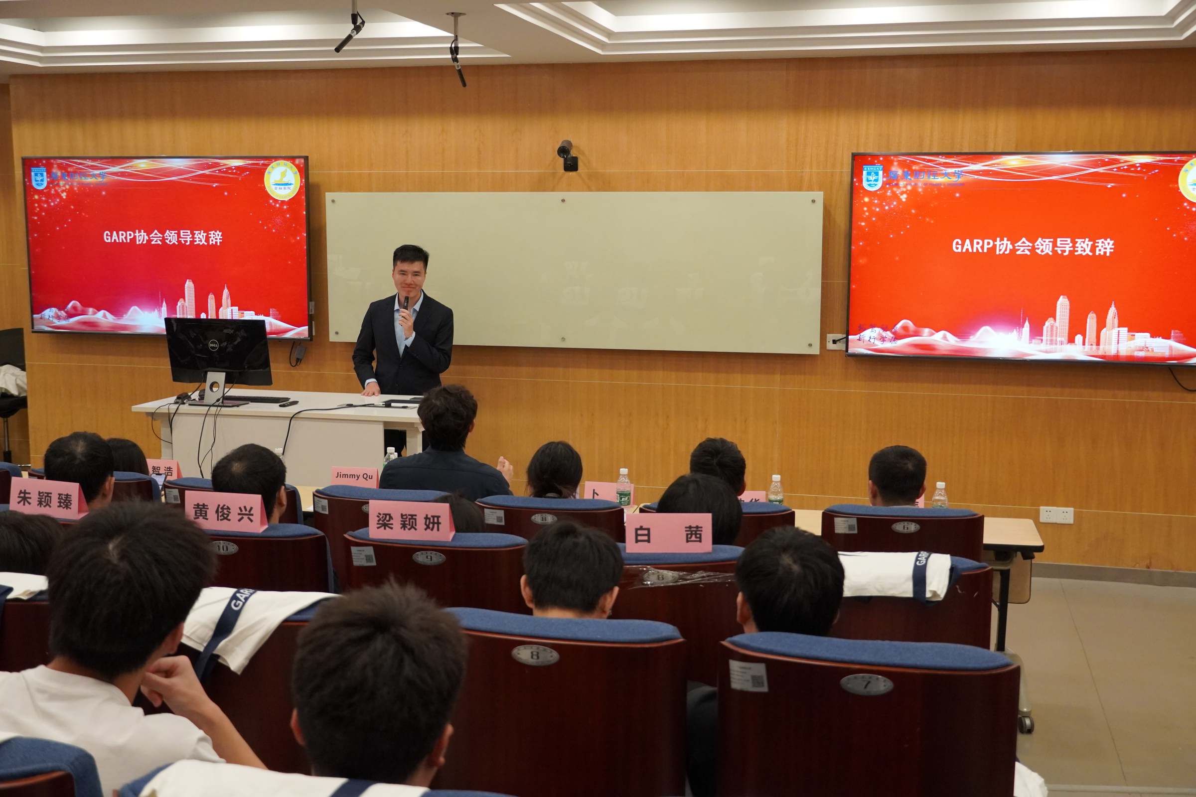 在开幕式环节,蔡卫星院长向参会嘉宾介绍了我校金融学院发展情况,回顾了学院与GARP协会以及FRM项目合作历程,并从共同开展金融风险管理科学研究、共同推进金融风险管理智库建设、共同打造FRM湾区生态体系等方面进行了展望。Jimmy Qu代表GARP协会致辞,系统介绍了GARP协会以及FRM、SCR、RAI等证书发展情况,对金融学院获得GARP学术合作伙伴(GARP Academic Partnership)以及学院学生获得GARP学术合作伙伴奖学金(GARP’s Academic Partnership Program Scholarship)表示热烈祝贺,期待双方进一步推进落实后续合作领域。