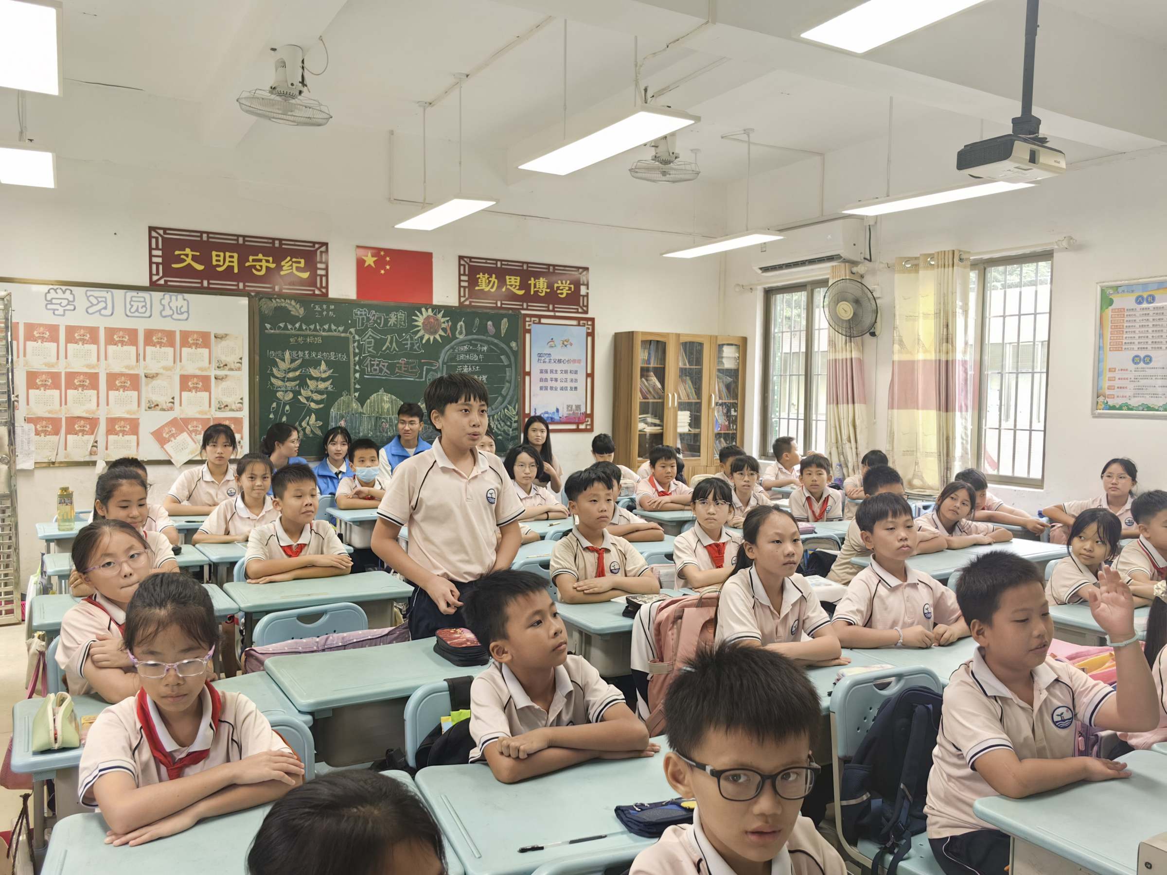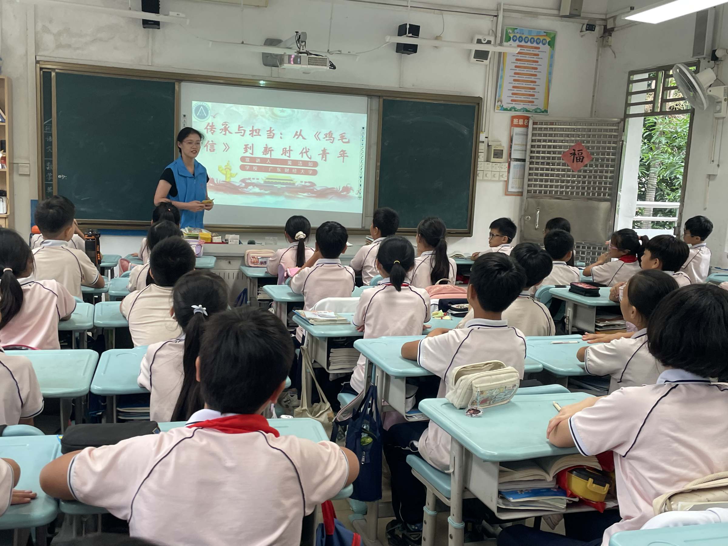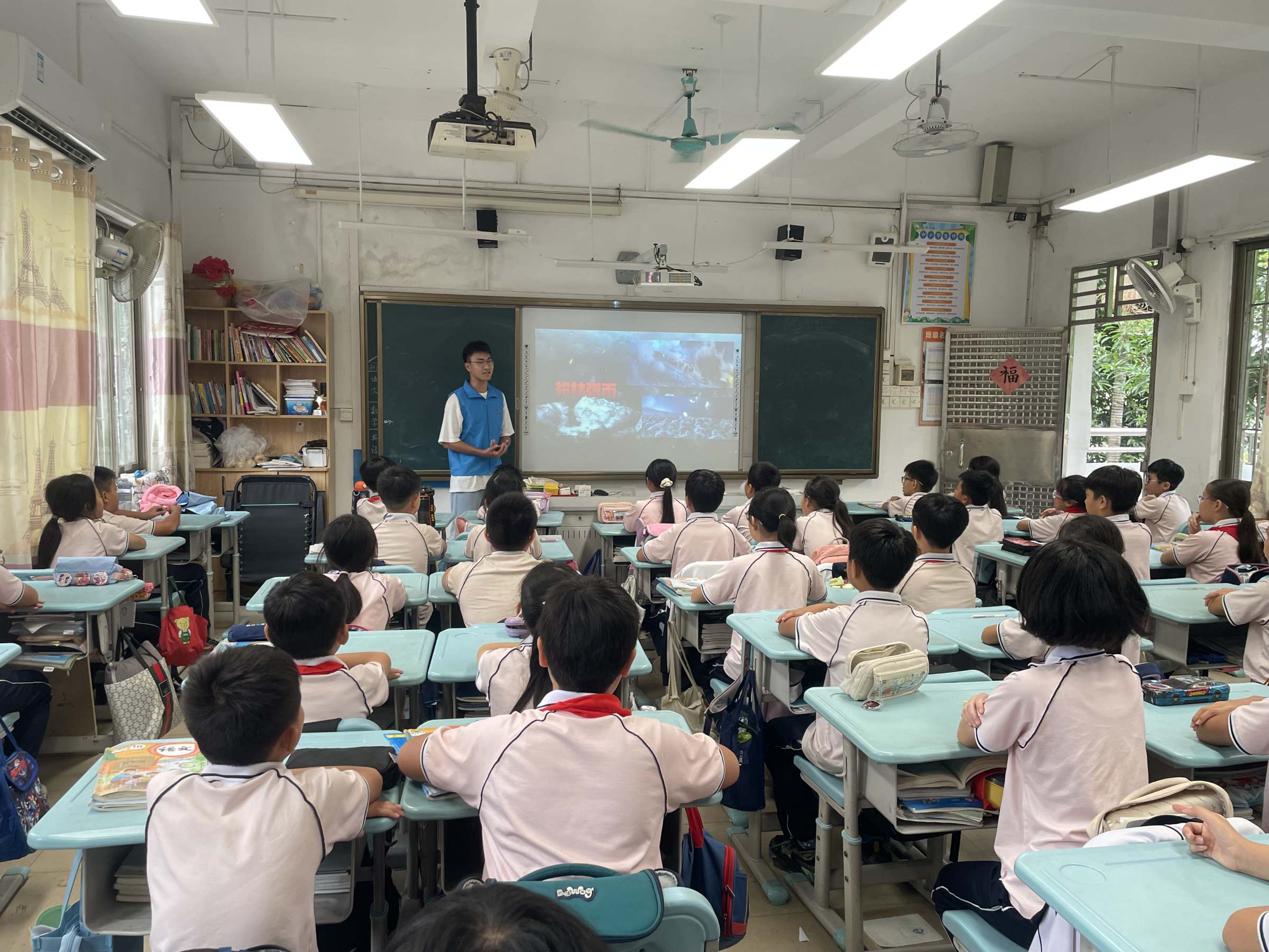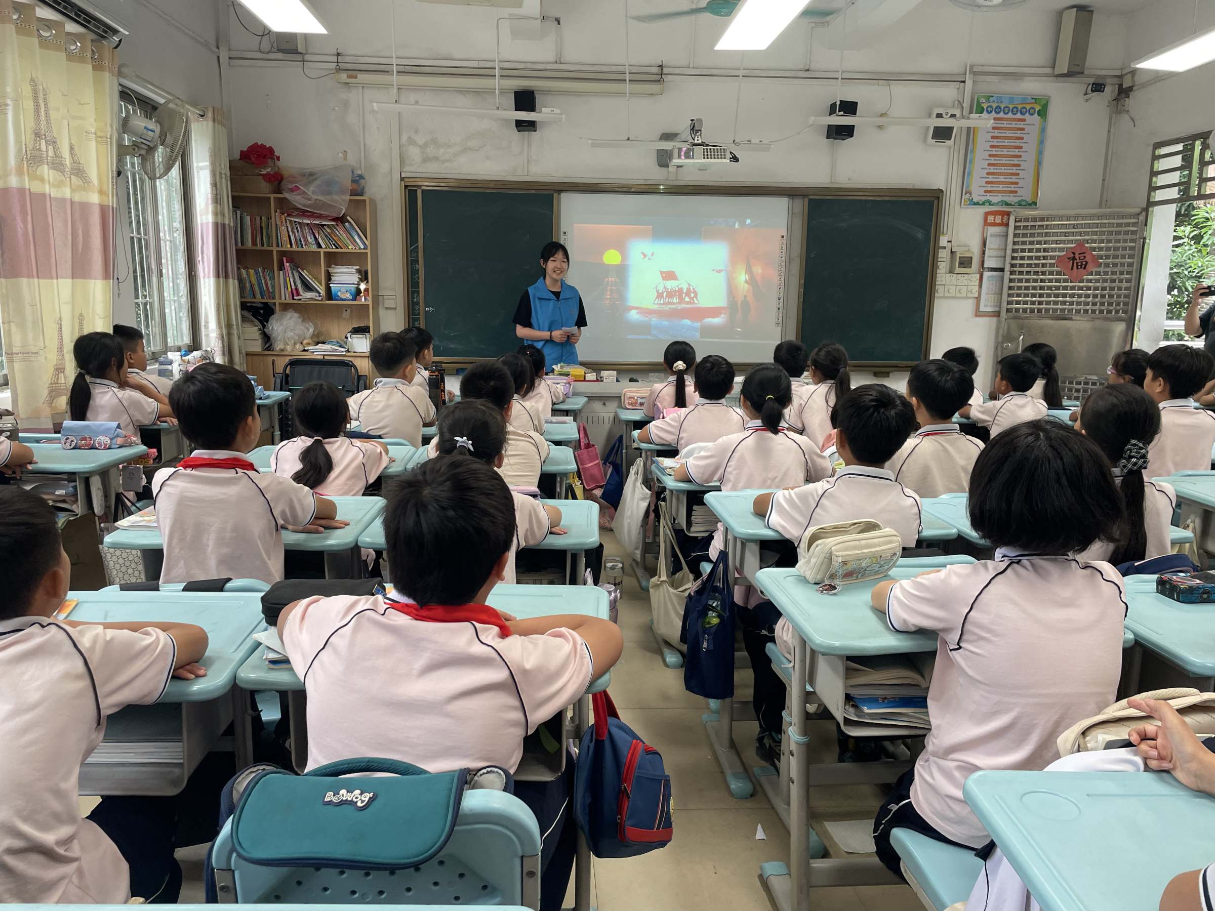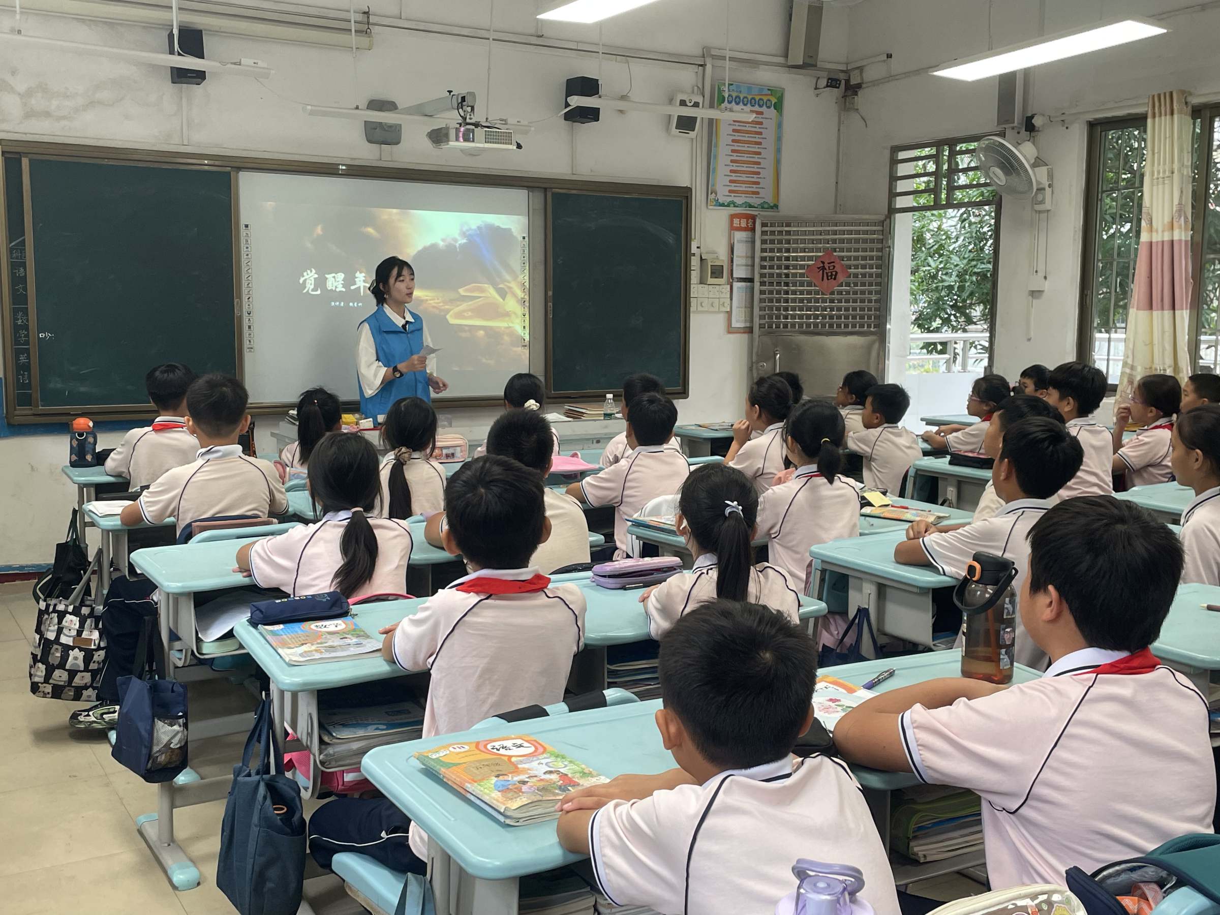 10月15日,数字经济学院“沁湖宣讲团”走进佛山市三水区宝月小学,开展了一场别具一格的经典主题宣讲活动,这是“沁湖宣讲团”第一次走进中小学校。此次活动由教师陈政党带队,4位宣讲员依次围绕《觉醒年代》、《长津湖》、《鸡毛信》以及《把最后一颗子弹留给自己》四个主题展开深刻阐述。宣讲员们以生动的讲述与充沛的情感,将学生们带入历史的长河,启迪他们深刻领悟革命先烈的伟大精神。