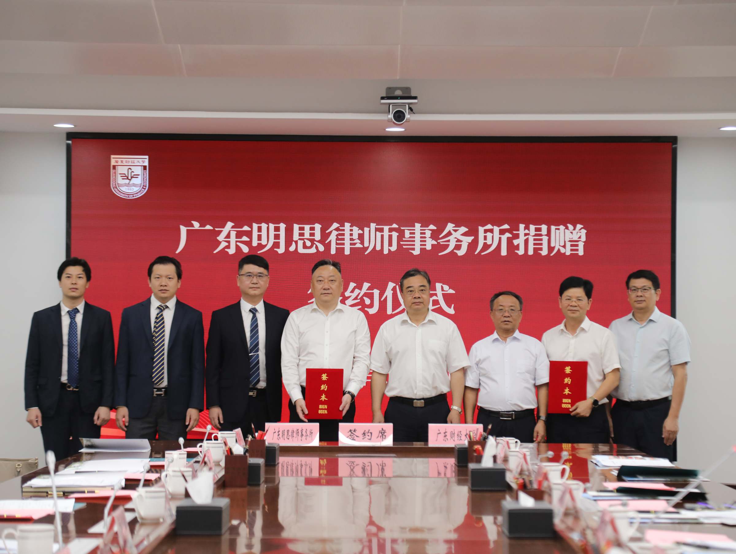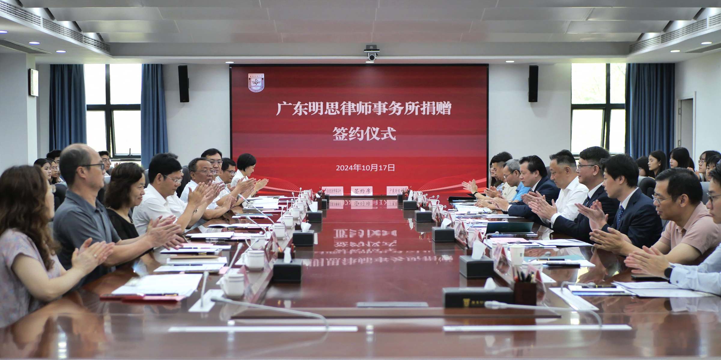 10月17日,广东明思律师事务所主任方昀博士代表律所向我校捐赠300万元,定向用于法学学科建设。校党委书记郑贤操,校长于海峰,校党委副书记、教育发展基金会理事长罗贤甲,法学院、党办校办、校友总会办公室主要负责人,以及法学院校友会理事会会长梁锦荣和部分师生参加了活动。