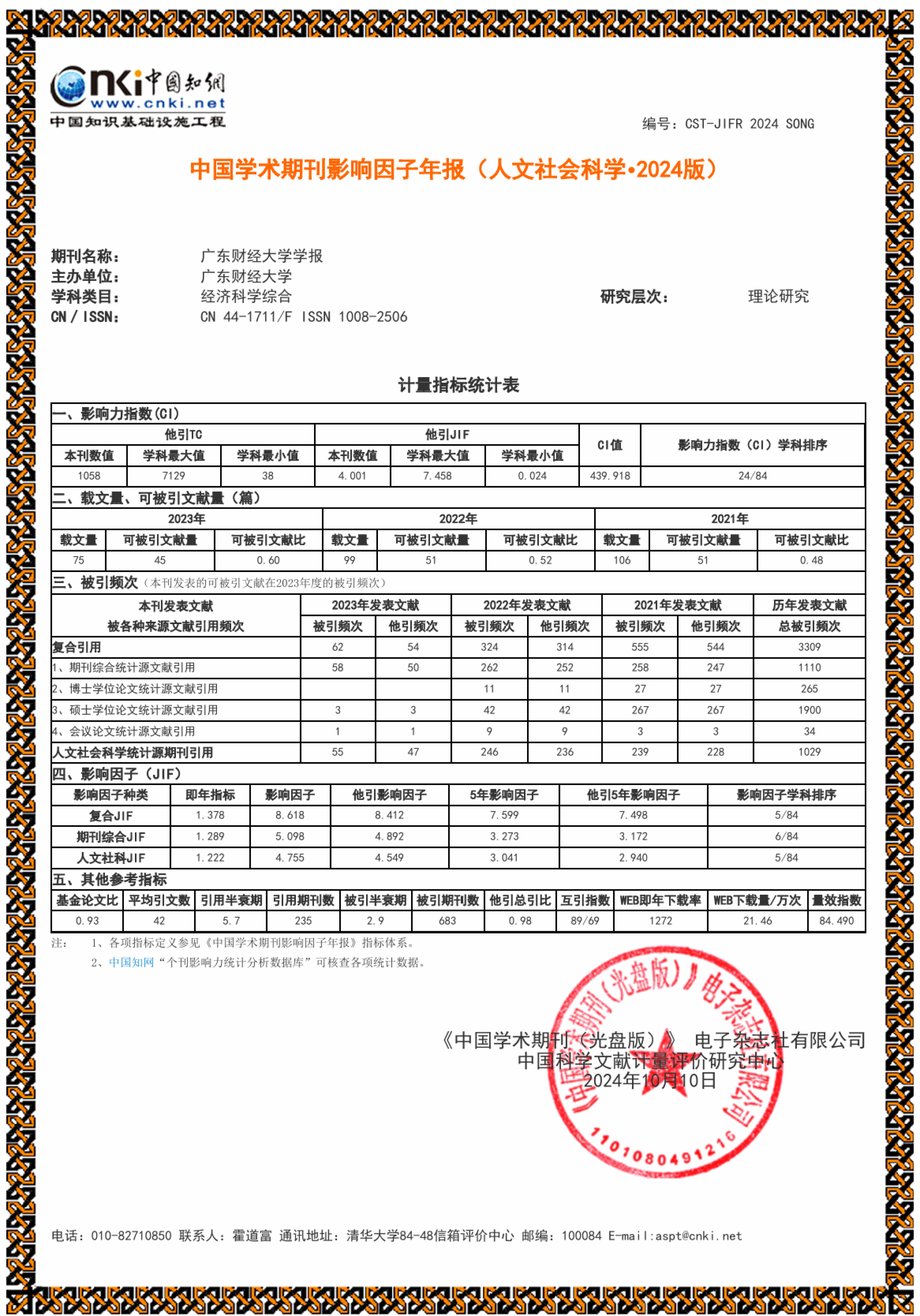 近日,中国知网发布“中国学术期刊影响因子年报(人文社会科学 2024版)”,该年报显示我校学报影响因子继续提升,再创历史新高。《广东财经大学学报》复合影响因子为8.618,比上年提高20.1%;期刊综合影响因子为5.098,比上年提高35.4%。此外,学报在影响力指数CI、CI学科排序、基金论文比、他引总引比、WEB即年下载率等各项指标全面取得提升,这表明学报在本学科影响力进一步提升。