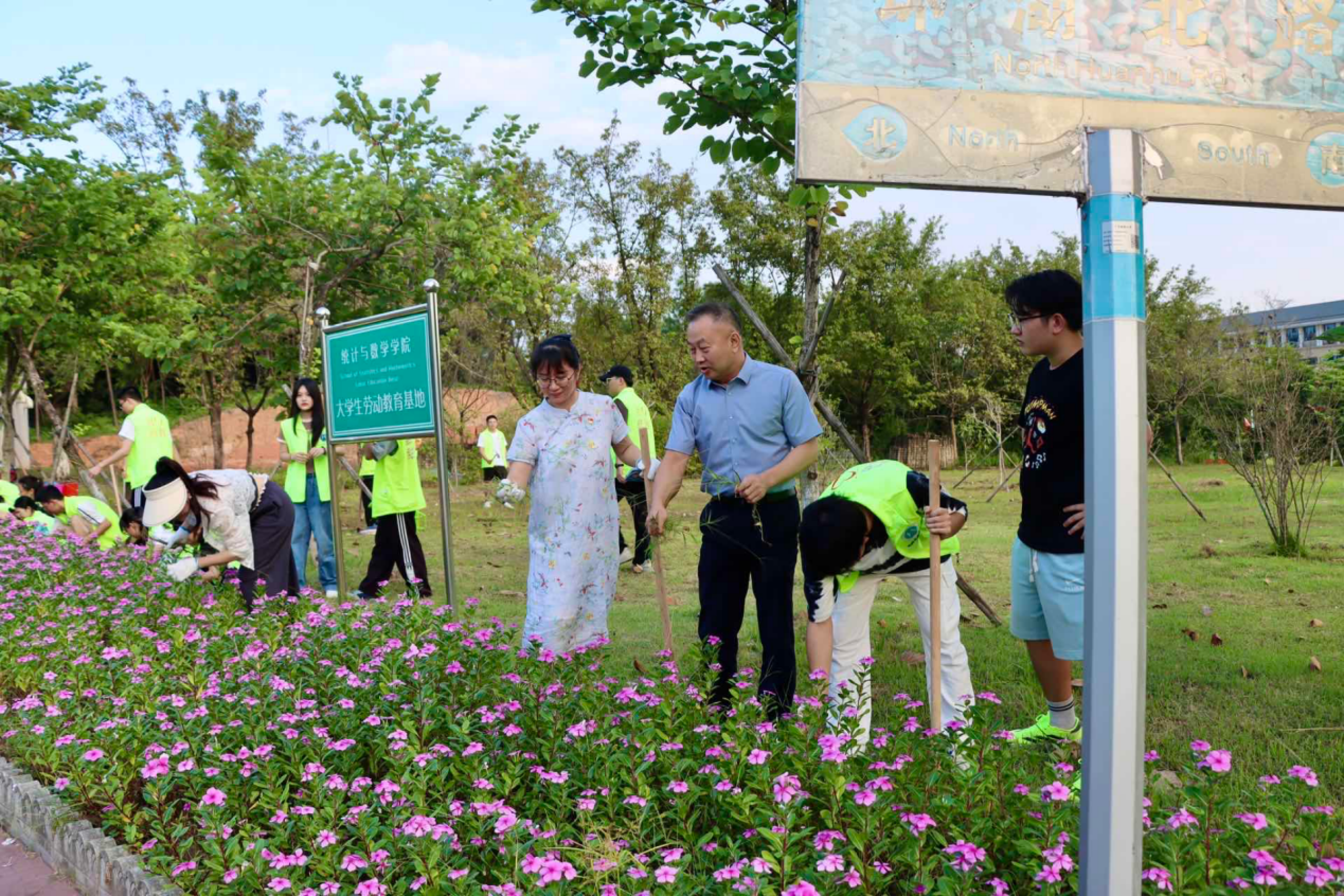 为响应习近平总书记“扩绿兴绿护绿”的号召,提高广大学生的生态文明和劳动意识,共建绿色校园。 10月17日下午,统计与数学学院党委副书记聂华丽、佛山校区团委书记吴春苑、24级辅导员卢秀芬带领23、24级志愿者们在佛山校区统数学院劳动教育基地开展“护绿行动”劳动教育。佛山校区党委书记王伟莅临现场指导此次活动。