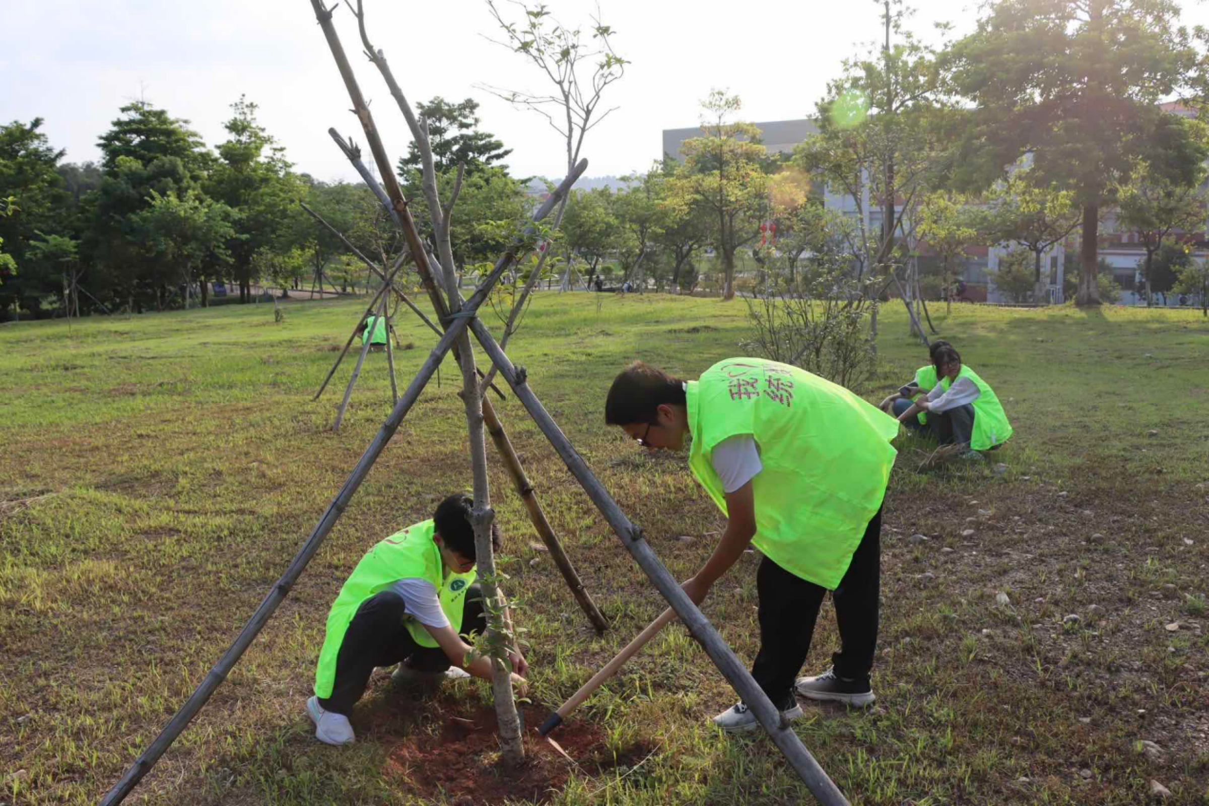 阳光下,闪耀的不止是树苗还是每一个忙碌的身影。在师生的齐心同力下,将绿色的理念植入在校园的土地上并蓬勃生长,顺利完成此次护绿活动。