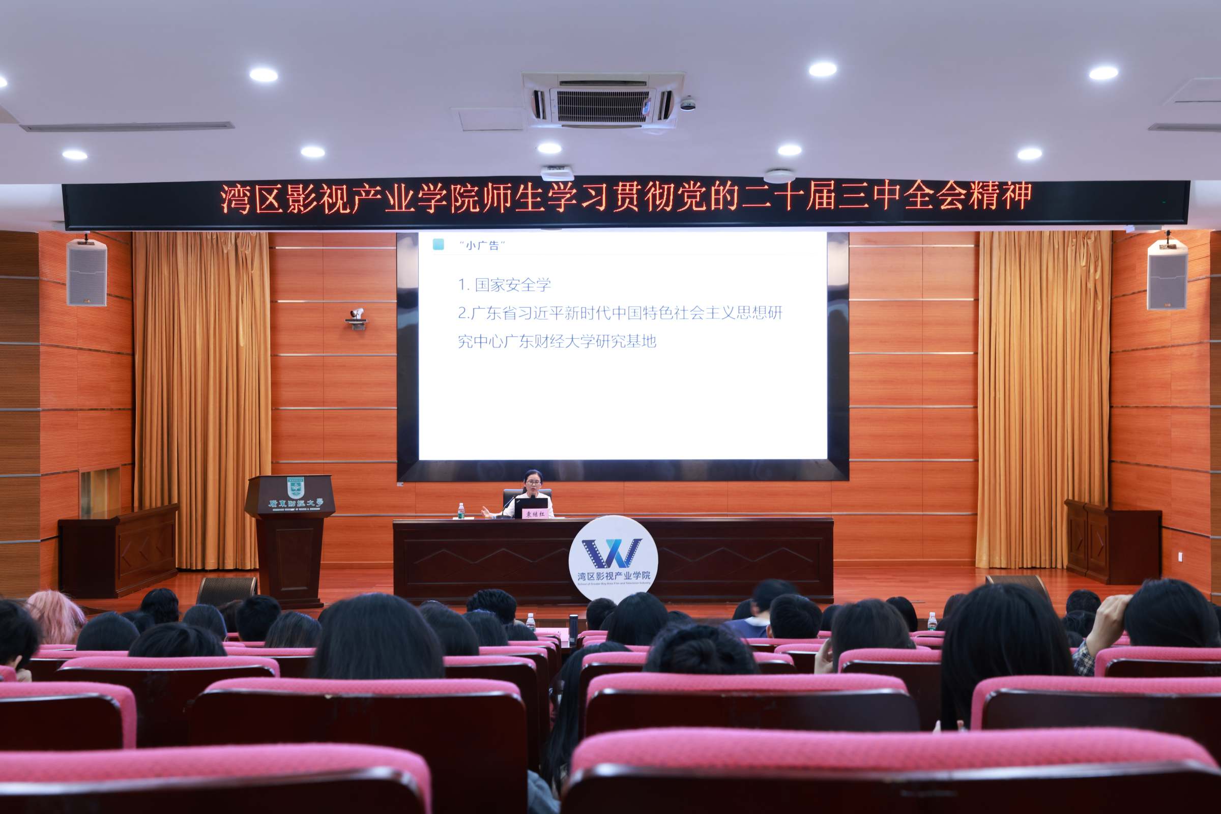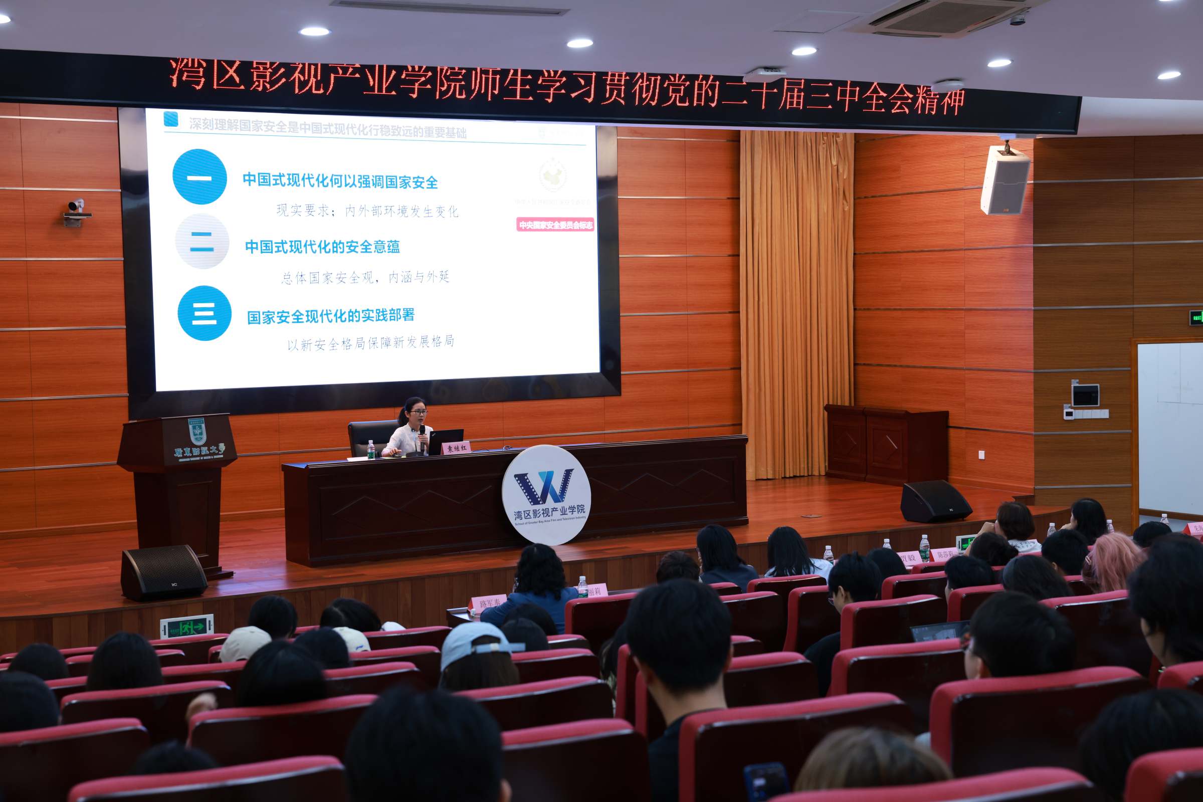 为深入学习贯彻落实党的二十届三中全会精神,10月24日晚,湾区影视产业学院在勤学楼开展《深刻理解国家安全是中国式现代化行稳致远的重要基础——学习贯彻党的二十届三中全会精神》专题讲座,邀请马克思主义学院院长、国家安全与发展研究院执行院长袁继红主讲,湾区影视产业学院党政领导班子、党委委员、党支部书记、系主任、党委组织员、2021级本科全体学生、2022级全体研究生参加,讲座由学院党委书记陈莎莉主持。