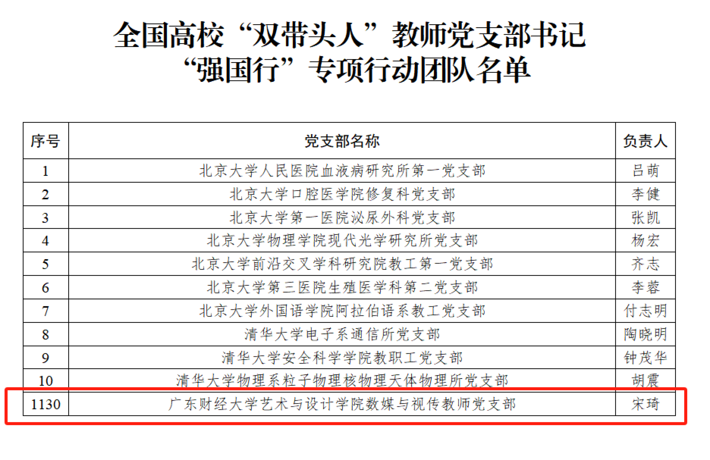 近日,教育部办公厅公布了全国高校“双带头人”教师党支部书记“强国行”专项行动团队名单,我校艺术与设计学院数媒与视传教师党支部成功入选。