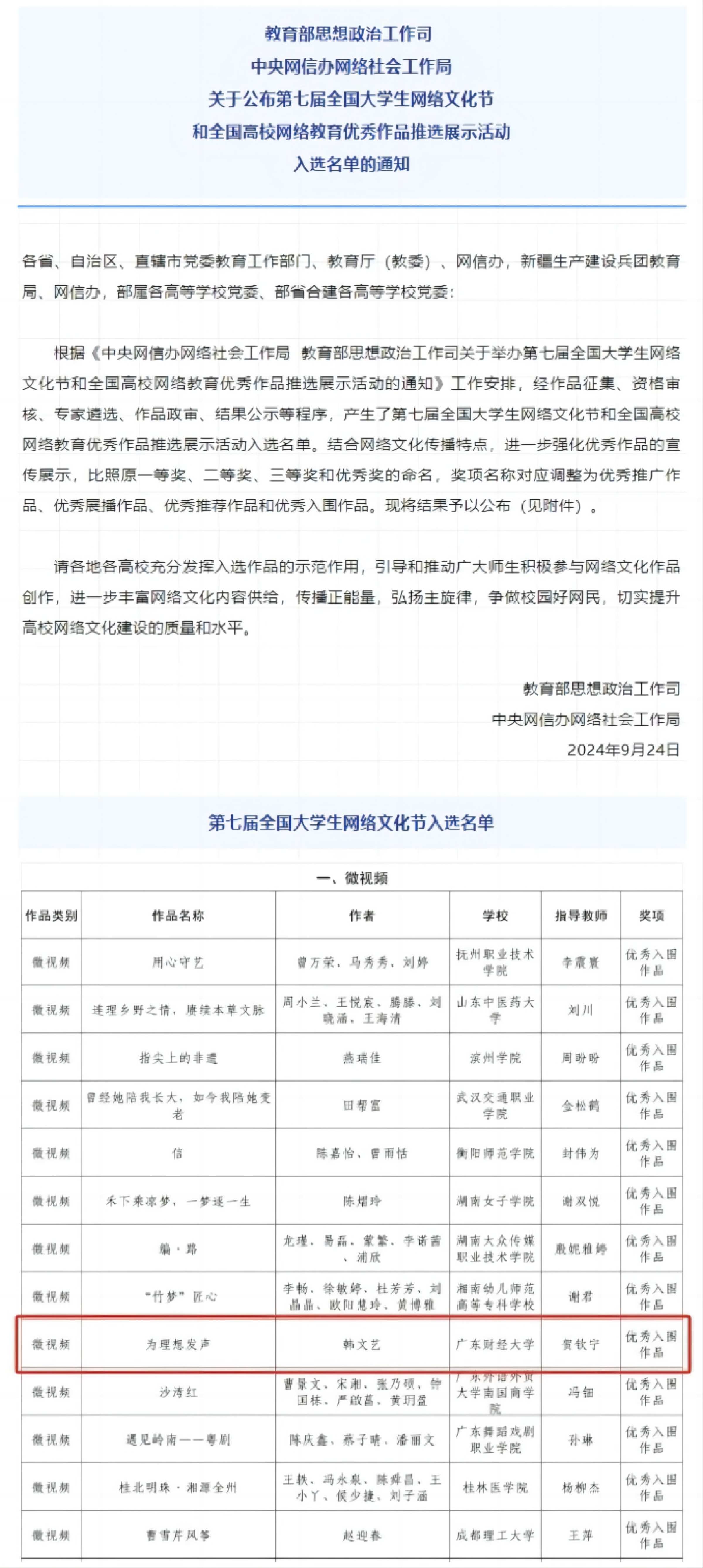 近日,中央网信办网络社会工作局和教育部思想政治工作司联合发布了《关于举办第七届全国大学生网络文化节和全国高校网络教育优秀作品推选展示活动的通知》,我校学生韩文艺、指导老师贺钦宁的作品《为理想发声》获第七届全国大学生网络文化节微视频“优秀入围作品”。