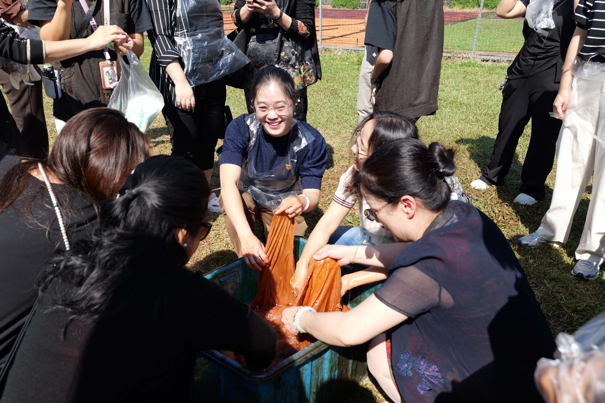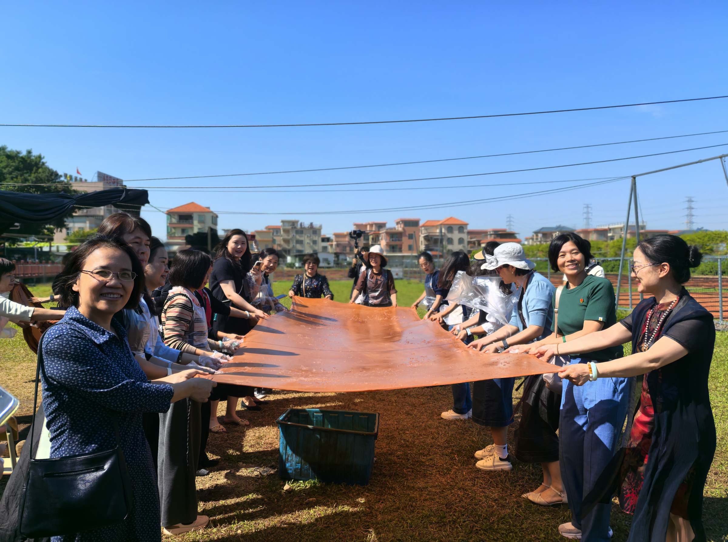 团队成员参观了香云纱非遗文化园,学习体验香云纱的制作工艺。香云纱是岭南瑰宝,是世界纺织品中唯一用纯植物染料染色的丝绸面料,被纺织界誉为“软黄金”。通过学习香云纱的历史文化,体验浸染、晒莨、扯布、过乌等制作工艺,团队成员进一步感悟了中国劳动人民的智慧和勤劳。