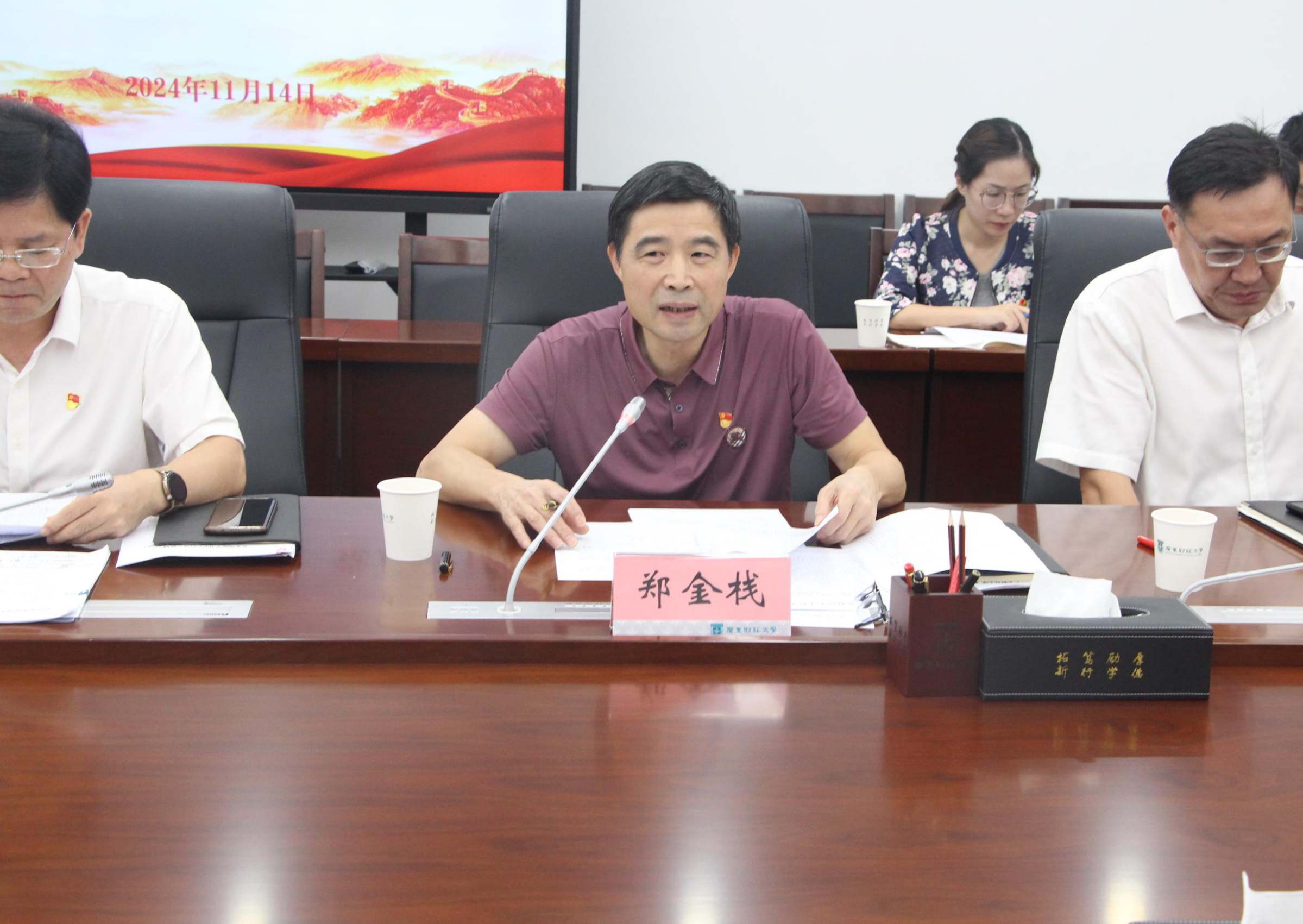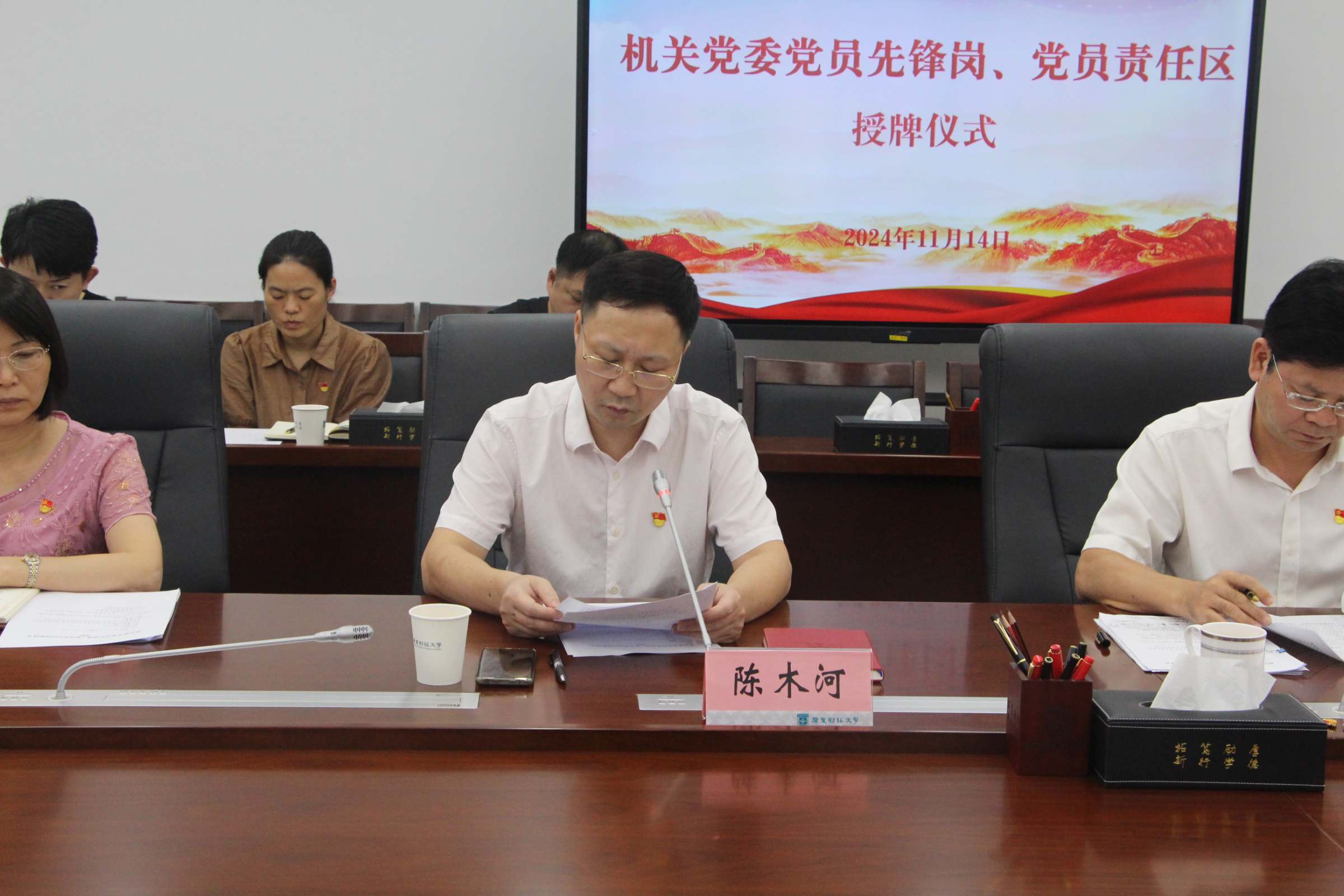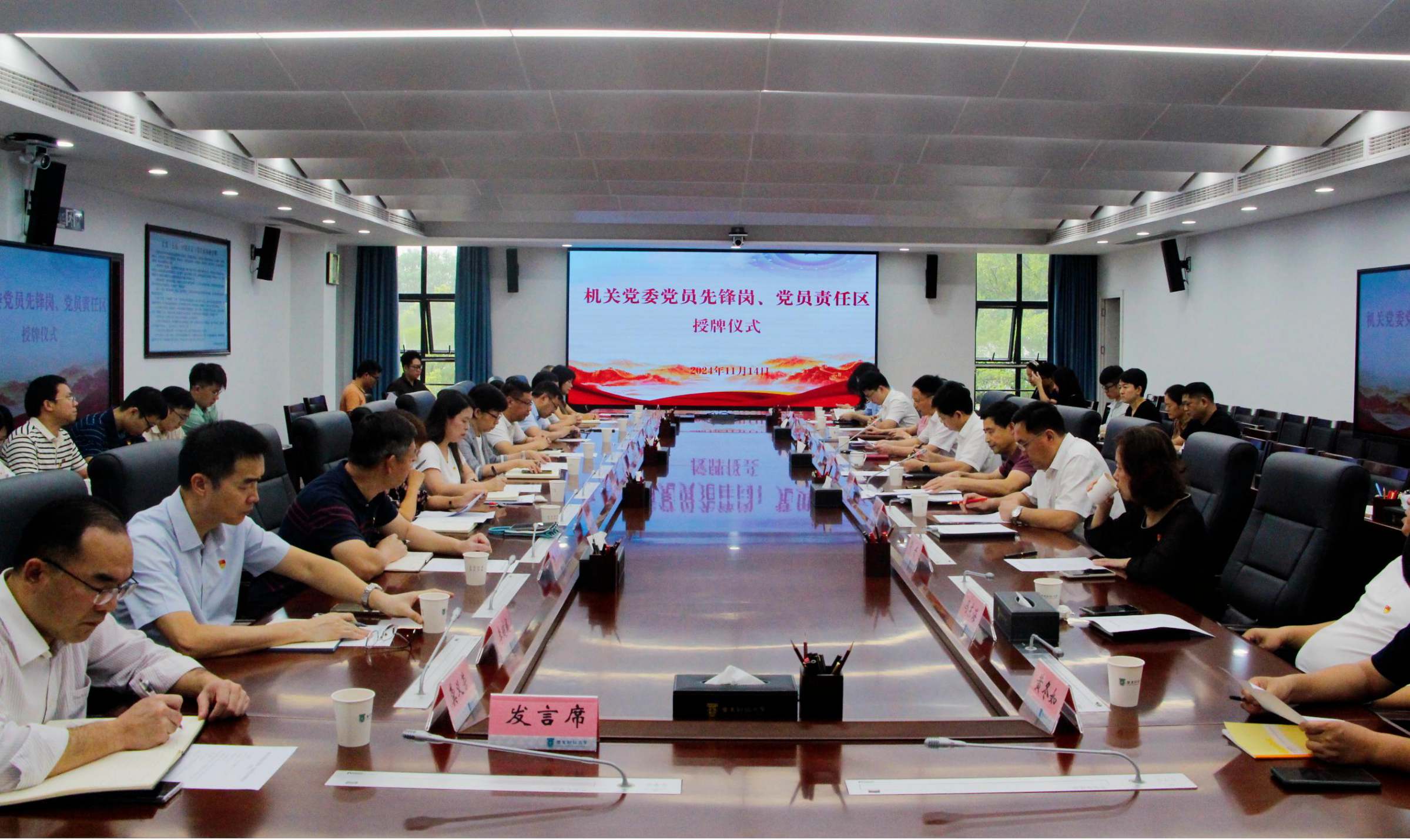 11月14日下午,机关党委在同德楼第一会议室举行党员先锋岗和党员责任区授牌仪式,以实际行动贯彻落实党的二十届三中全会精神。校党委副书记罗贤甲、机关党委书记郑金栈、机关党委专职副书记陈木河、机关党委委员、机关党委辖属党支部书记,以及党员先锋岗和党员责任区代表参加授牌仪式。授牌仪式由郑金栈主持。