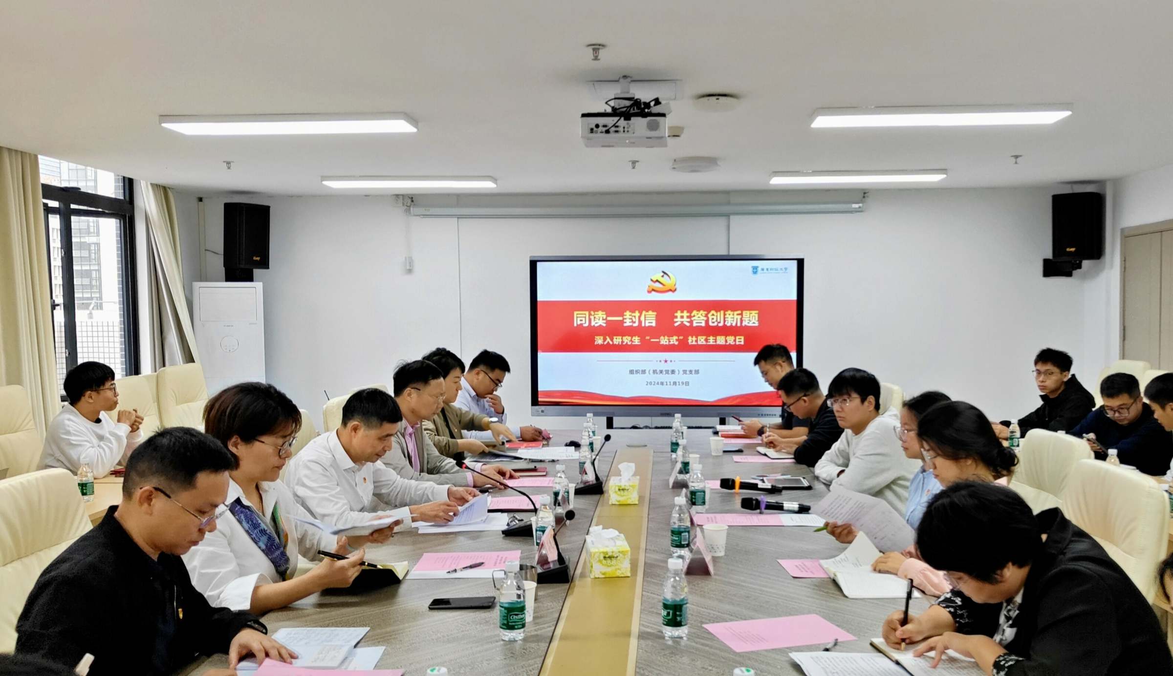 11月19日下午,组织部(机关党委)党支部深入研究生“一站式”社区开展“同读一封信、共答创新题”主题党日活动,以实际行动联系基层、联系师生共同持续深入学习贯彻党的二十届三中全会精神。参加主题党日活动的有组织部(机关党委)党支部党员、研究生院(处)党支部党员代表、研究生辅导员代表以及社区博士、硕士研究生党员代表。会议由组织部(机关党委)党支部书记郑金栈主持。