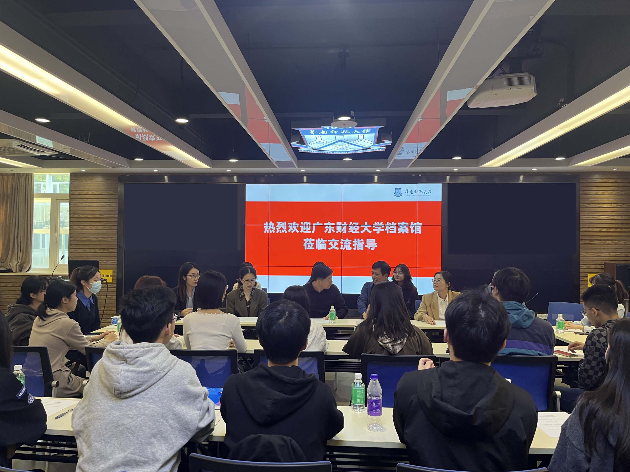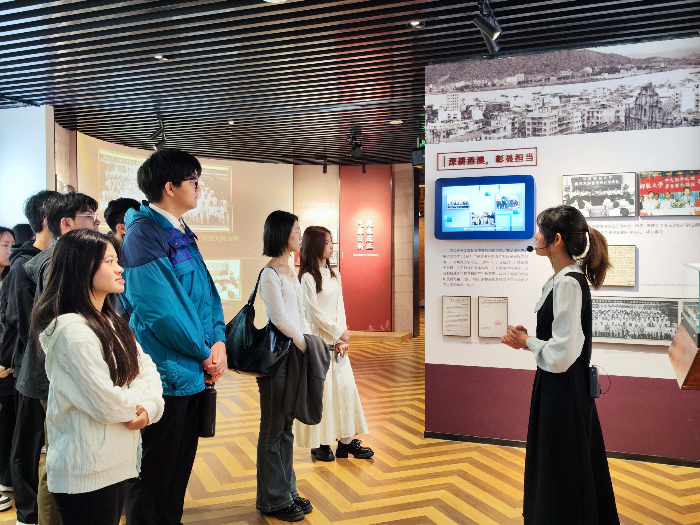 在参观环节,华南师范大学宣讲社学生讲解员详细介绍了华南师范大学的办学历史,让我校师生对华南师范大学“一源九脉”的发展历史有了更深刻的了解,也进一步感悟了华南师范大学的文化底蕴和优良传统。在座谈会上,两校师生从校史馆的运营管理、社团活动的组织策划、讲解队伍的培养考核、讲解内容和形式的拓展、社团成员的激励机制等方面进行了深入细致的交流讨论。