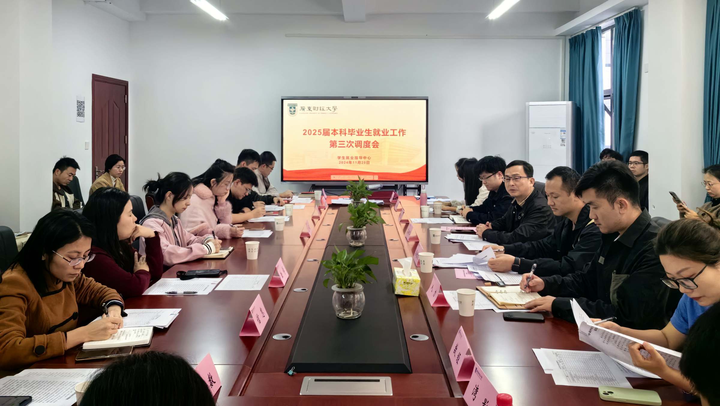 为深入贯彻落实党的二十届三中全会精神,全面落实党中央、国务院、省教育厅和学校党委关于高校毕业生就业工作的决策部署,推进我校2025届毕业生高质量充分就业。11月28日,学生就业指导中心在广州校区同德楼338会议室召开2025届本科毕业生就业工作第三次调度会。学工部部长、学生就业指导中心主任苏明华出席会议,学生就业指导中心全体人员、本科毕业班辅导员参加会议。学工部副部长、学生就业指导中心副主任梁铿浩主持会议。