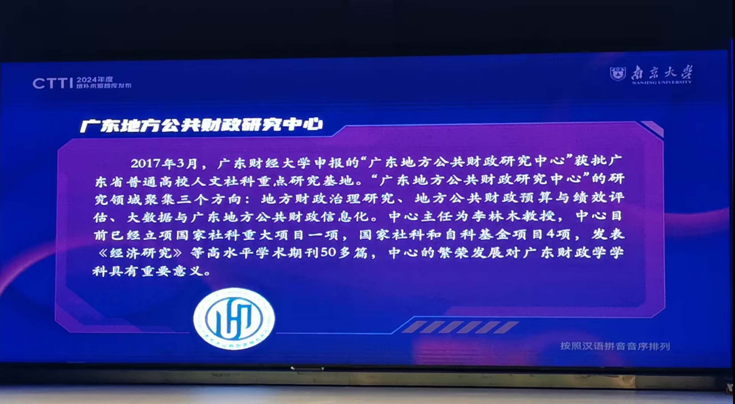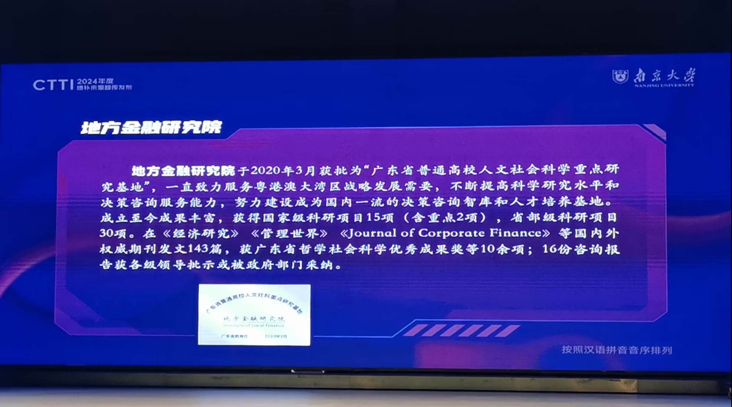 11月30日,“2024年度新型智库治理论坛”在兰州大学隆重召开,论坛公布了增补智库“2024新型智库治理论坛”名单,我校地方金融研究院、大湾区双循环研究院、广东地方公共财政研究中心等3个智库入选中国智库索引(CTTI)来源智库;邹新月教授《金融支持农业企业健康发展研究》进入CTTI2024年度智库研究优秀成果推介名单。