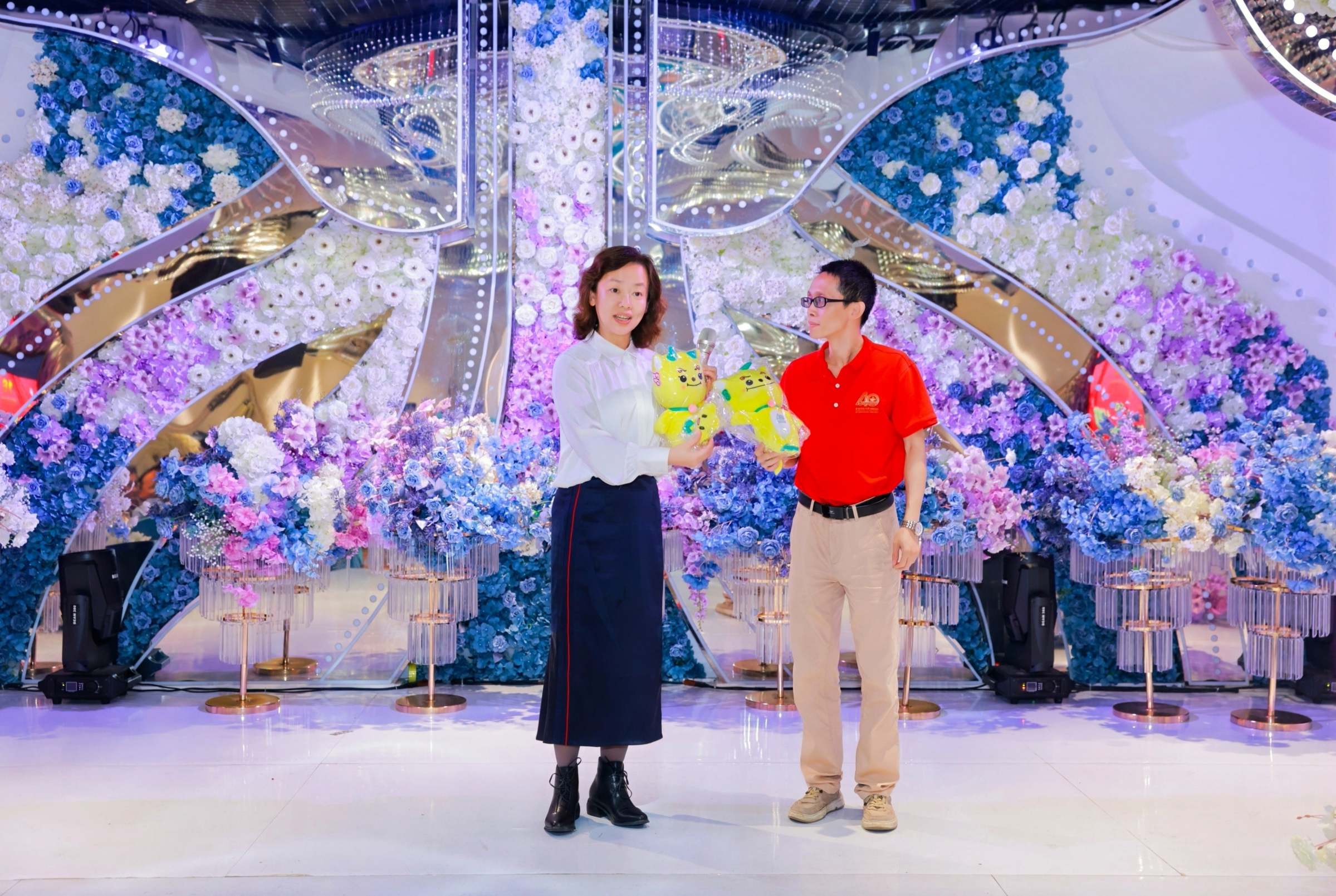 段丹向校友们介绍了学校校友工作的基本情况,并为大家带来了学校40周年校庆的IP形象——獬豸、貔貅、小元宝公仔。