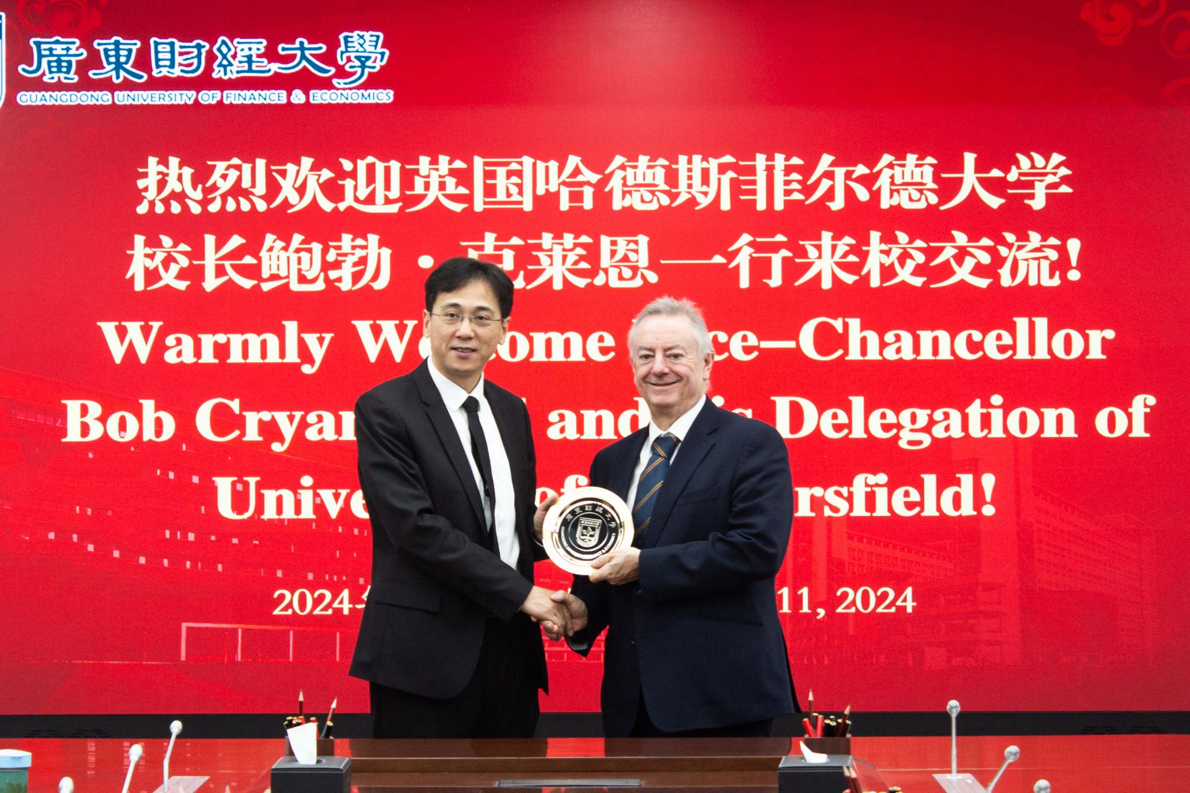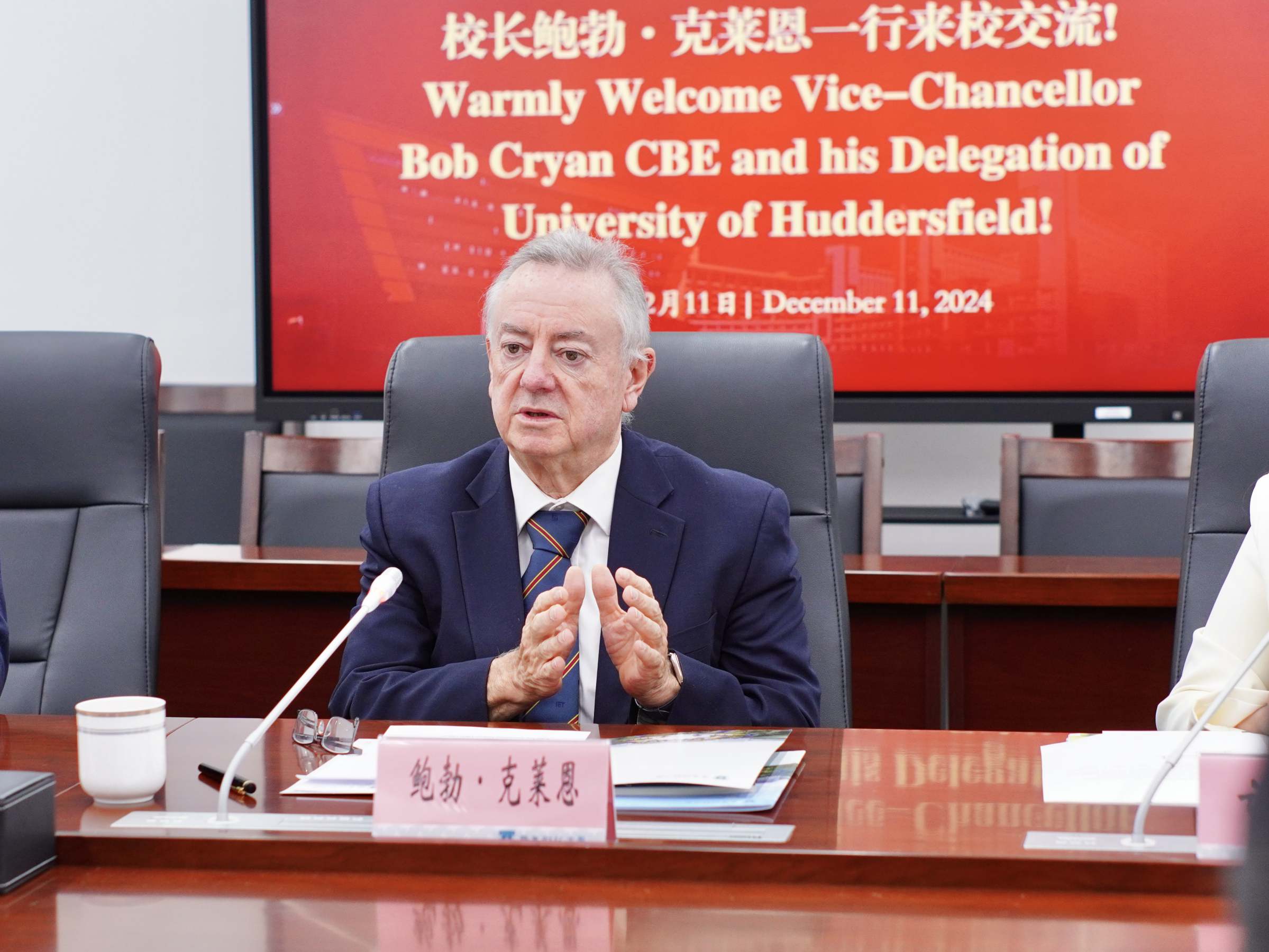 12月11日上午,英国哈德斯菲尔德大学校长、英国工程技术协会(IET)荣誉主席、英国皇家工程院院士Bob Cryan一行到访我校。学校副校长张凯,外国语学院党委书记谭玉祥、院长陈冬纯、副院长胡红辉,国际交流与合作处副处长郭向阳等相关人员会见来宾并举行会谈。会议由张凯主持。