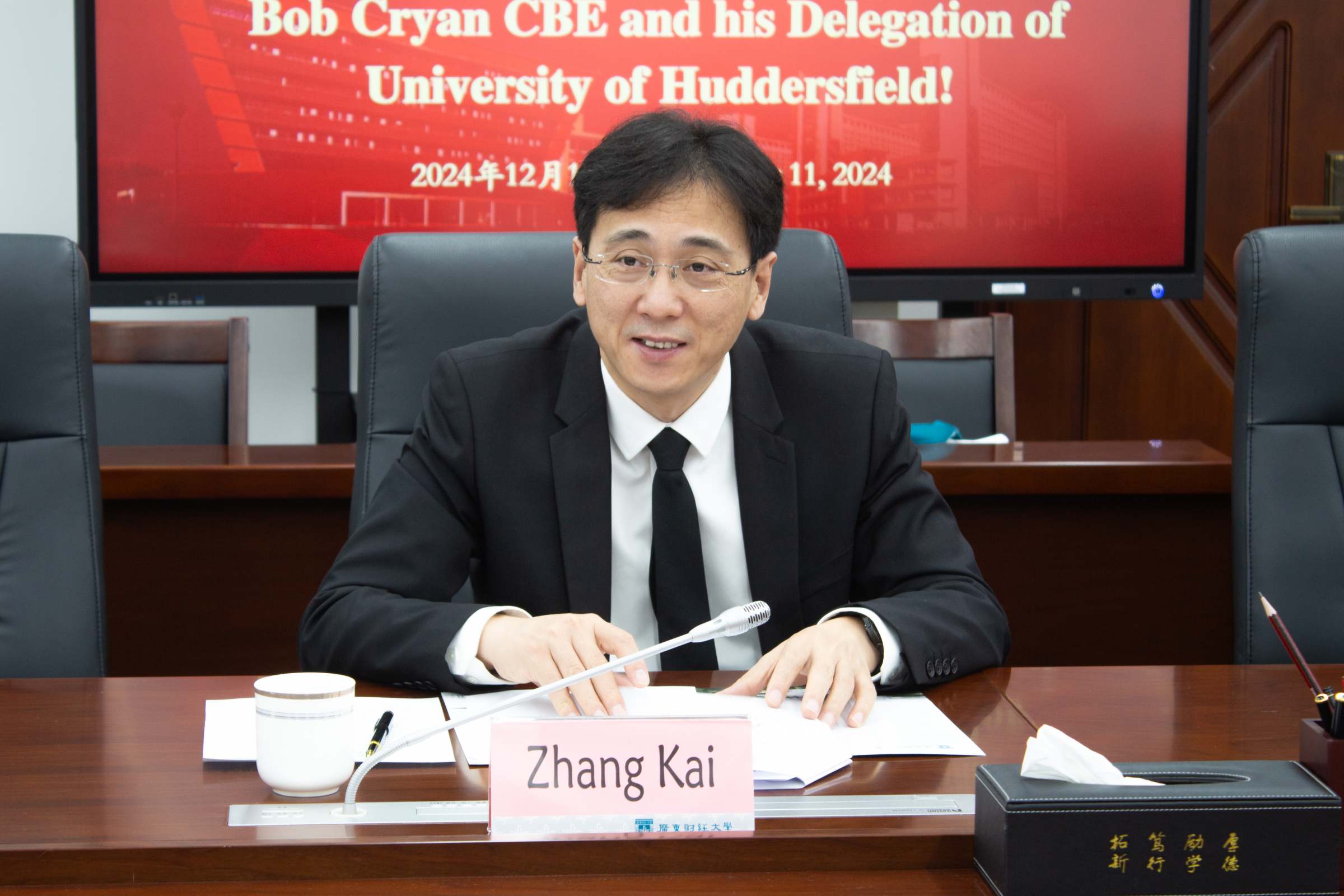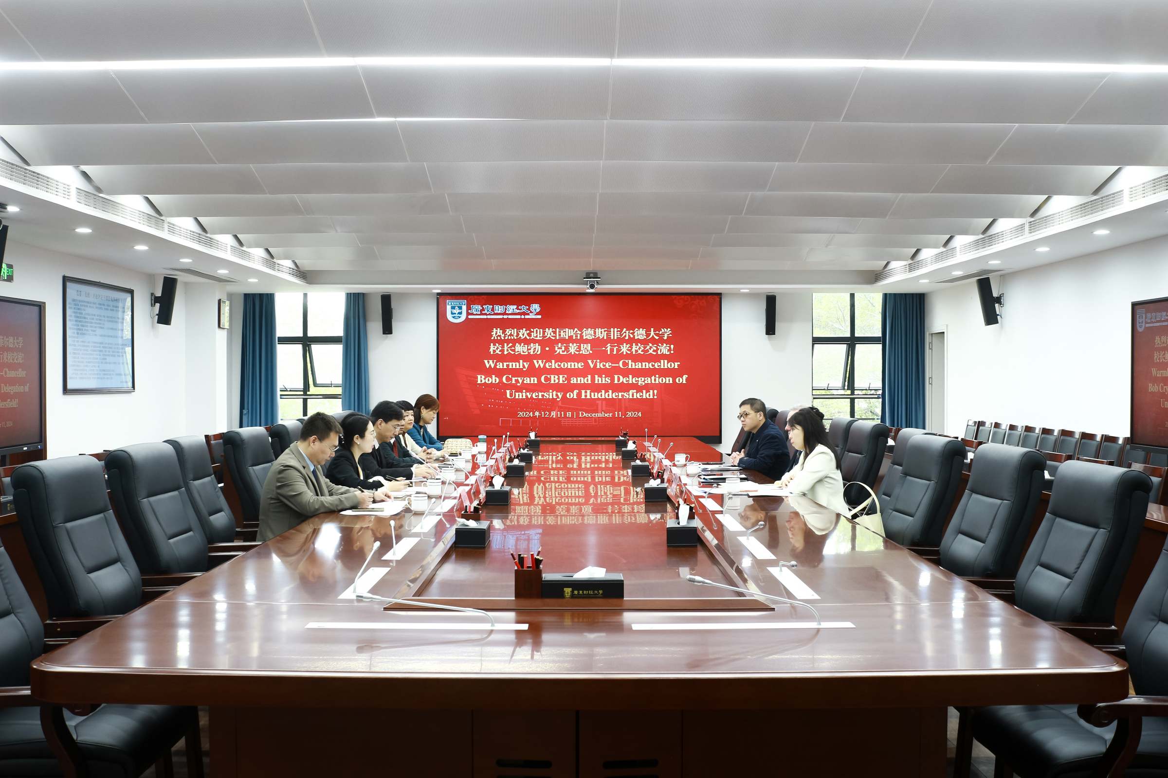 张凯对Bob Cryan一行的来访表示热烈欢迎,介绍了我校的发展历程、办学特色等情况,回顾了两校的合作历史和人才培养成效。Bob Cryan介绍了哈德斯菲尔德大学的办学情况和发展愿景,并表示愿与我校加强紧密合作,助力中英教育高质量发展。随后,与会人员就两校间开展3+1本硕连读、学生交流交换、教师互访、联合科研等项目进行了深入交流。