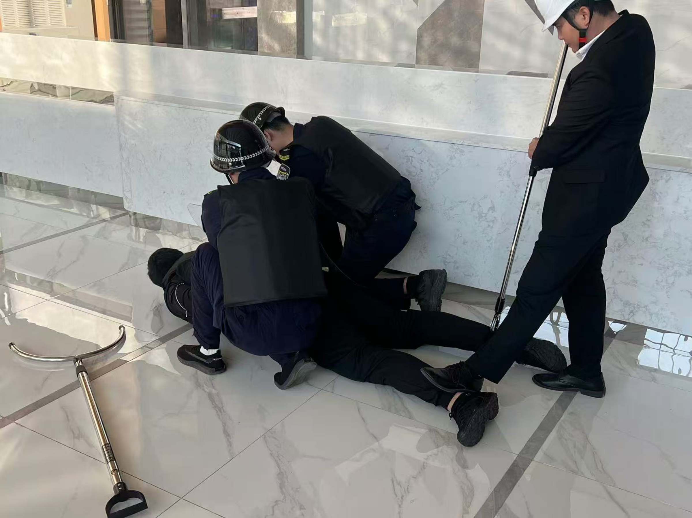 演练过程中,演练人员按照演习方案,针对进入园区内可能发生的突发性恐怖袭击以及“暴徒”强闯办公楼、办公室、持刀威胁等情况进行了演练,并就应该如何冷静应对、与其周旋、等待警方支援等技巧对安保人员进行了培训。