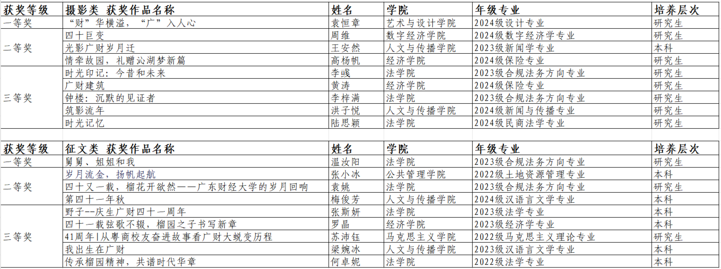 党委研究生工作部联合党委学生工作部举办的“流年印影,笔端寄情”广东财经大学41周年校庆之摄影、征文活动落下帷幕。此次比赛分摄影和征文两类,共计收到作品200余份。研工部组织形式审查和专家评审,众多优秀作品脱颖而出,共有18篇作品获得摄影类、征文类一、二、三等奖。