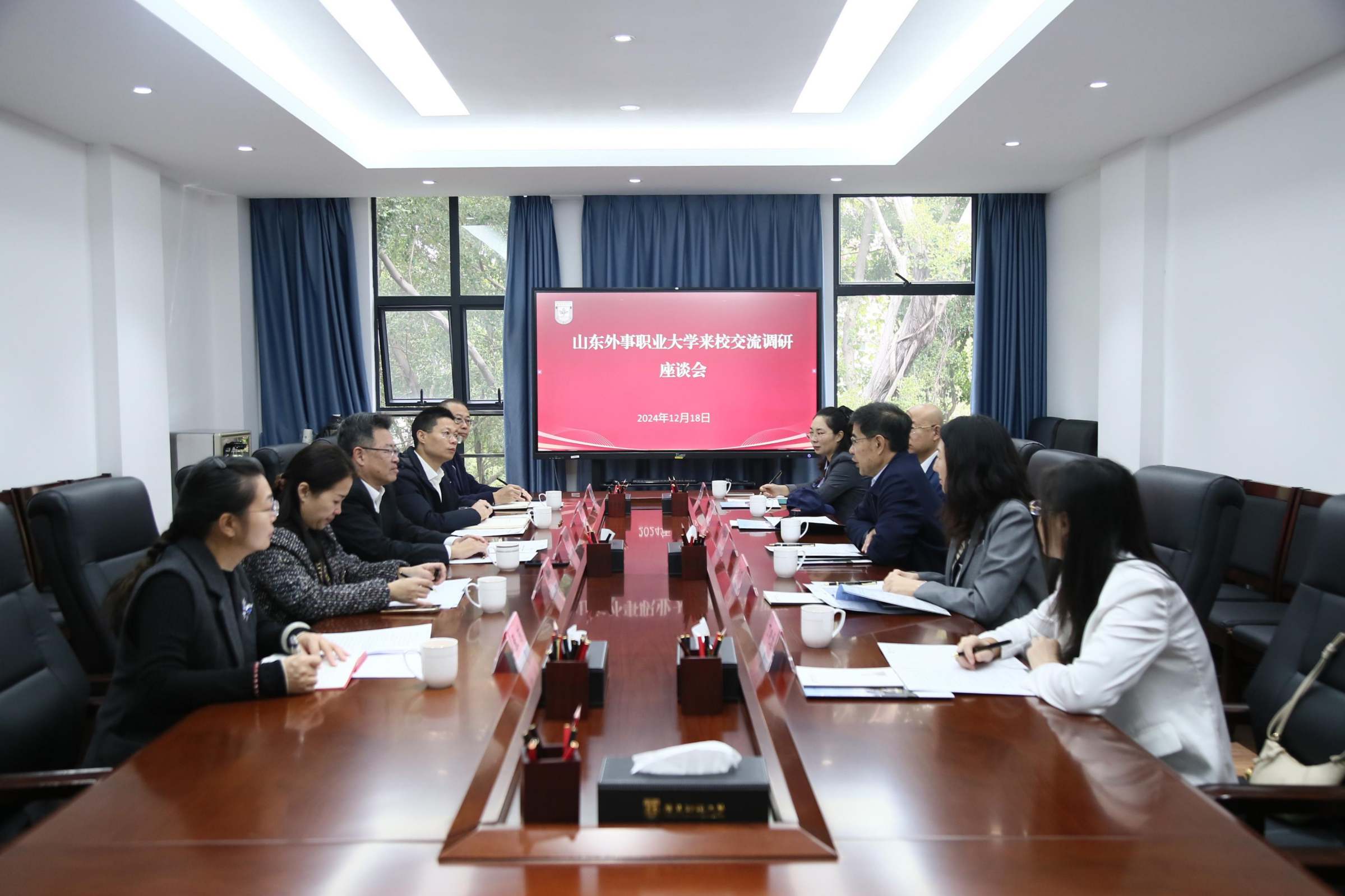 陈国栋对山东外事职业大学来校调研表示热烈欢迎,并介绍了学校的基本情况。王传生感谢我校对此次调研交流活动的热情安排,并介绍了山东外事职业大学的基本情况和此次调研的目的。