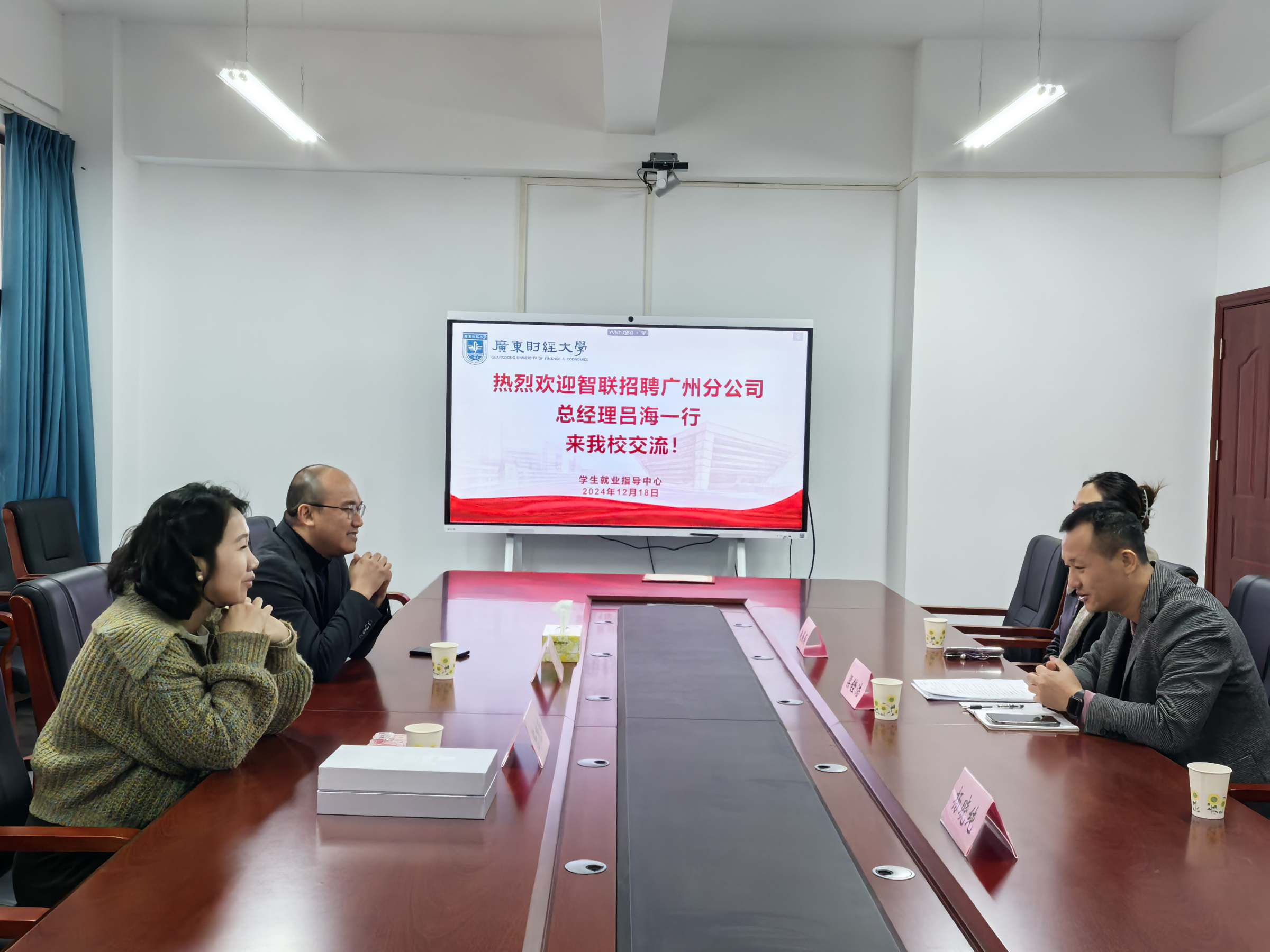 12月18日,智联招聘广州分公司总经理吕海一行莅临我校进行交流座谈。学工部副部长、学生就业指导中心副主任梁铿浩,智联招聘渠道市场推广经理陈桂玲,学生就业指导中心副处级干部杨晓纯、科长赵薇薇等参加座谈。