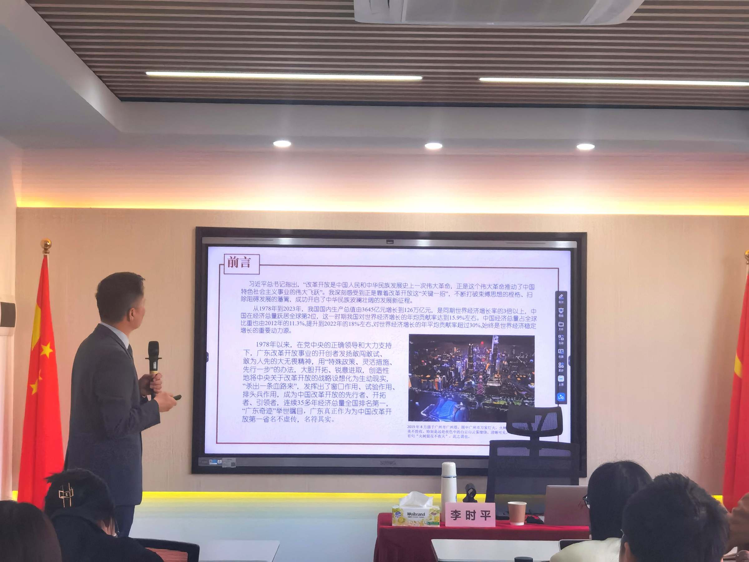 紧接着,李时平结合其参加广东改革开放的工作经历为切入点,向大家展现了广东改革开放宏图伟卷中的微观视角。从1985年韶关市的一纸通知书,到2023年省里的免职退休通知,其职业生涯几乎与改革开放同步,每一步都踏着时代的节拍。