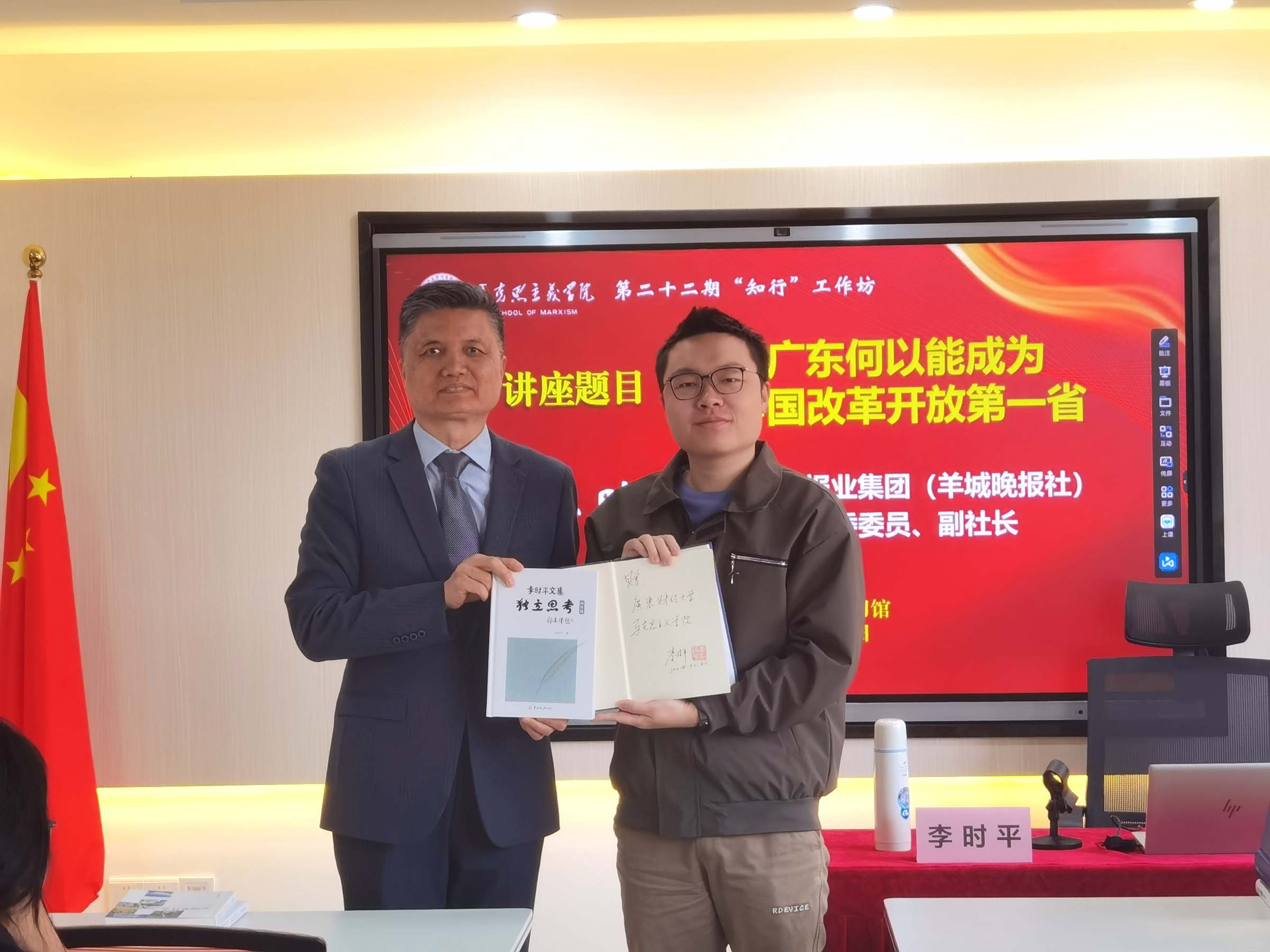活动伊始,李时平向马克思主义学院赠送《独立思考·李时平文集》和《幸福是什么》书籍,袁继红代表受赠单位表示感谢。
