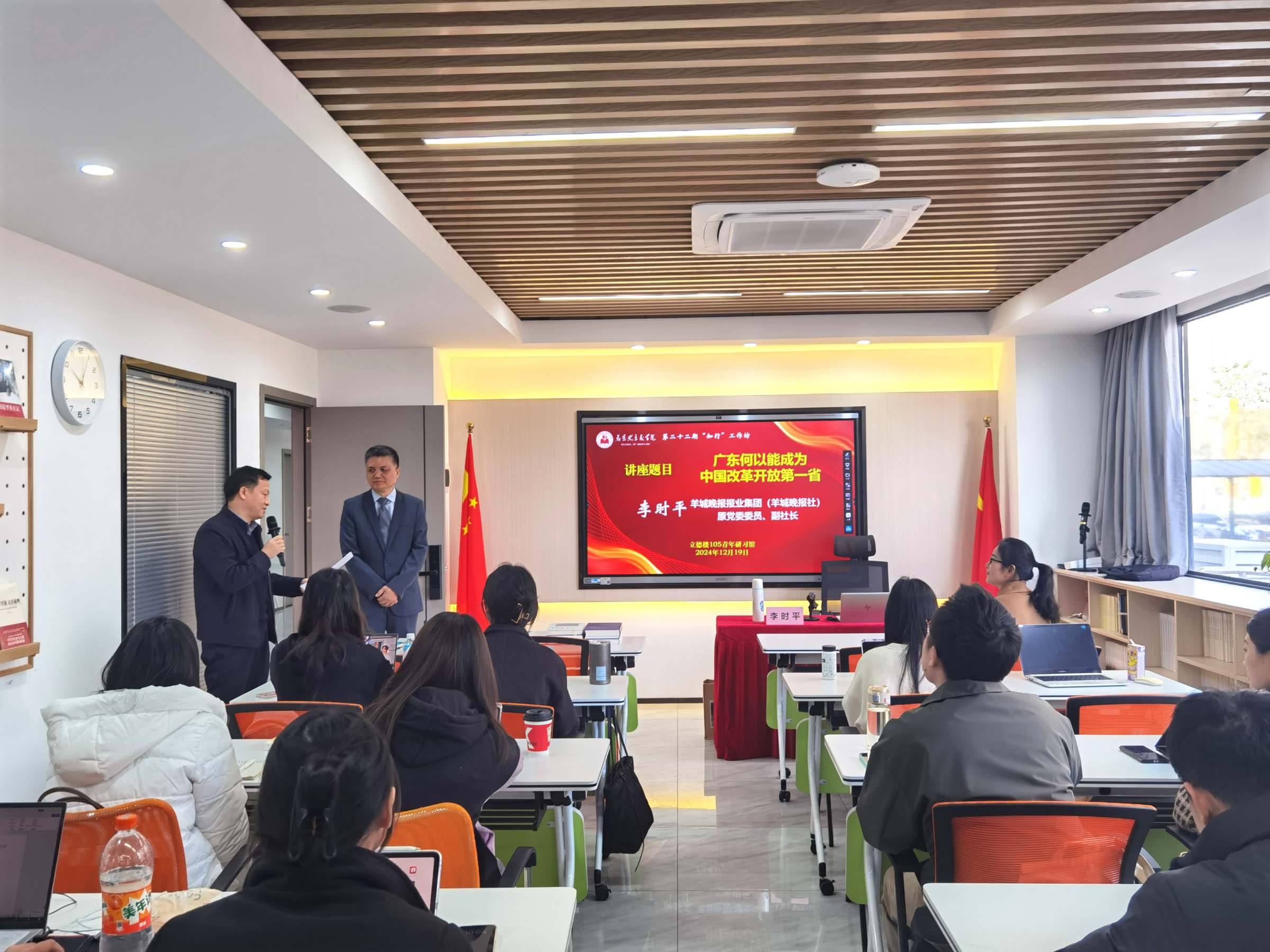 12月19日上午,马克思主义学院邀请羊城晚报报业集团原党委委员、副社长李时平做客第22期“知行”工作坊,作题为“广东何以能成为中国改革开放第一省”学术讲座。马克思主义学院院长袁继红、院长助理李腾凯、马克思主义理论专业各学科方向教师代表、马克思主义理论专业硕士研究生代表共40多人参加讲座。讲座由马克思主义学院副院长陶日贵主持。