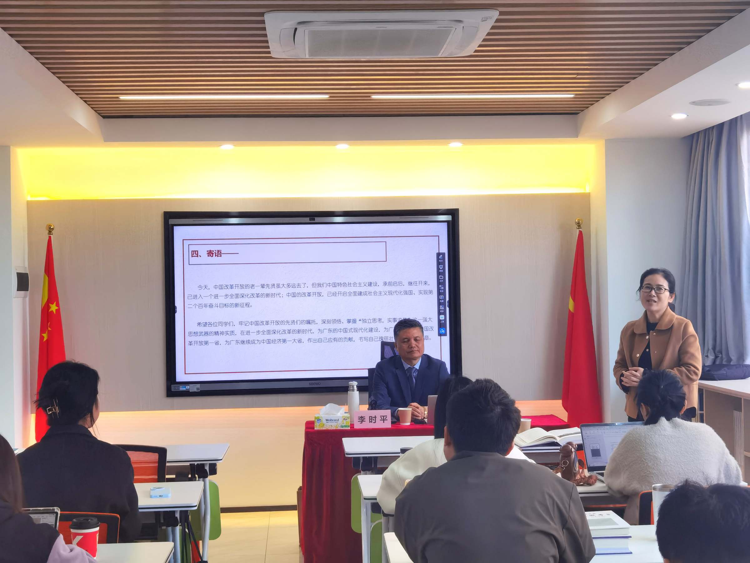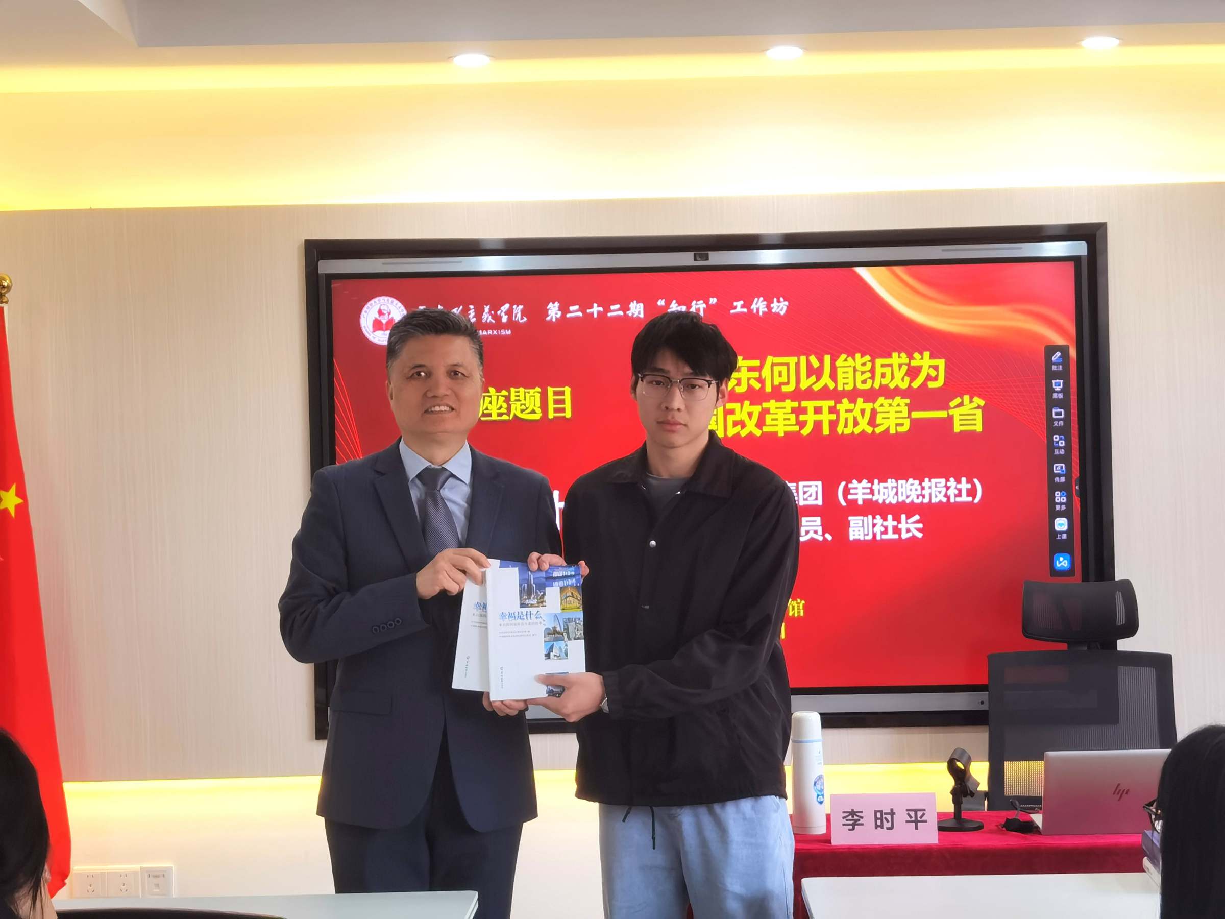 在最后互动环节,李时平谈到,弘扬伟大的改革开放精神,不仅有着很强的现实意义,同时也具有深厚的历史价值、深邃的思想价值和深远的社会价值。他寄语同学们要深刻领悟、掌握改革开放的重大意义,为广东在推进中国式现代化建设中走在前列贡献力量。