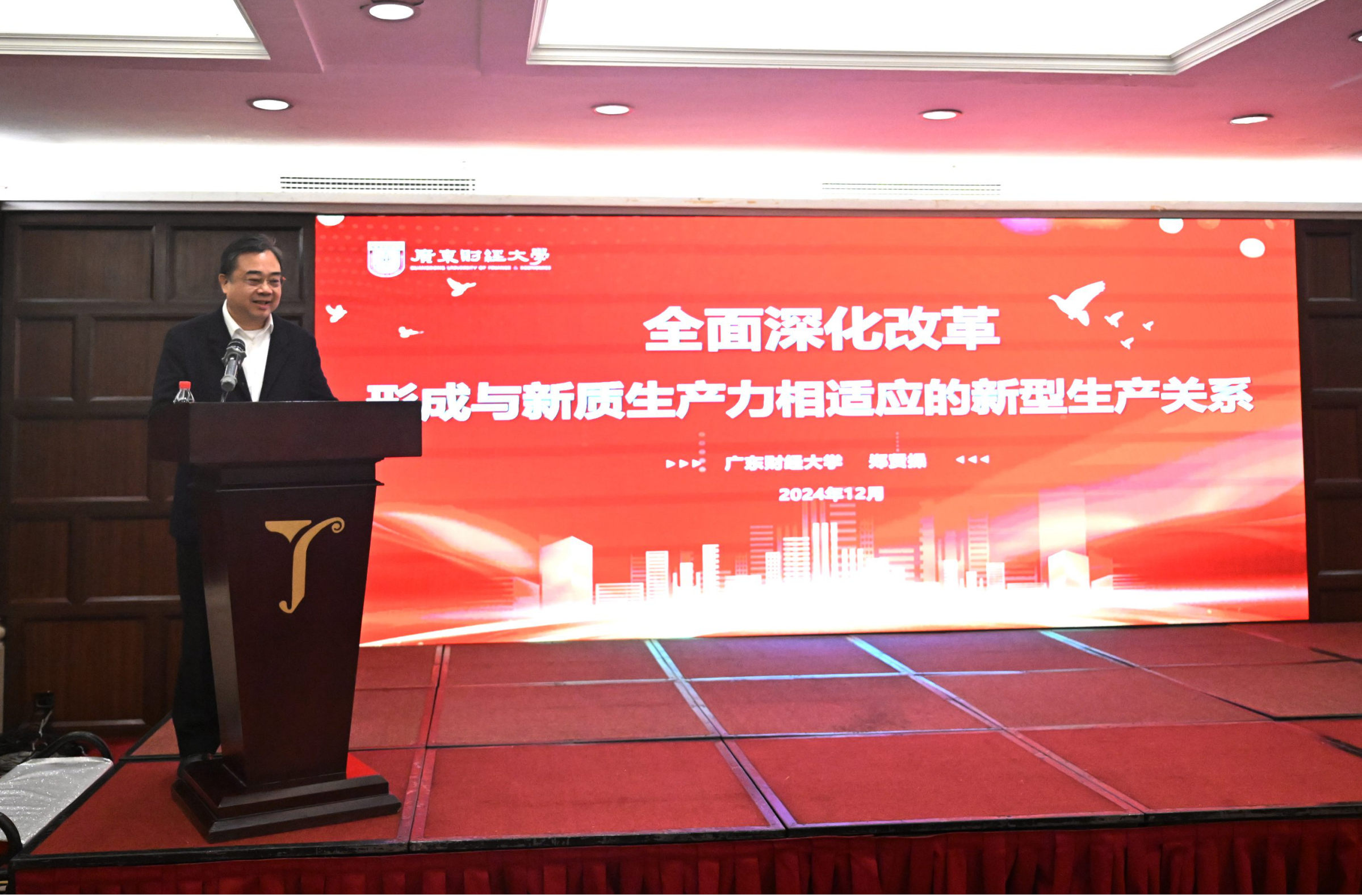 会上,郑贤操以“全面深化改革 形成与新质生产力相适应的新型生产关系”为题作学术报告。他从马克思主义经典理论和习近平总书记的重要论述两个层面对新质生产力与新型生产关系进行了理论溯源,并根据形成与新质生产力相适应的新型生产关系的广东实践,对广东构建新型生产关系的发展前景进行了前瞻。他结合构建与新质生产力相适应的新型生产关系的高校担当,从高校培养新质生产力所需的新型劳动者、创新新质生产力的劳动资料、拓展新质生产力的劳动对象的重要使命出发,重点分享了我校在探索构建适应新质生产力发展需求的人才培养体系、学科体系和社会服务体系方面的经验。报告对习近平总书记关于新质生产力和新型生产关系的重要论述进行了全面而深刻的阐释,得到了与会领导和专家学者的肯定。