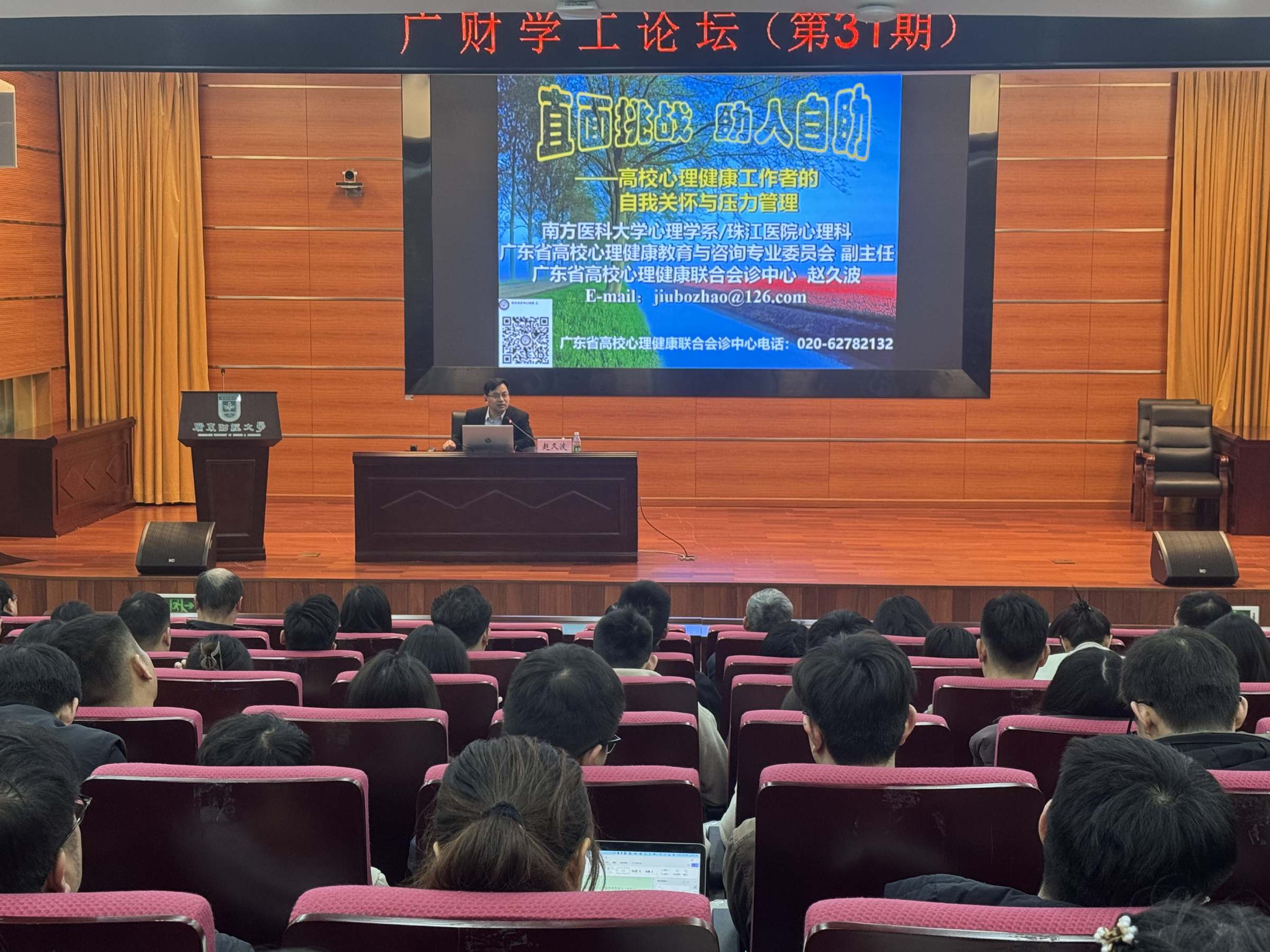 本次讲座邀请南方医科大学心理学系副主任、南方医科大学珠江医院精神心理科副主任赵久波主讲。赵久波多年来从事心理学与精神医学的教学、科研与临床工作,特别在自杀预防与危机干预、心理健康教育、临床心理治疗等领域经验丰富。讲座中,赵久波援引临床案例与实践经验,阐述了高校心理工作者的压力与挑战、常见心理健康问题的识别、心理健康自我调节的方法等内容。赵久波以丰富的案例、扎实的处理经验、独到的见解,对我校学工队伍加强学生心理健康教育实践工作提供指导。