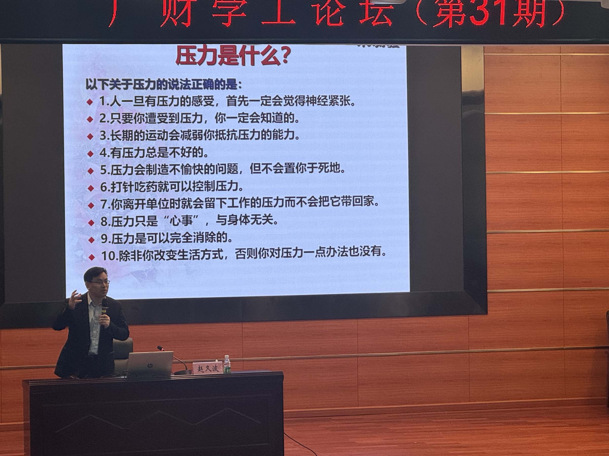 12月23日上午,学工部在广州校区勤学楼408举办第31期“广财学工论坛”,讲座主题为“直面挑战,助人自助——高校心理健康工作者的自我关怀与压力管理”。学工部部长苏明华、副部长吴斯娜、学工部相关科室人员以及各学院学生工作书记、辅导员共同参加论坛。论坛由苏明华主持。