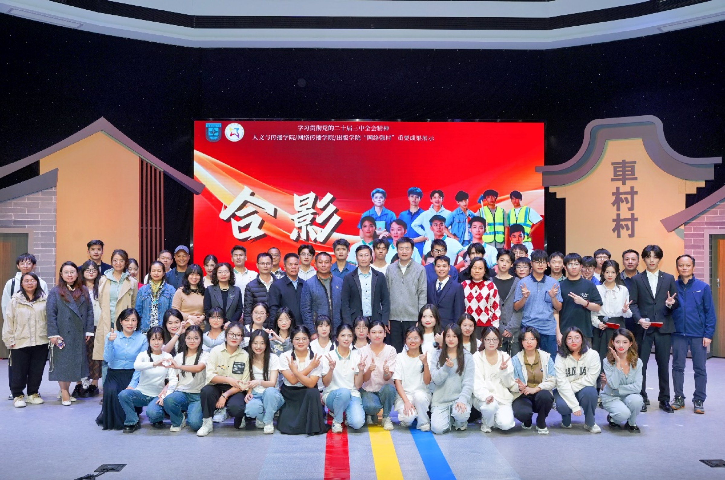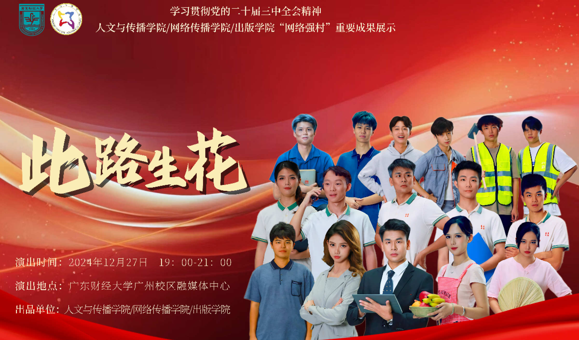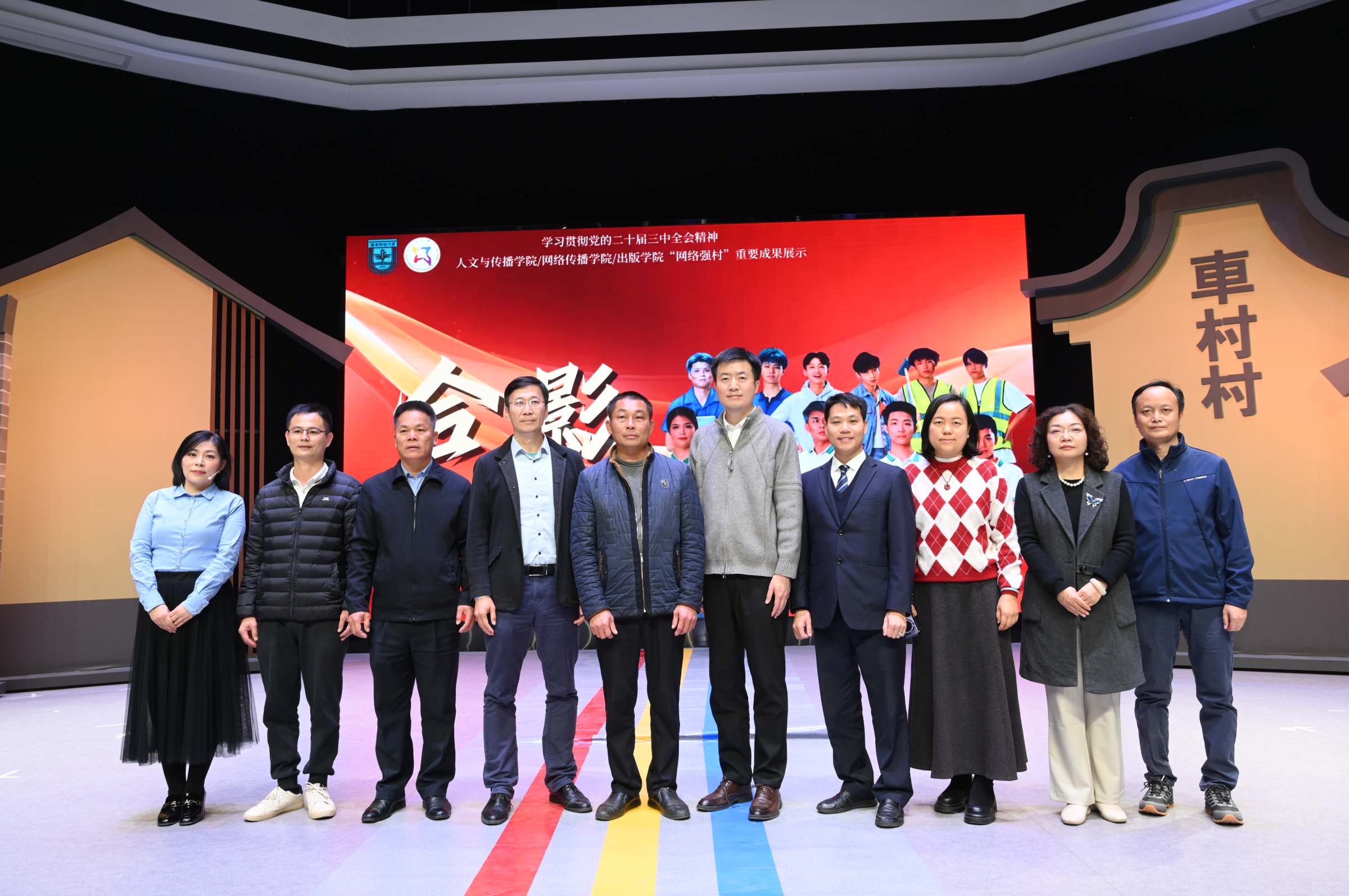 2024年12月27日晚,我校原创话剧《此路生花》在广东财经大学融媒体中心顺利演出。该剧是一部由我校人文与传播学院/网络传播学院/出版学院中国语言文学系师生自编、自导、自演的原创话剧作品,是我校创新网络强村模式、落实省委部署的“1310”工程、对接“百千万工程”、致力乡村振兴成果的具体体现。我校党委宣传部部长张鹏程,人文与传播学院/网络传播学院/出版学院党委书记于万红、副书记张传瑜,车村村党总支书记车碧锋、副书记车共平,平安保险首席招募官蔡嘉贤到场观看演出。