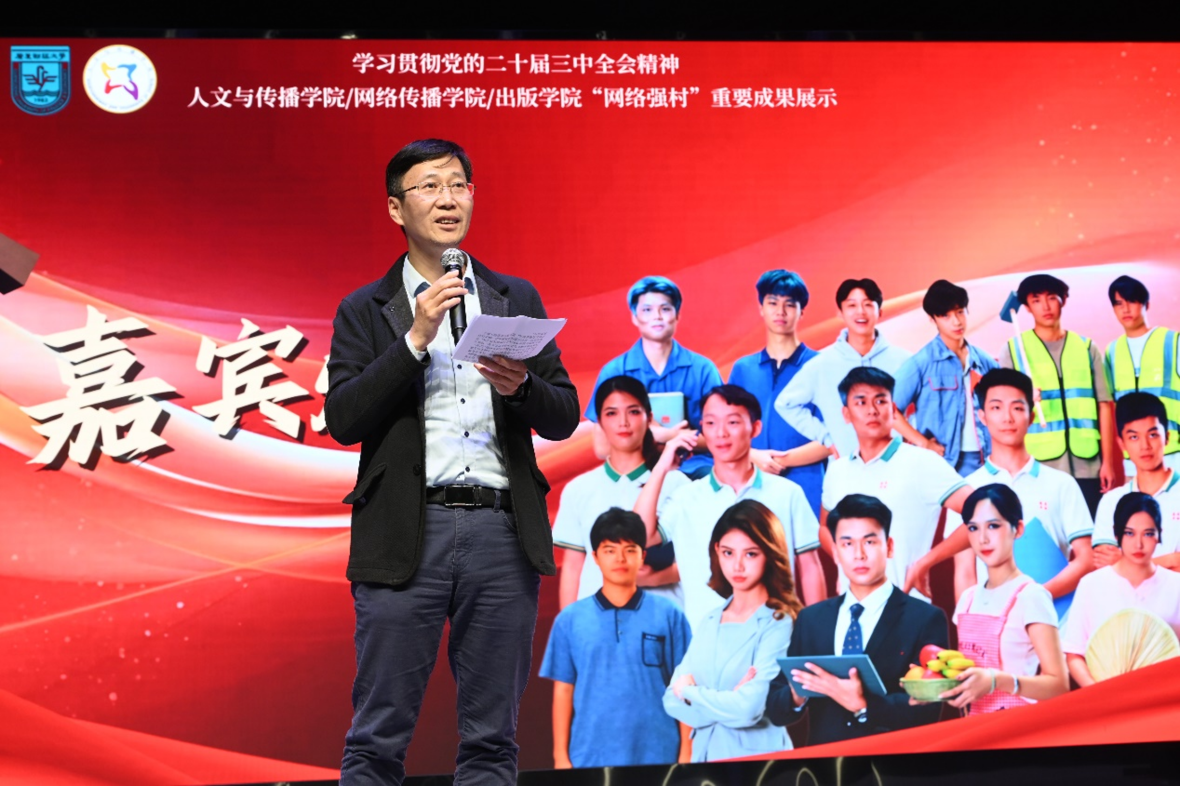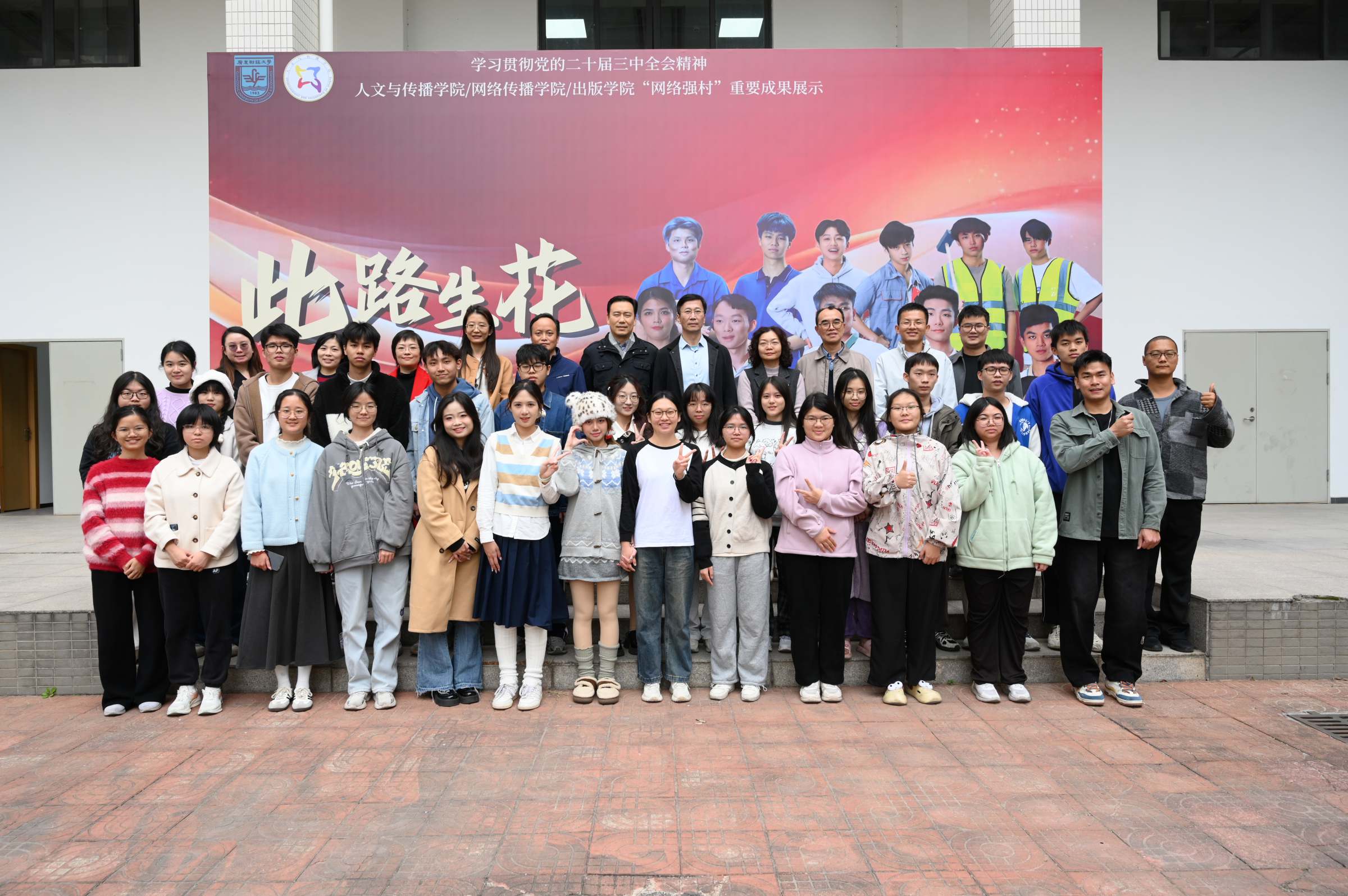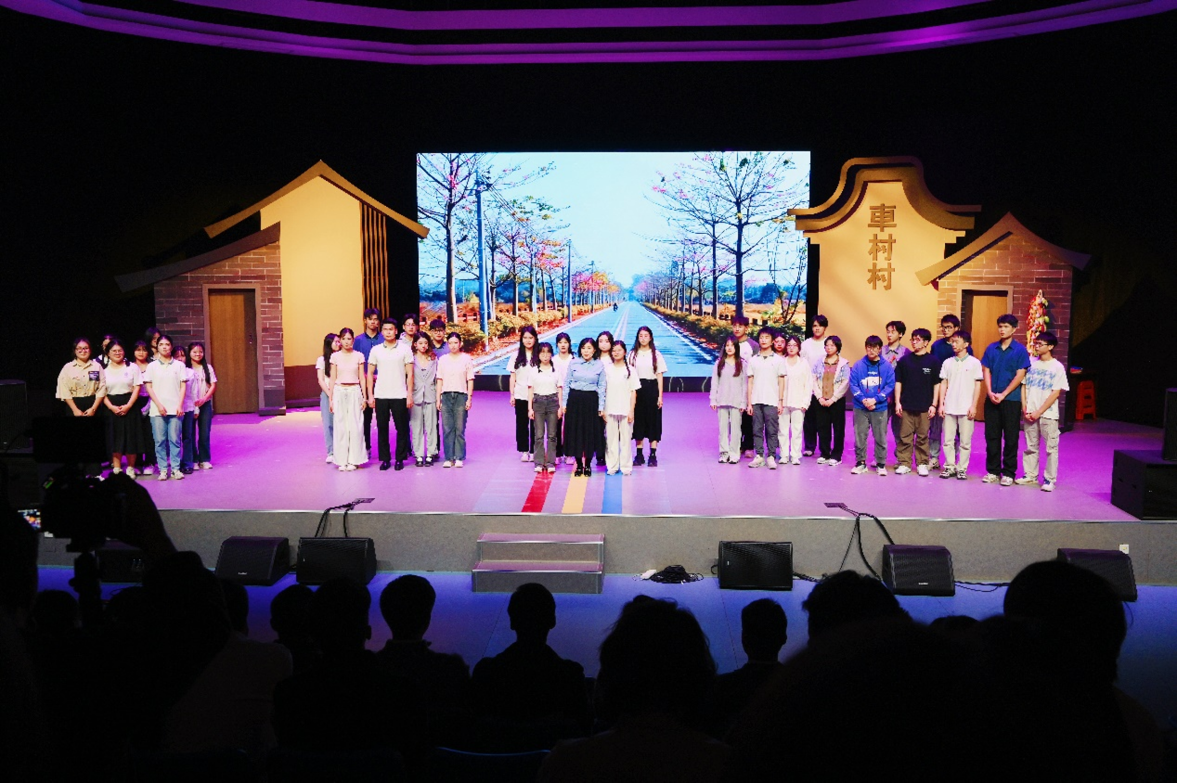 2024年12月27日晚,我校原创话剧《此路生花》在广东财经大学融媒体中心顺利演出。该剧是一部由我校人文与传播学院/网络传播学院/出版学院中国语言文学系师生自编、自导、自演的原创话剧作品,是我校创新网络强村模式、落实省委部署的“1310”工程、对接“百千万工程”、致力乡村振兴成果的具体体现。我校党委宣传部部长张鹏程,人文与传播学院/网络传播学院/出版学院党委书记于万红、副书记张传瑜,车村村党总支书记车碧锋、副书记车共平,平安保险首席招募官蔡嘉贤到场观看演出。