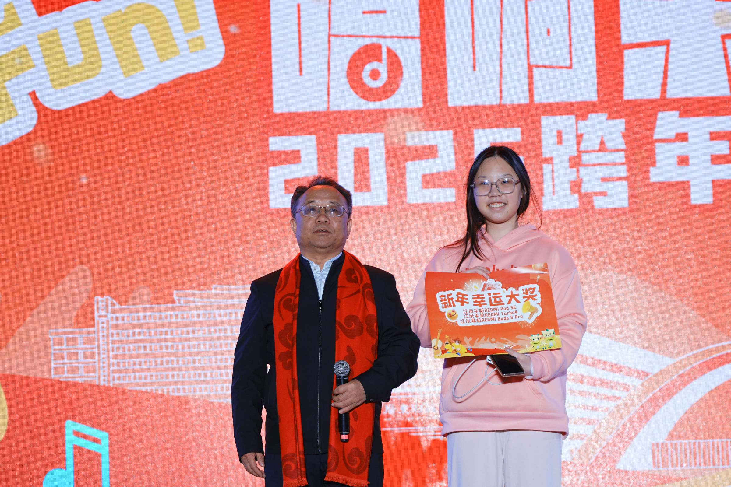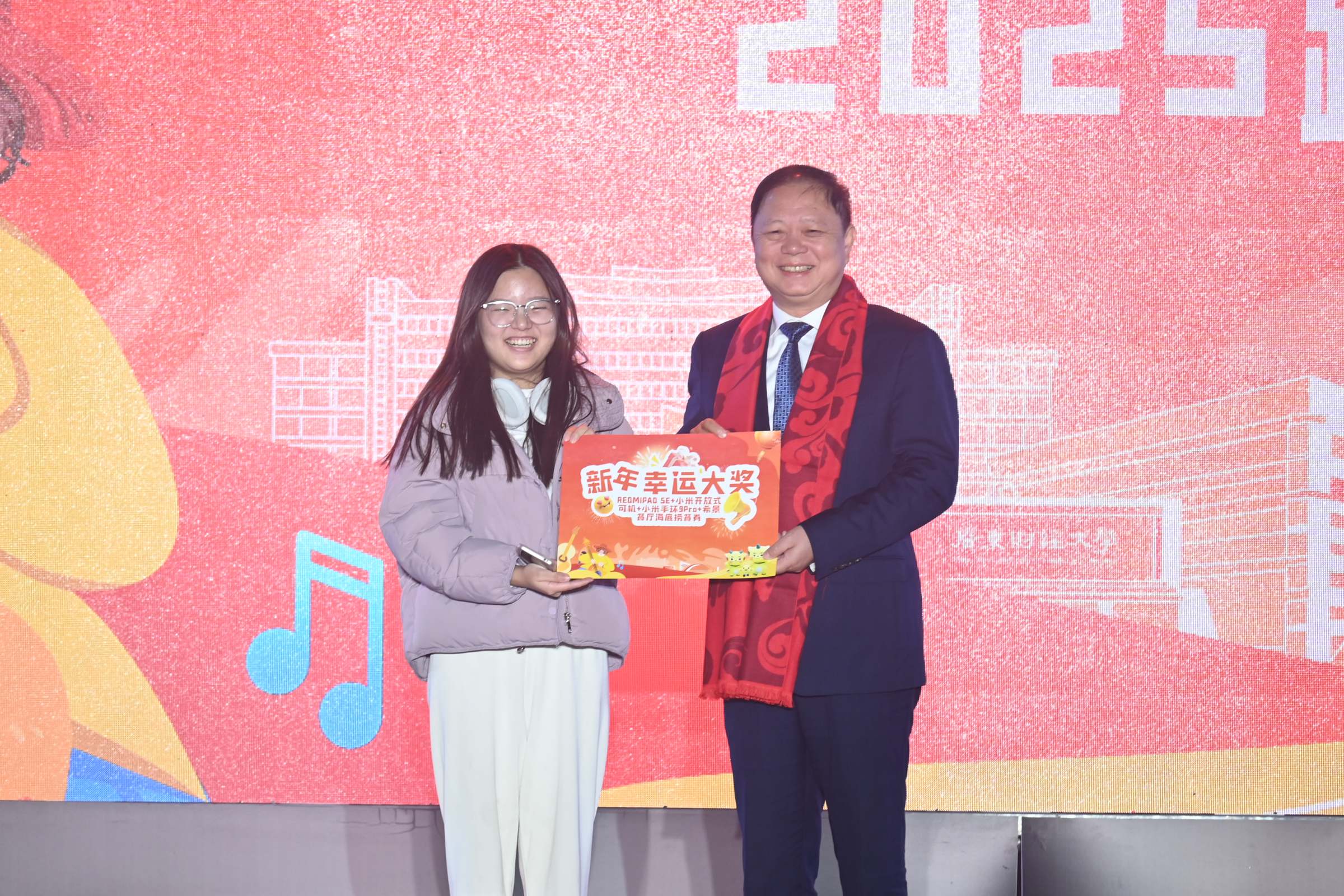晚会期间,广财的“铿锵玫瑰”--广财女子足球队成员们带着胜利的荣耀与喜悦,在歌会现场为同学们献上新年祝福。歌会随机抽取发放了新年礼品。于海峰、梁仲景抽取了新年幸运大奖,并为获奖的同学颁发了奖品。丰富、实用的礼品为同学们的2025新年增添了一份别样的惊喜,也送上了属于广财的新春关怀。
