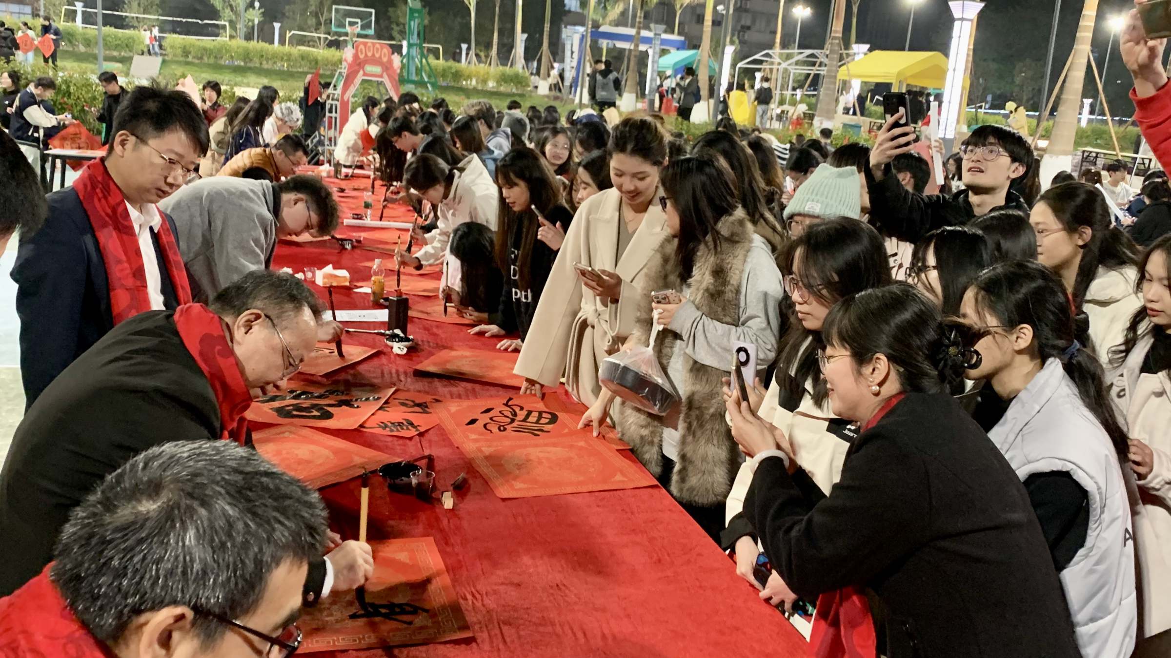 校工会在活动现场同期举办了书法活动。活动邀请了于海峰校长,罗贤甲副书记,知名书法家梁明霞女士,教职工书画协会会长黄陆洋,教职工书法爱好者杨长春、罗志强,艺术与设计学院专业教师、书法博士徐保民等为现场师生挥毫送福。参加活动的师生热情高涨,“万事胜意”“顺利上岸”“学业有成”……一张张满含殷殷嘱托、深深祝福的斗方、条幅当场写就,送到师生手中,表达了对2025新年的美好祝愿。