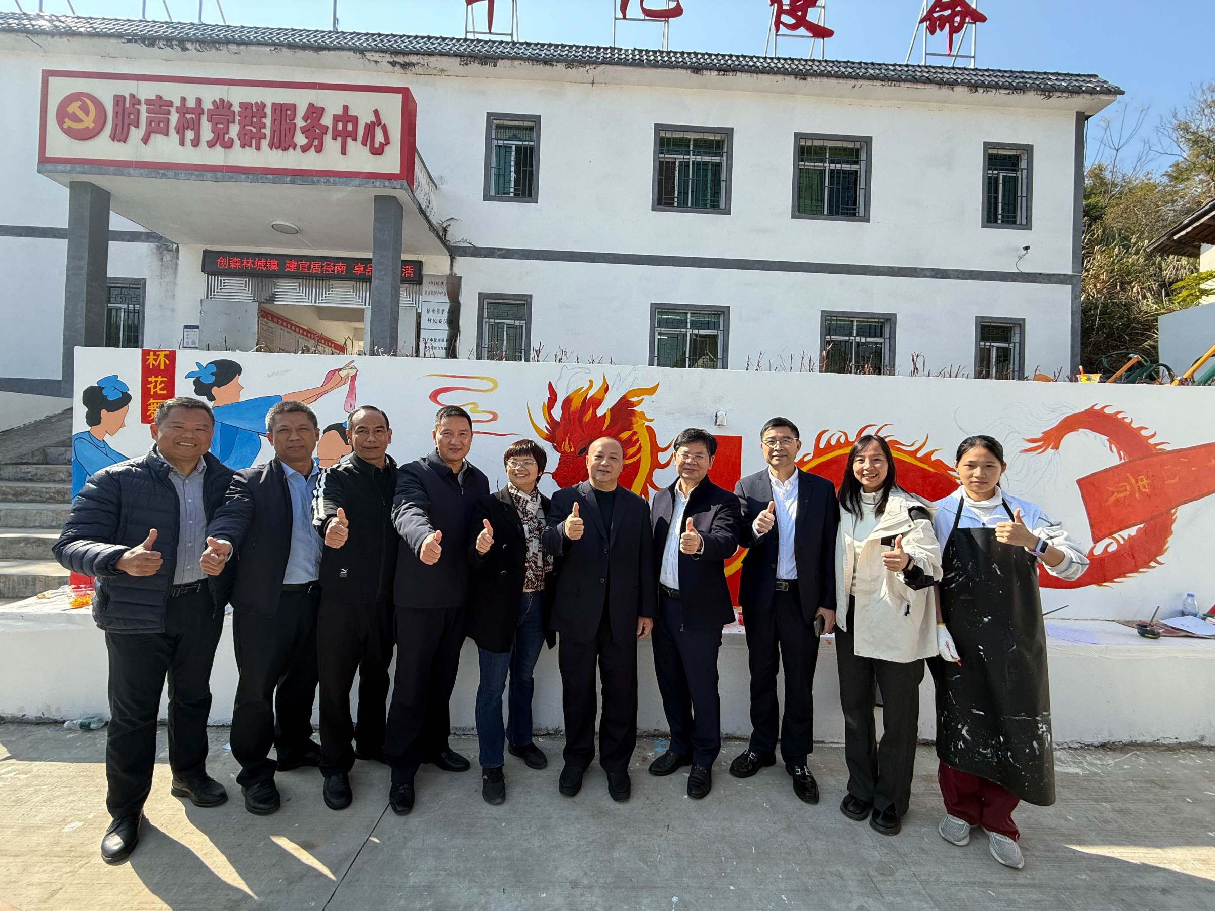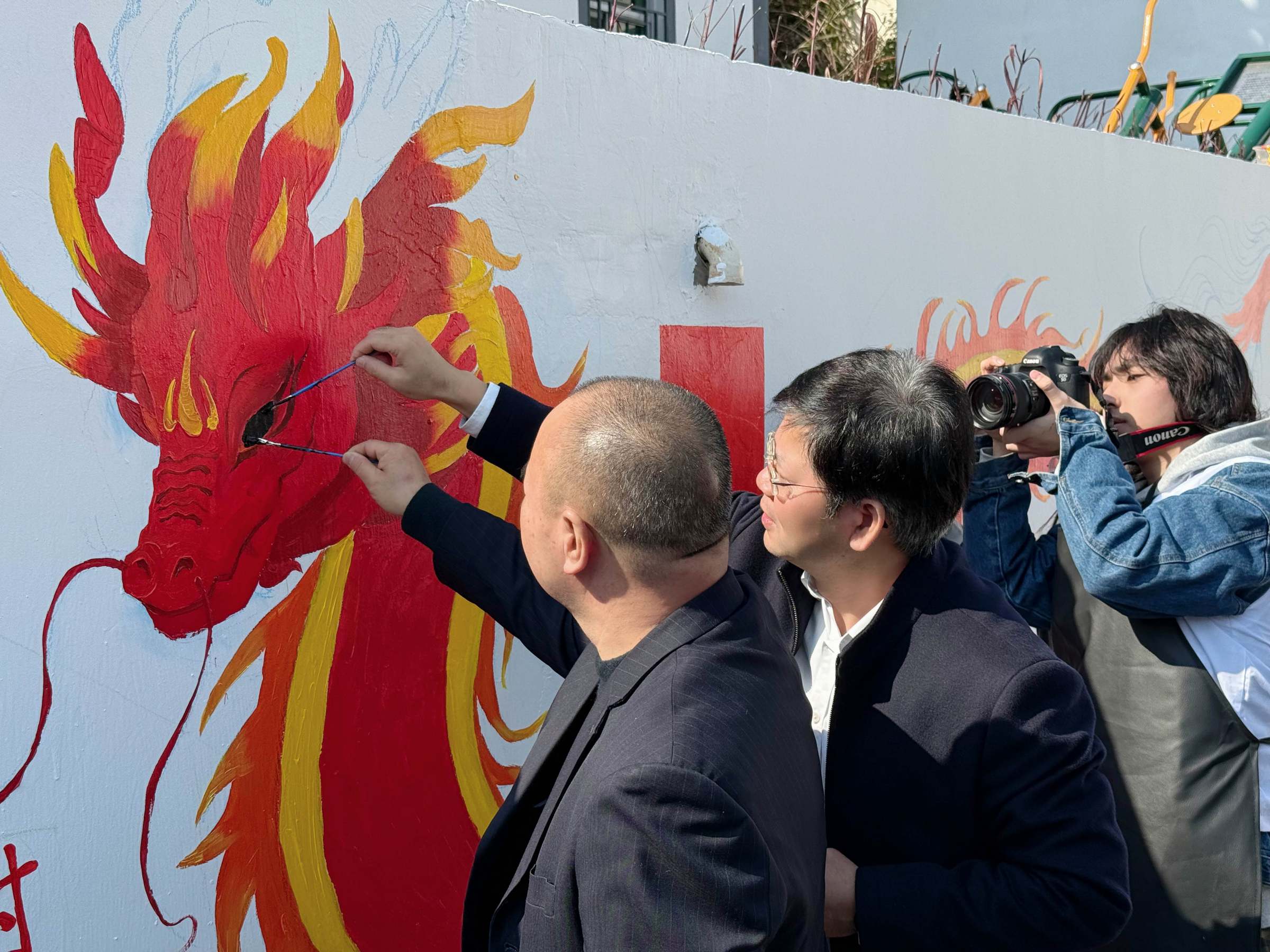罗贤甲对同学们的精彩设计和为乡村振兴做出的努力给予了充分肯定,并在现场和师生一起为墙绘的中国龙图案上色。他表示,此次寒假社会实践活动有着非同寻常的意义,给胪声村的村容村貌带来了变化,用实际行动助力了乡村振兴工作,展现出广财学子良好的精神风貌和责任担当,是当代大学生践行初心使命、不负时代、不负人民的具体体现,也是当代大学生将自身所学与社会实践充分结合的有力证明。罗贤甲一行与同学们亲切合影,共同记录这一难忘的时刻。