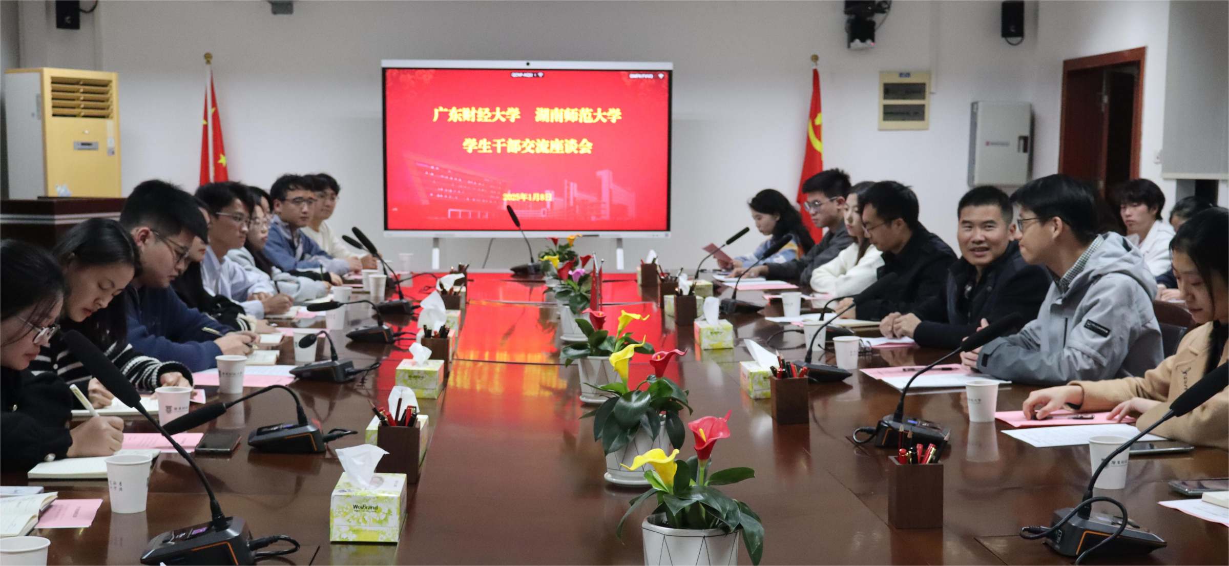 1月8日,我校与湖南师范大学在佛山校区开展学生骨干交流座谈会。在佛山校区管委会(省市共建办)、三水区白坭镇共建背景下,这是湖南师范大学师生连续两年到访我校佛山校区和我校师生开展交流活动。我校省市共建办副主任曾忠诚、校团委副书记薛云峰,湖南师范大学辅导员喻帅、易晓,两校学生骨干代表30余人参加座谈会。会议由省市共建办陆万权主持。