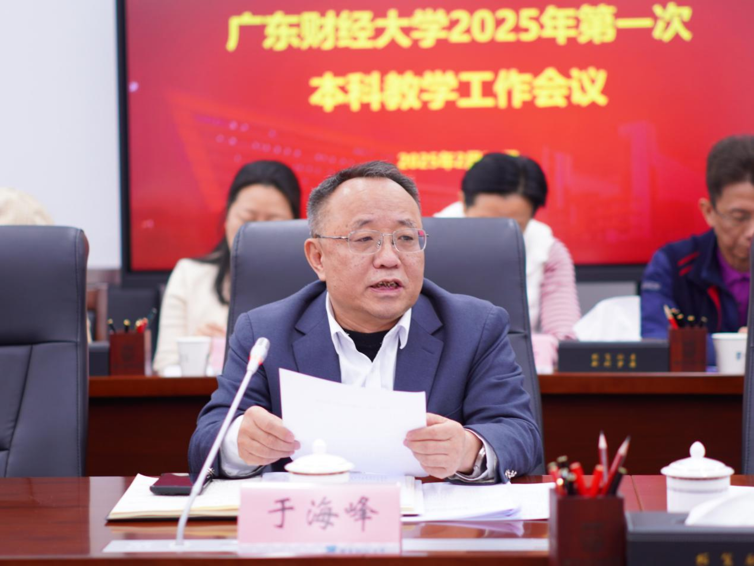 于海峰在讲话中强调,一是要抢抓智能时代先机,加快推进本科教学数字化转型。此次会议发布了《广东财经大学本科教学数字化转型“143”行动方案》,标志着我校在这一领域的积极探索和战略布局取得了成效。各单位要深入贯彻落实国家关于教育数字化转型的战略部署、全省教育大会精神和我校行动方案的具体步骤,充分认识其重要性和紧迫性,同时也要了解学习其他兄弟高校好的经验做法,知己知彼,对标对表,确保各项工作取得实效。二是要修订人才培养方案,持续提升人才培养质量。此次人才培养方案修订是落实数字化转型方案的重要内容,是学校本科人才培养紧密对接人工智能时代发展需求的重要举措。各单位要按照教务处的统筹部署,深入调研、集思广益,扎实做好培养方案的论证和制定等工作。三是要全力以赴,高质量完成本科教育教学审核评估工作。各单位和全体师生务必提高政治站位,强化责任担当,凝聚全员共识,以刀刃向内的勇气推进评建工作,对评建中发现的问题开展穿透式自查,确保问题整改见底清零。四是要高度重视开学的各项准备工作,确保本科教学平稳有序。新学期即将开始,各单位要加强组织管理和沟通协调,提前做好教学安排,加强教学设施建设,完善应急预案,确保教学工作平稳有序进行。