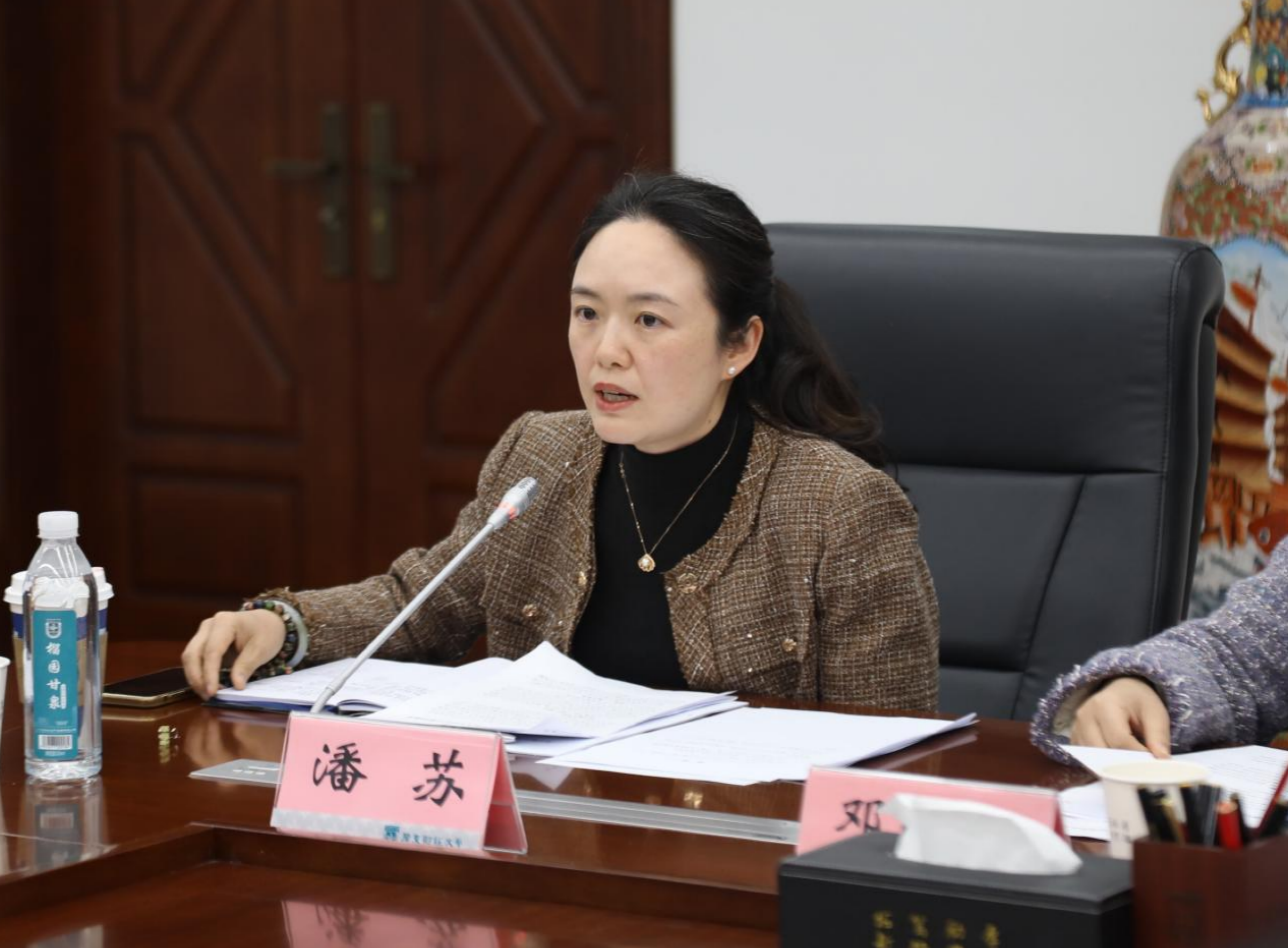 教务处副处长邓欣欣就本科教育教学审核评估工作的推进情况和本学期自评自建重点工作任务进行了说明和布置;教务处副处长陈发健通报了2024-2025学年第一学期期末考试情况,并对新学期开学的教学检查、学生选课、报到注册等准备工作进行了安排。