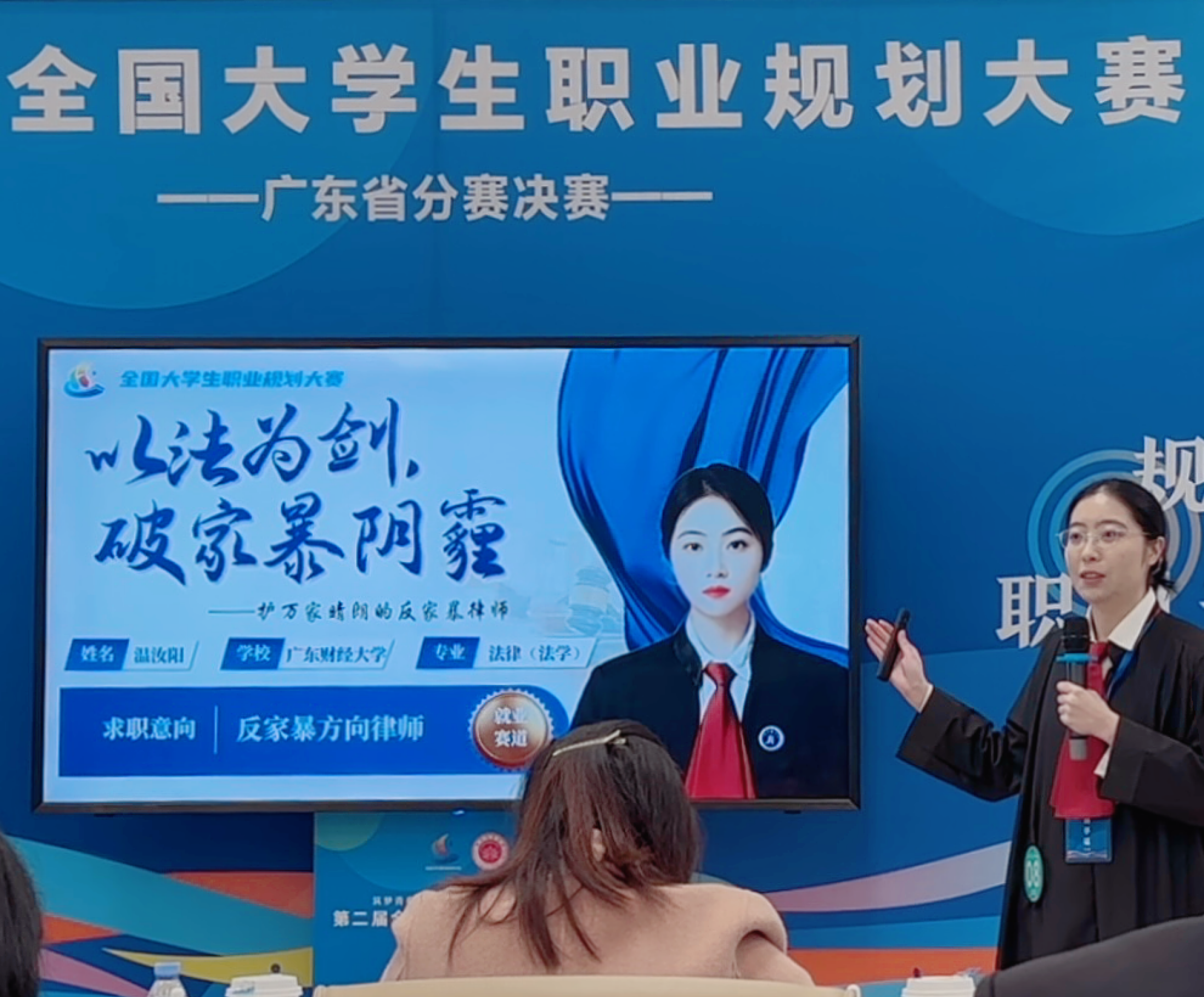 学校高度重视本次比赛。赛前,学生就业指导中心多次联合学院邀请专家为选手开展路演演练,从主题陈述到综合面试,每个环节都经过反复打磨。学生就业指导中心副主任梁铿浩到决赛现场指导、观摩比赛并与参赛学生指导老师亲切交流。最终,来自法学院的温汝阳获得省赛银奖,来自会计学院/智能财会管理学院的陈怡冰,法学院的肖梓怡、江晋豪,艺术与设计学院的谢梓瑶,湾区影视产业学院的潘小宇5位同学获得省赛铜奖。获奖项目覆盖军队文职、法律援助、播音传媒等领域,充分展现了学校专业建设与社会经济发展的紧密对接。