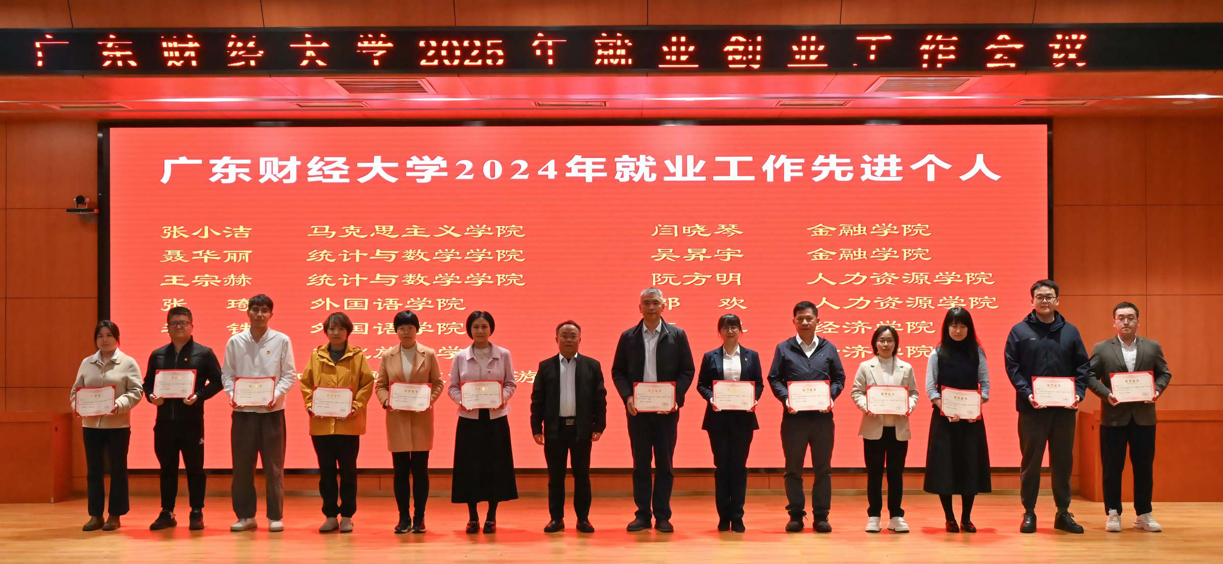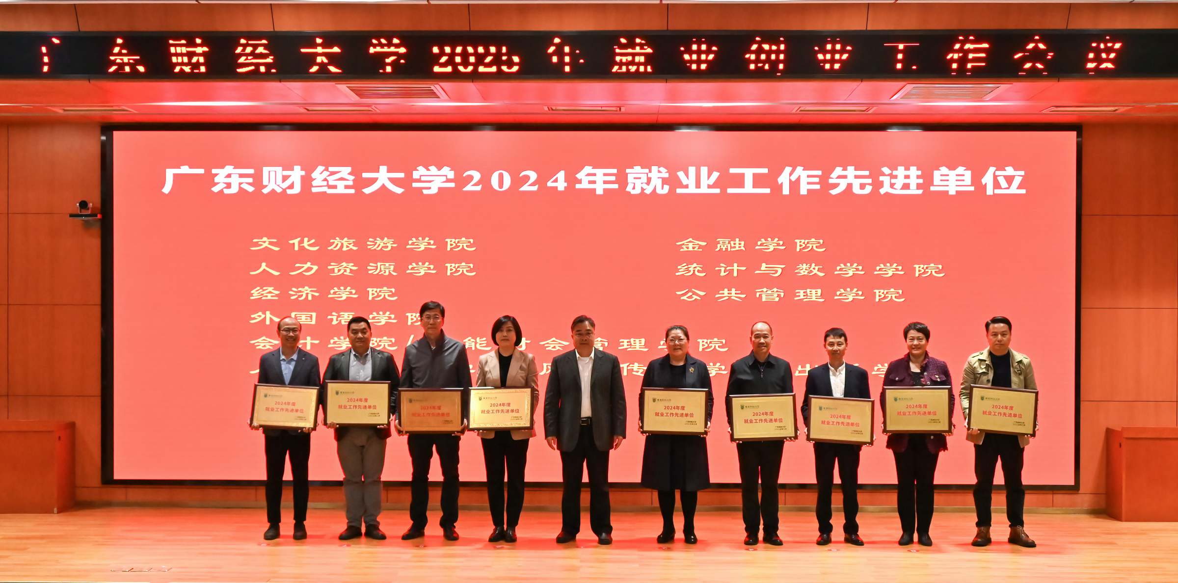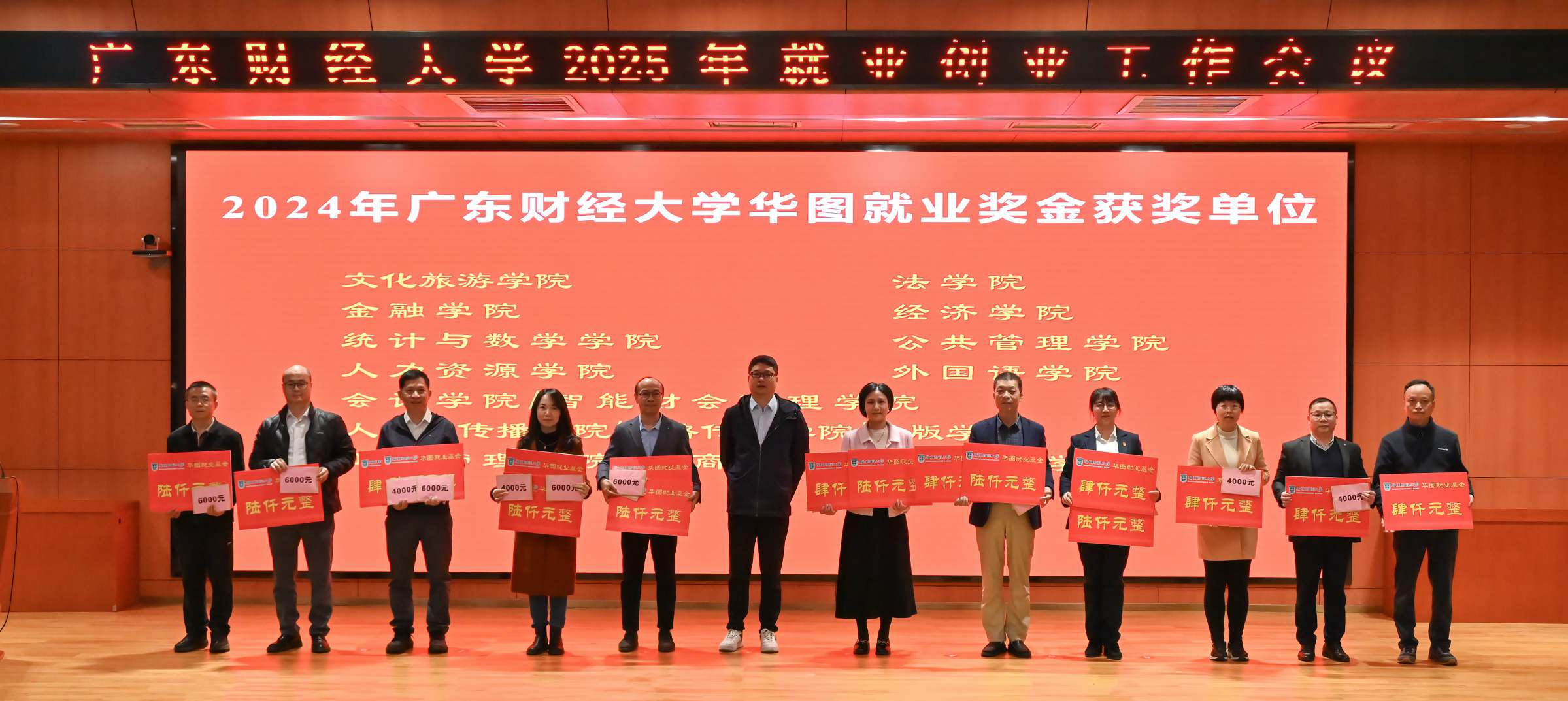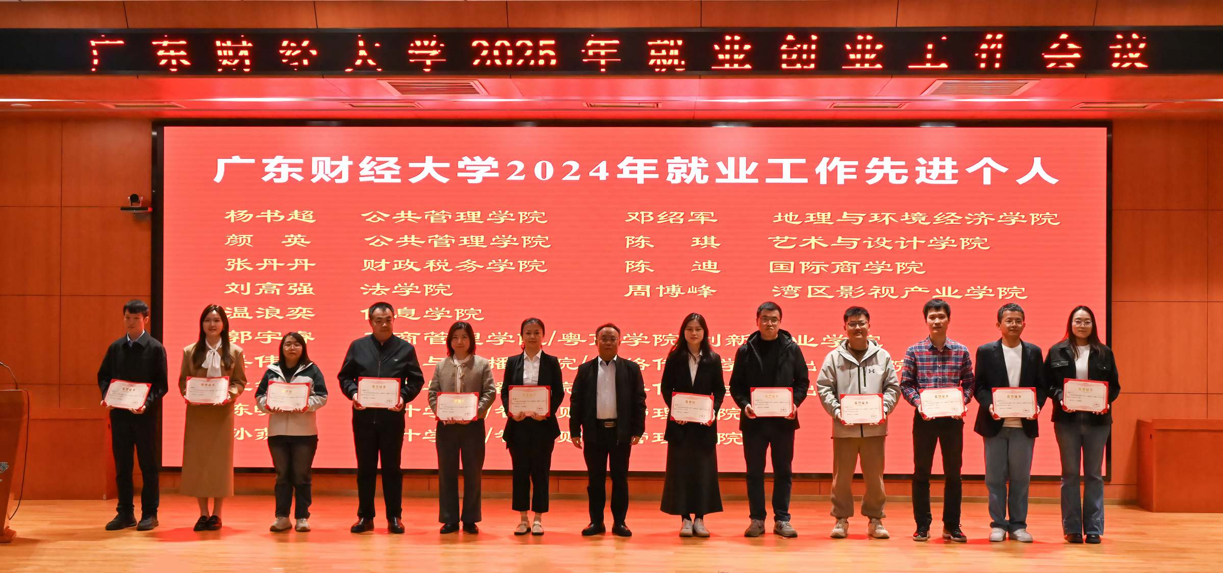 会上,张凯宣读《关于表彰2024年就业工作先进单位和先进个人的决定》,郑贤操为2024年就业工作先进单位颁发奖牌,于海峰为就业工作先进个人颁发荣誉证书,华图教育广东运营总监王真为2024年就业工作优秀单位颁发“广东财经大学华图就业奖金”。校友办主任段丹、经济学院院长聂普焱、人力资源学院党委书记黄东阳、金融学院党委副书记吴少莹、文化旅游学院教师代表潘博成、会计学院/智能财会管理学院辅导员孙燕媚分别上台作就业工作经验交流分享。智联招聘华南大区雇主品牌研究中心总监黄朴作2025年就业形势解析。