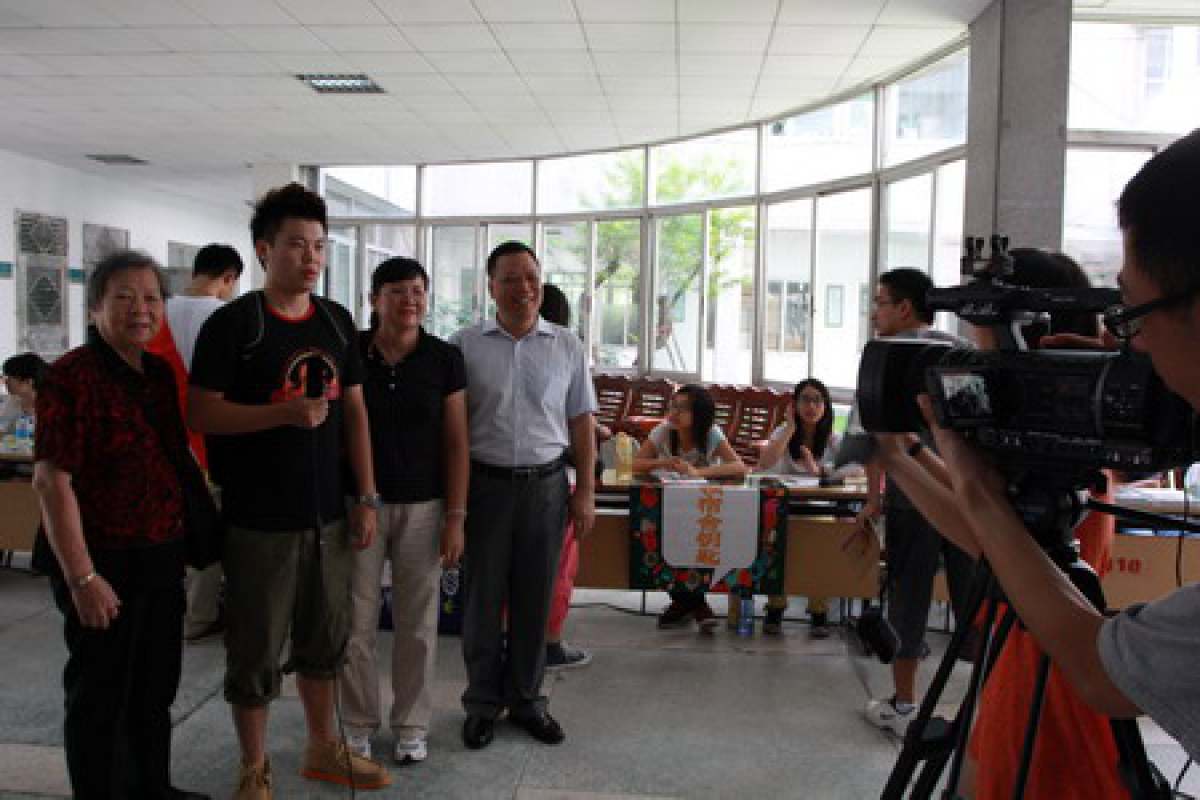 9月4日上午10时30分,校本部图书馆一楼大厅,一名新生面对摄像机镜头向自己的妈妈献上了一吻。如此特别的迎新方式,是人文与传播学院为2012级播音与主持艺术专业及广播电视编导专业新生准备的。人文学院院长涂争鸣、副院长马持节等领导及老师等到现场看望了前来报到的新生。