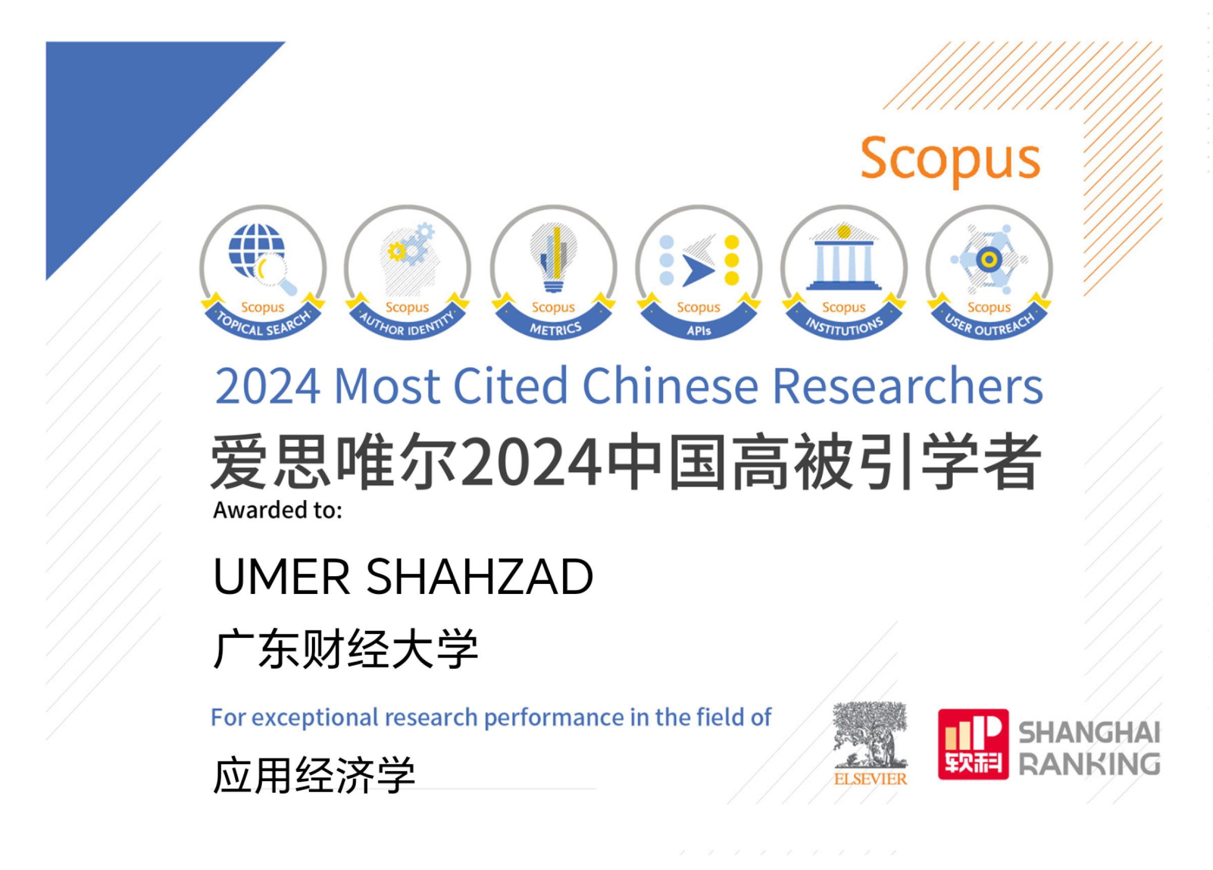 乌梅尔( Umer Shahzad),男,广东财经大学经济学院教授,曾就职于罗马尼亚布加勒斯特大学和中国安徽财经大学。2022、2023年入选“中国高被引学者”榜单,2022年入选“全球前2%顶尖科学家”榜单;担任SSCI收录的《Environment Development and Sustainability》《Geological Journal》等期刊副主编。近年在《Technological Forecasting & Social Change》《Energy Economics》《Renewable and Sustainable Energy Reviews》等重要学术期刊发表学术论文近100篇。主要研究方向:环境经济学、生物经济学、能源金融、绿色经济和环境可持续性。