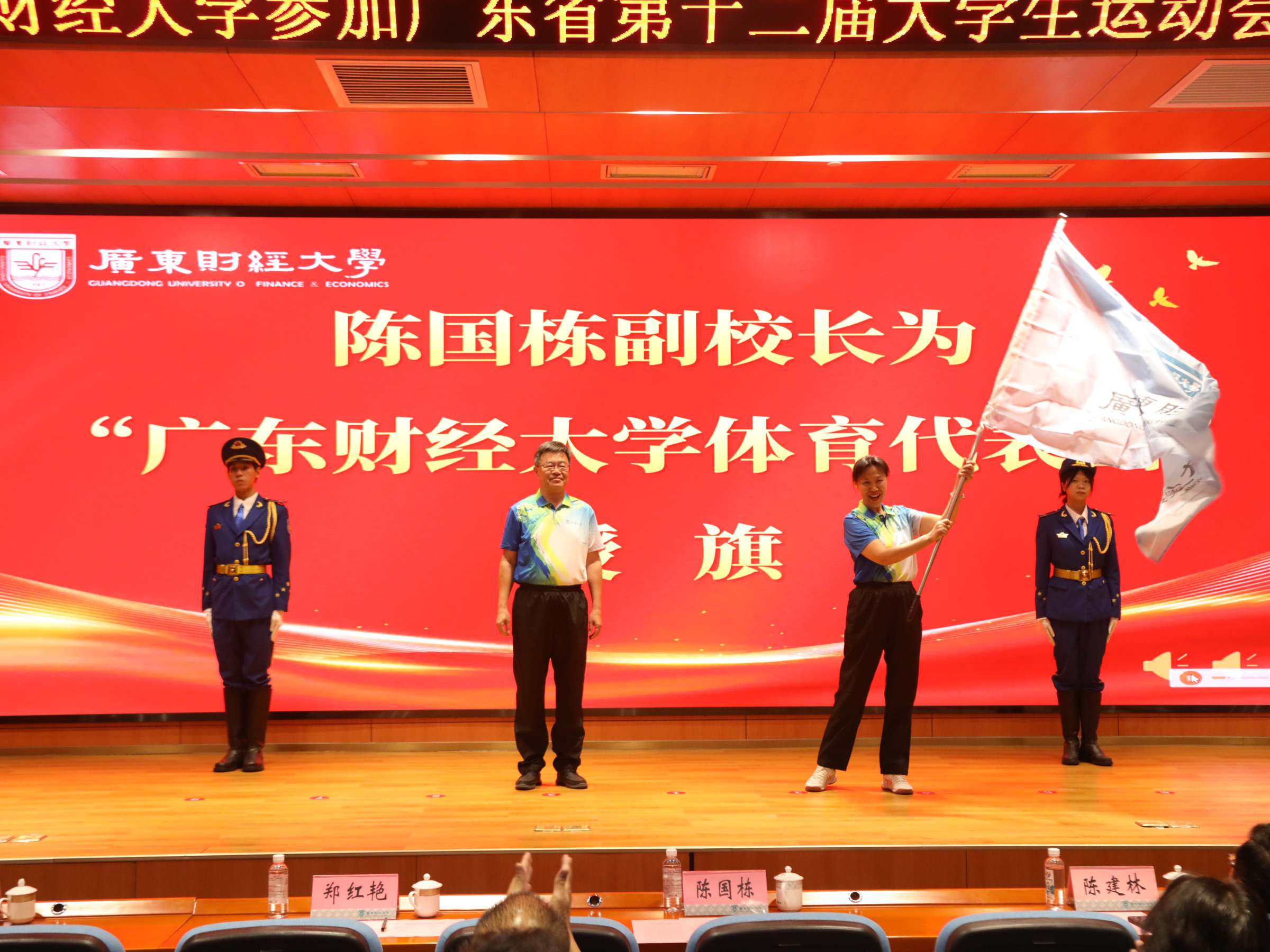 陈国栋代表学校向即将出征的全体运动员表示热烈的祝贺,向精心指导的教练员和默默奉献的保障团队致以诚挚的感谢。他回顾了我校各代表队过去一年的备赛历程和取得的优异成绩,肯定了代表团的各项筹备工作,并提出三点期望:一要弘扬“勇攀高峰”的进取精神,用实际行动诠释“更快、更高、更强——更团结”的奥林匹克格言。二要传承“众志成城”的协作精神,彰显广财人的团队力量、协作魅力和集体荣光。三要彰显“文行忠信”的文明精神,尊重对手、敬畏规则、自信谦和,展现新时代广东青年的良好风貌。