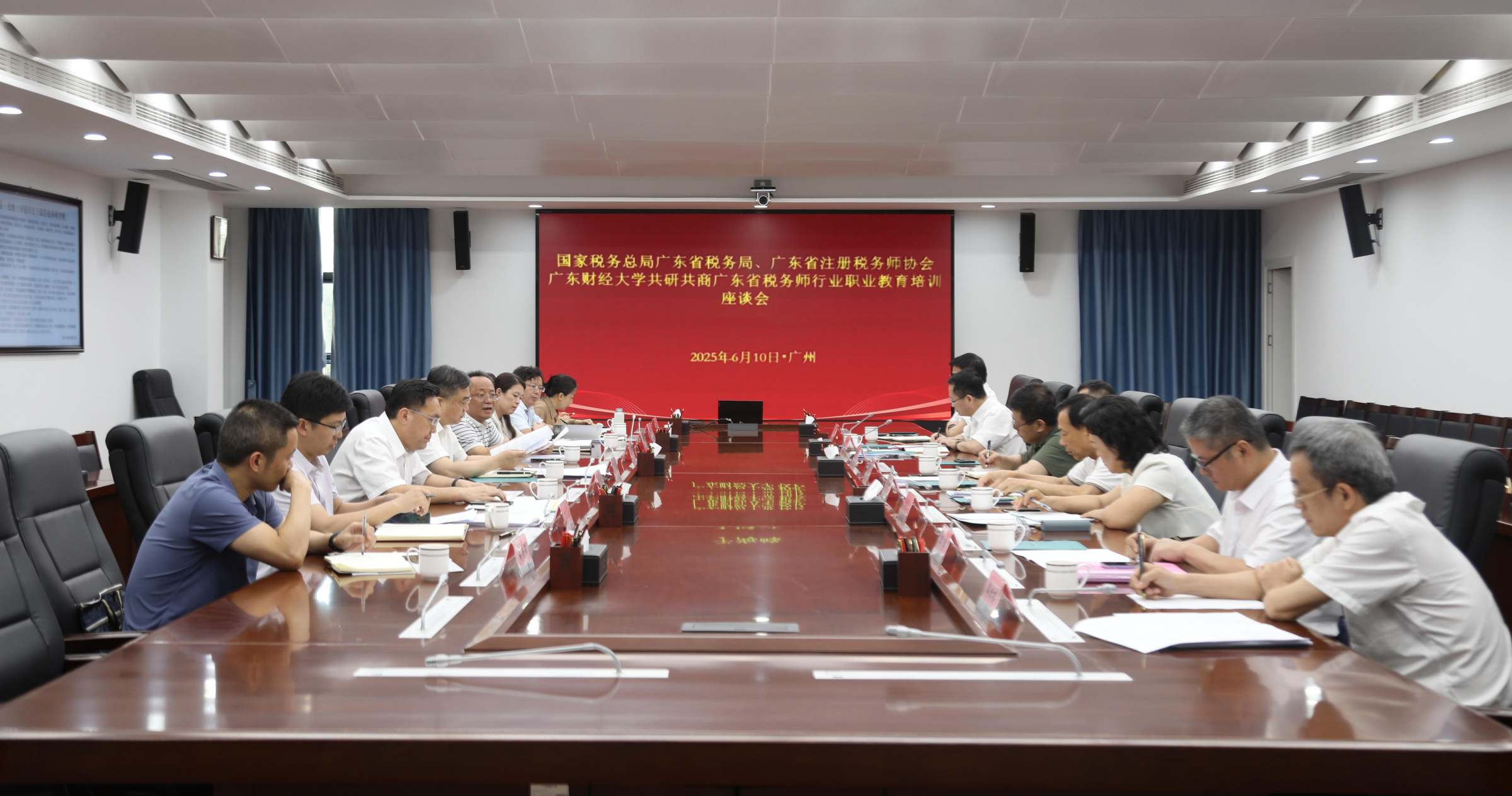 6月10日,我校与广东省注册税务师协会在广州校区同德楼第一会议室召开座谈会,就税务师行业教育培训工作、高端人才培养、合作课题研究以及税务师资格考试等内容进行共研共商。广东省注册税务师协会会长王义平、副会长赵平,广东省注册税务师行业党委副书记兼副会长高峰、秘书长卢伟雄、副秘书长傅绪桥,国家税务总局广东省税务局纳税服务处二级调研员郭葵、教育处副处长叶绿宽,广州市注册税务师行业党委副书记、广州市注册税务师协会副会长张焕英,我校党委书记郑贤操、校长于海峰以及相关部门、学院负责人出席会议。会议由卢伟雄主持。