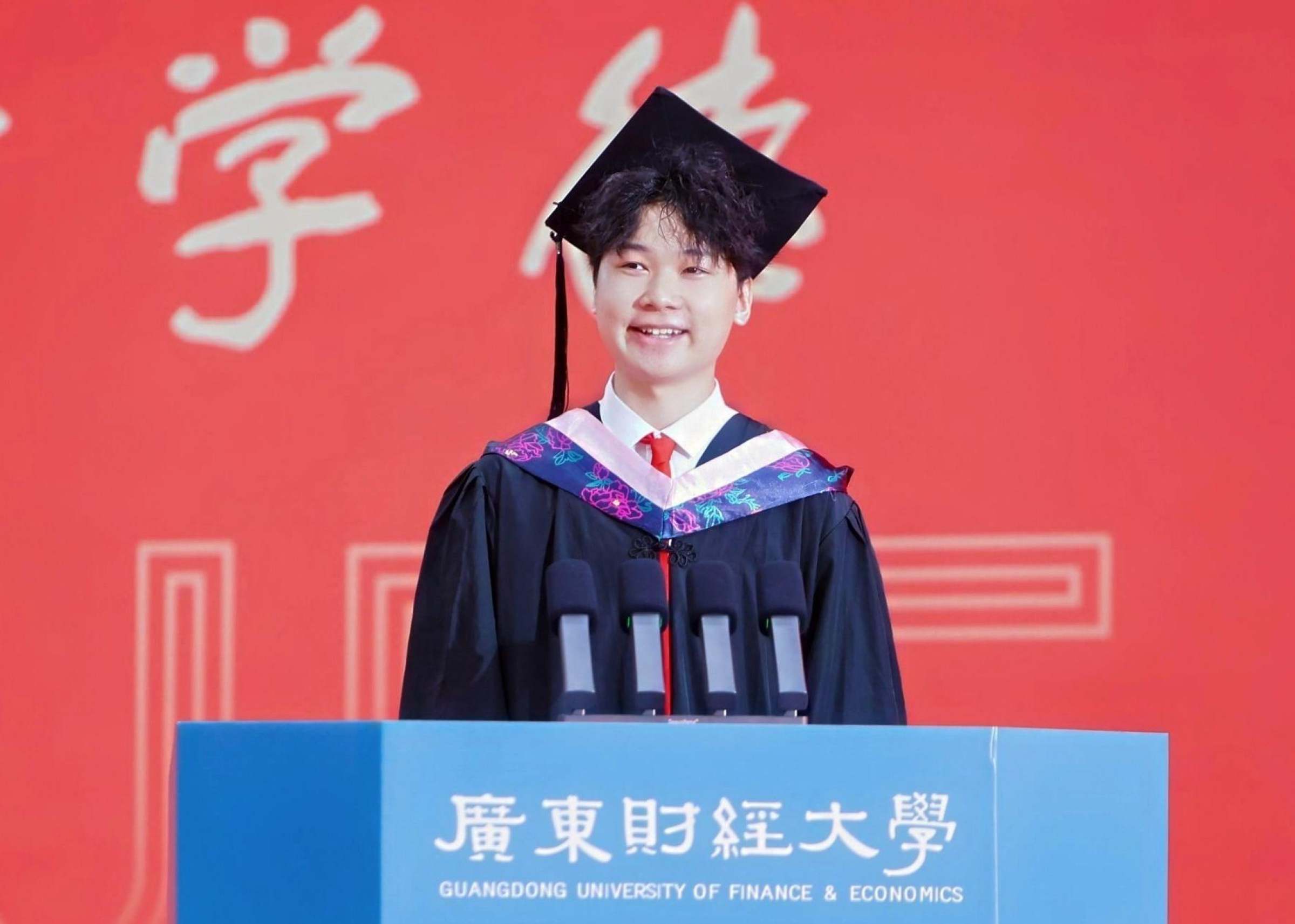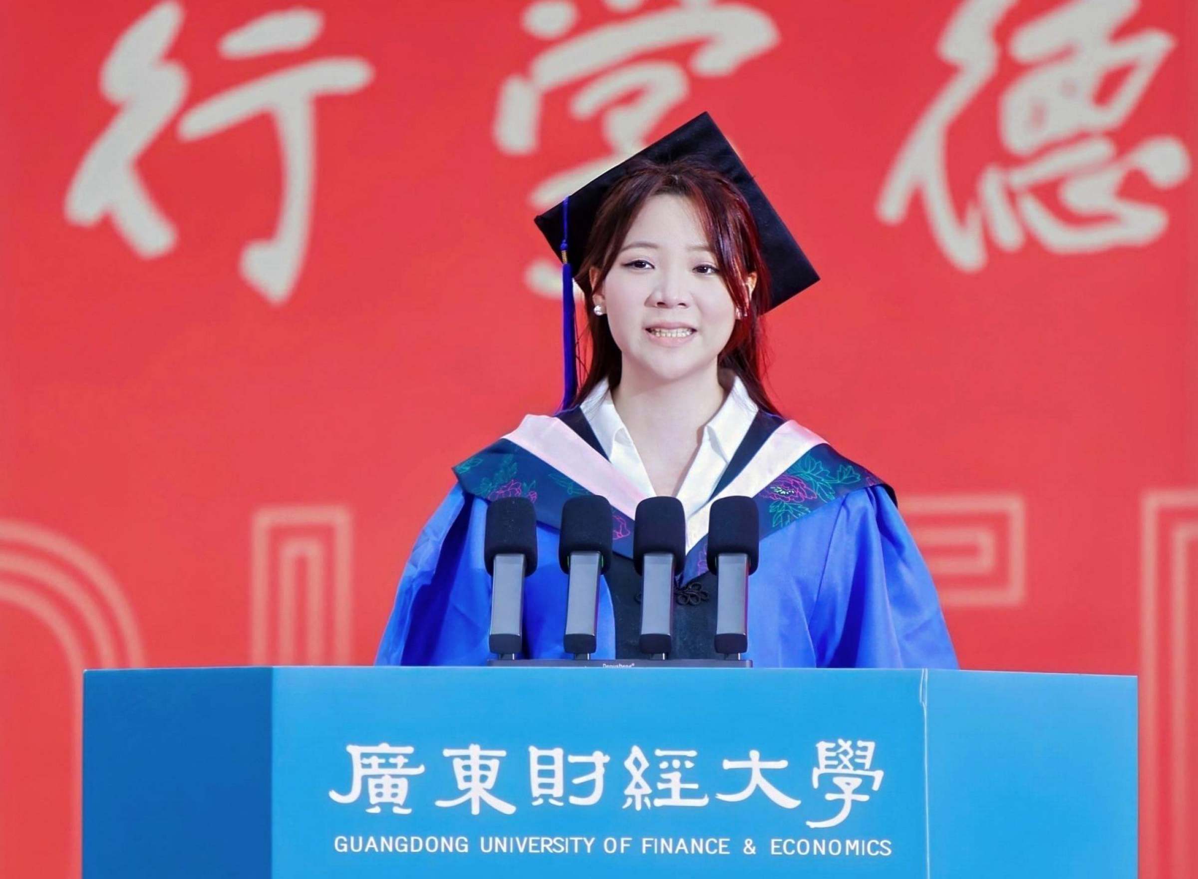 经济学院陈奕森在上午场的典礼上作为本科毕业生代表发言,回顾了大学四年在科研竞赛道路上努力探索的故事,并号召同学们“敢于创新、回馈社会,跑出广财青年的加速度”。人文与传播学院李宇诗在下午场的典礼上作为本科毕业生代表发言,分享了社会实践、创新创业的经历,深情感谢了学校的教育培养和师长的悉心教导。