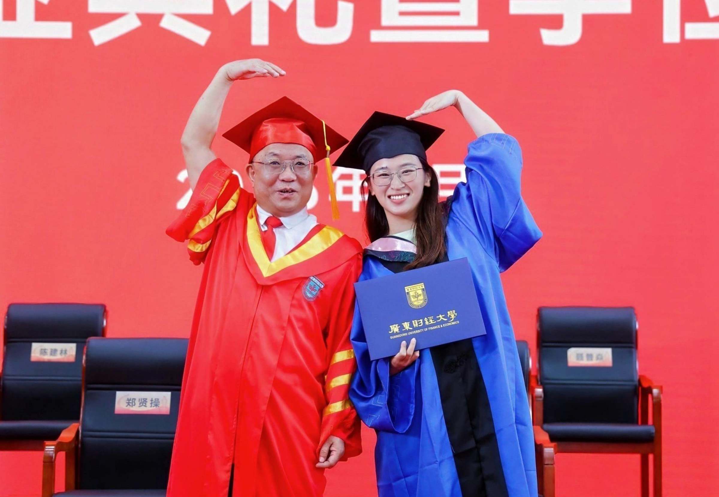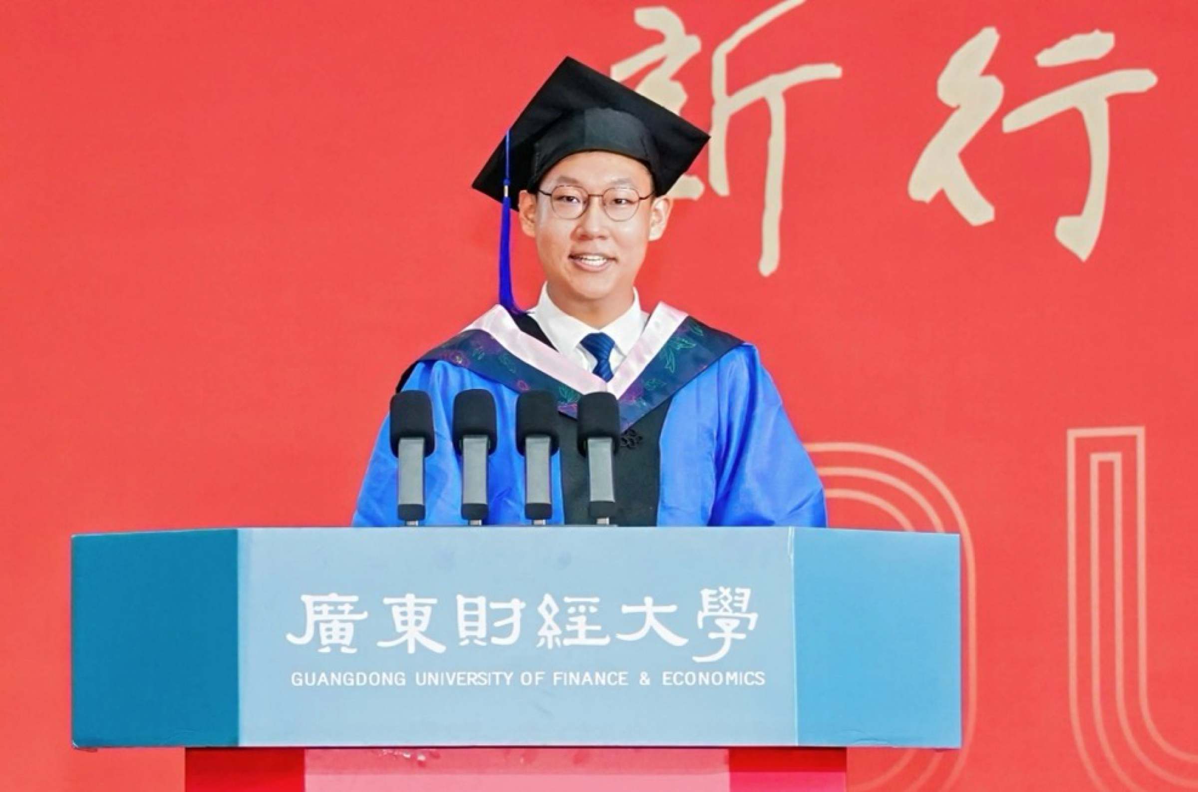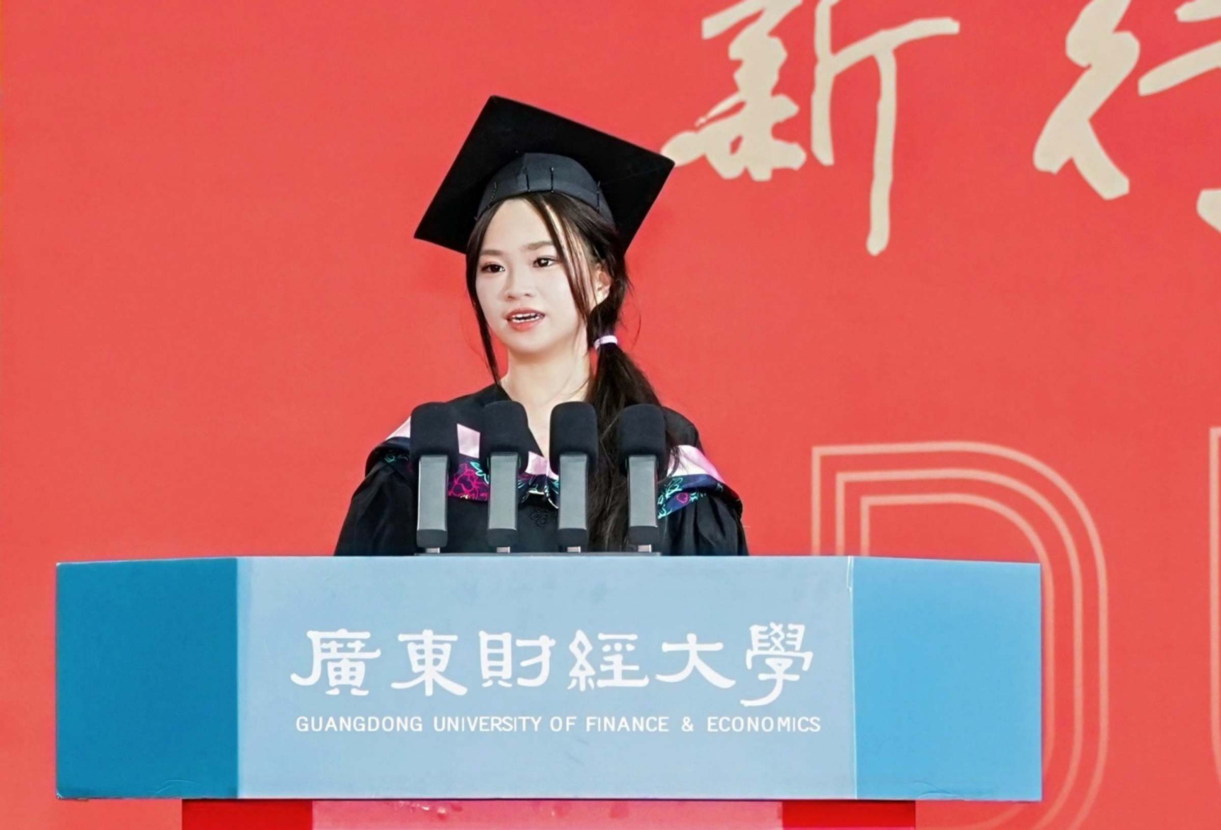 金融学院张梦凌在上午场的典礼上作为毕业研究生代表发言,分享了在广财两年的成长感悟,并希望同学们传承团结奋斗的榴园精神,在各行各业闪耀广财人的光芒。法学院武汶浩在下午场的典礼上作为毕业研究生代表发言。他感叹学校近年来日新月异的变化,表达对未来奔赴星辰大海的美好心愿。