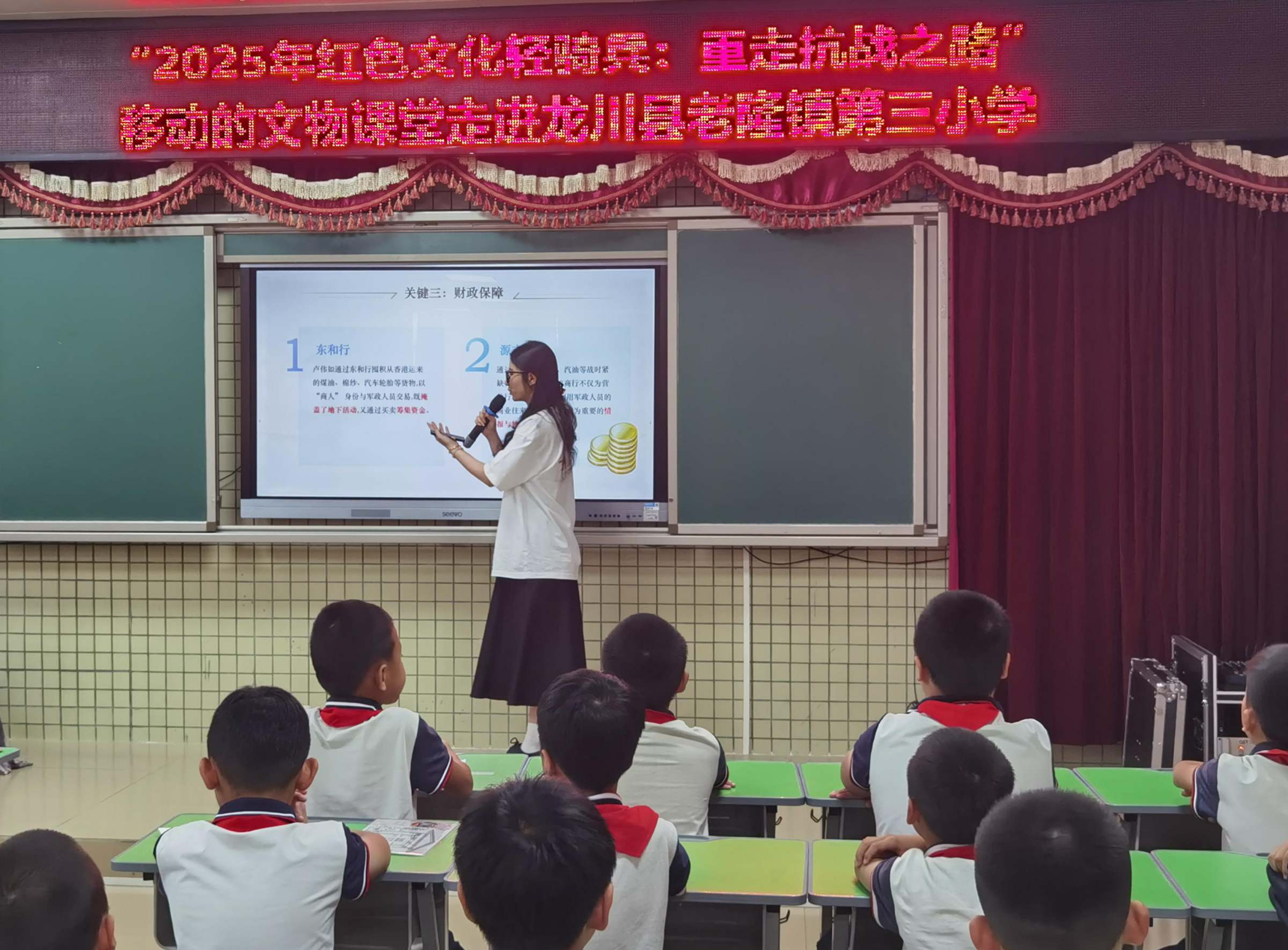 7月4日,“2025 红色文化轻骑兵:重走抗战之路”系列活动之“移动的文物课堂”走进河源市龙川县老隆镇第三小学。广东革命历史博物馆金牌讲解员黄家圆、广东财经大学马克思主义理论专业2023级研究生何胤化身“历史讲述者”,通过沉浸式课程、文物故事分享及广播剧体验等形式,带领师生重温1941年香港秘密大营救的惊险历程。