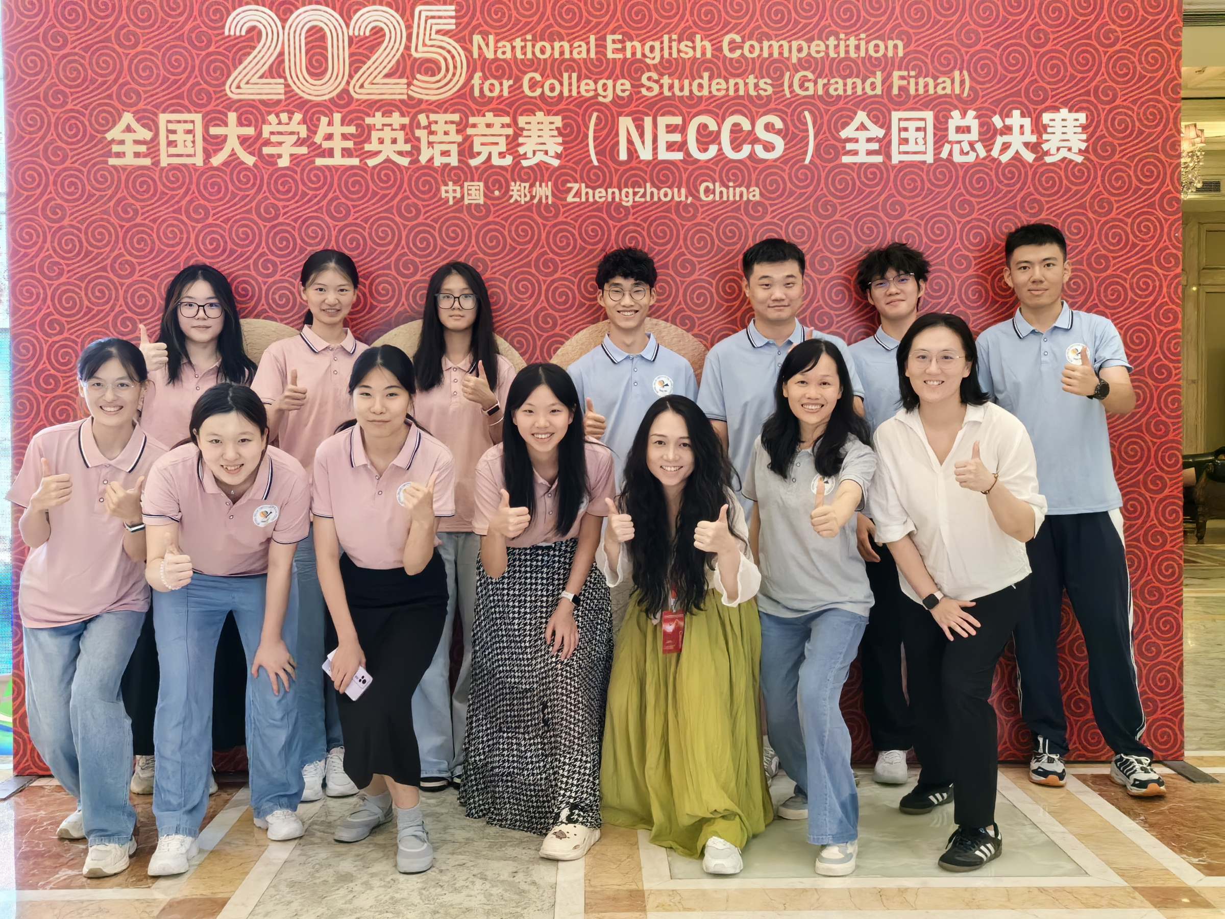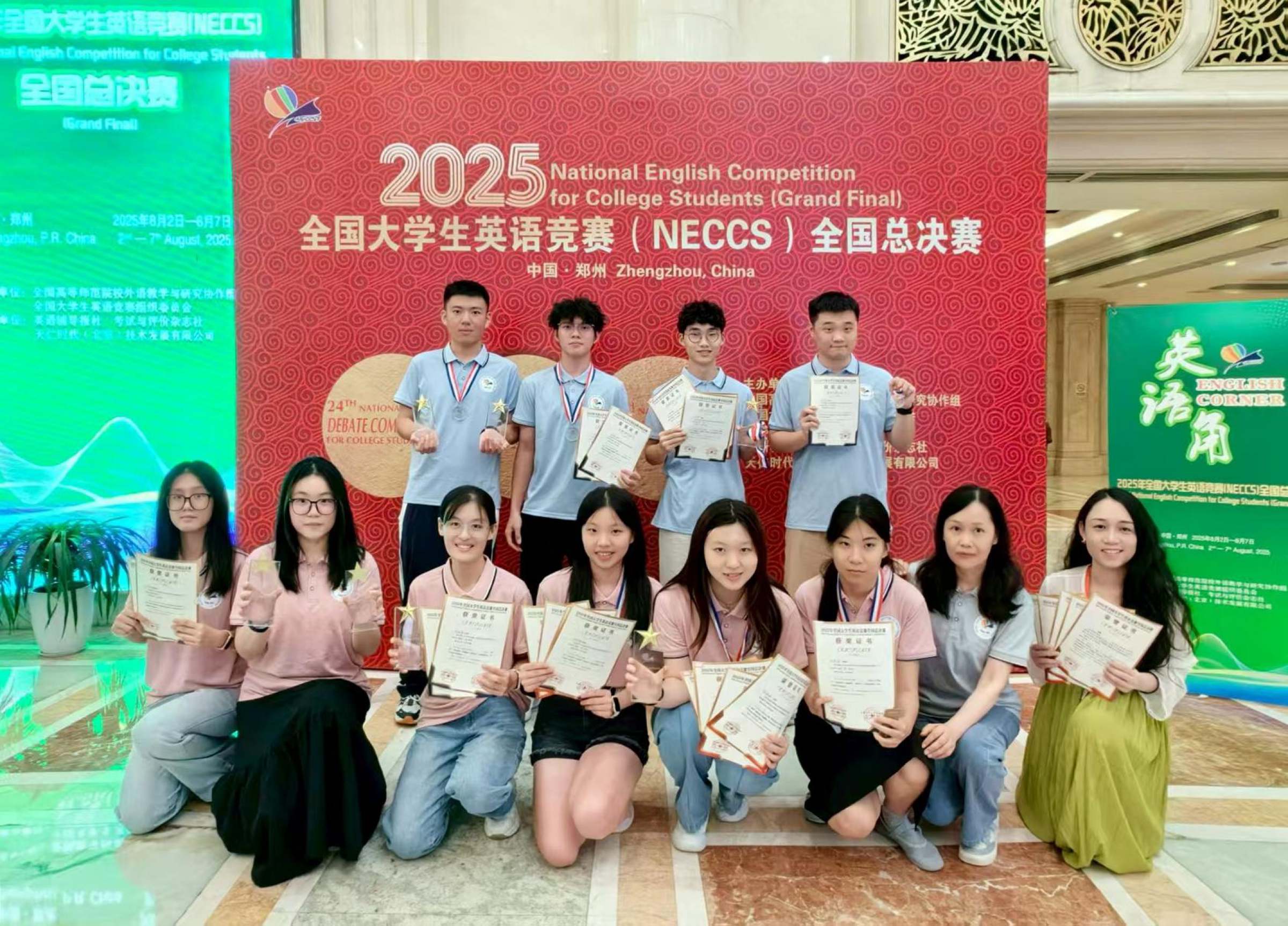 8月2日至7日,2025年全国大学生英语竞赛(NECCS)全国总决赛在河南省郑州举行。我校作为广东赛区赛事承办高校,组织省内9所高校的11名优秀选手参加本次全国总决赛。经过激烈角逐,广东代表队选手斩获演讲比赛一等奖、风采大赛一等奖、辩论赛一等奖、最佳个人表演奖、最佳辩手、最佳主持人等奖项28项,创造了广东队近年参赛的最佳成绩。其中,11人次获演讲奖项,包括一等奖4项、二、三等奖各3项、优秀奖1项;7人次获得风采大赛奖项,包括一等奖1项、三等奖2项、优秀奖4项;3人获辩论赛一等奖;选手们还获得最佳个人表演奖和最佳辩手各1项、最佳主持人2项、优秀参赛选手3项。我校乔兴兰老师作为该项赛事的领队老师,获评“优秀指导老师”。