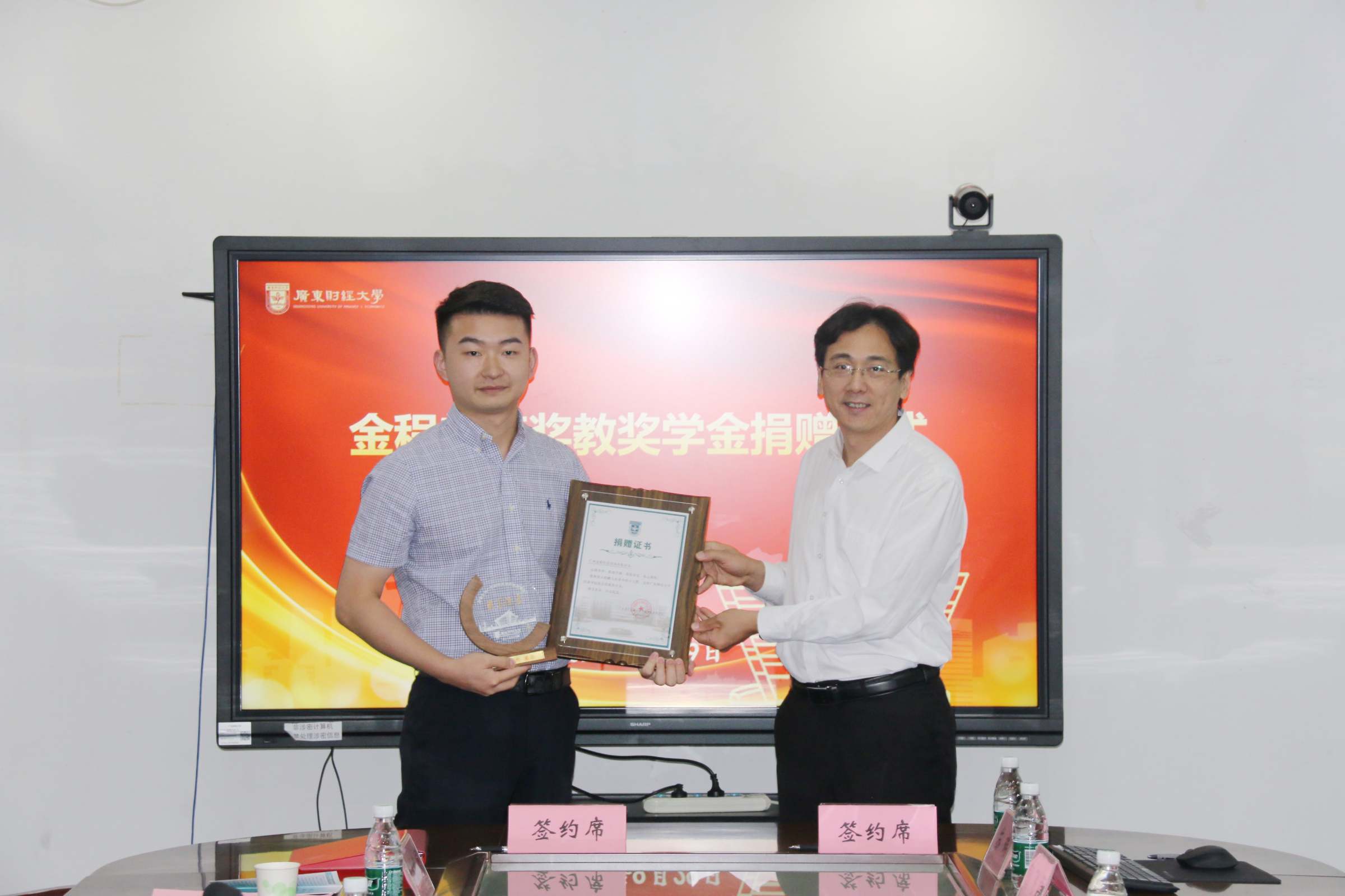 活动期间,张凯向广州金程信息咨询有限公司颁发了捐赠证书和“慈善使者”铭牌。郭成彬与段丹共同签署了奖教奖学金捐赠协议。经济学院院长聂普焱代表学院接受捐赠。广州金程信息咨询有限公司为经济学院捐赠的30万元将专门用来奖励在教学、科研方面有创新贡献的教师以及支持学生发展。仪式后,校企双方参加人员还围绕财经主题展开了热烈交流。